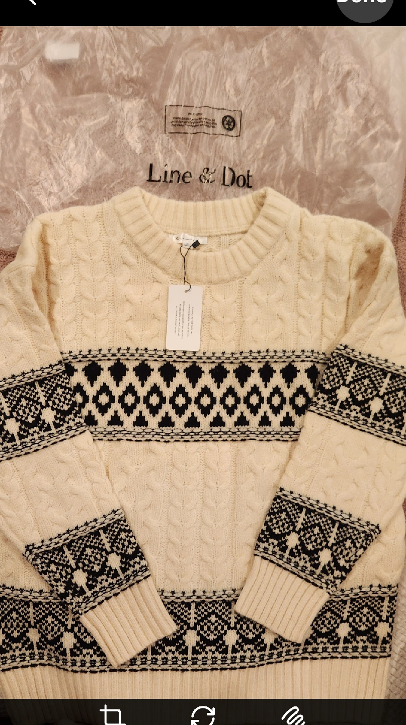 Here's a beautiful cream-colored knit sweater XL from Line & Dot! It features a lovely pattern and is perfect for staying cozy. The material is soft and comfortable, making it a great addition to your wardrobe for cooler weather.