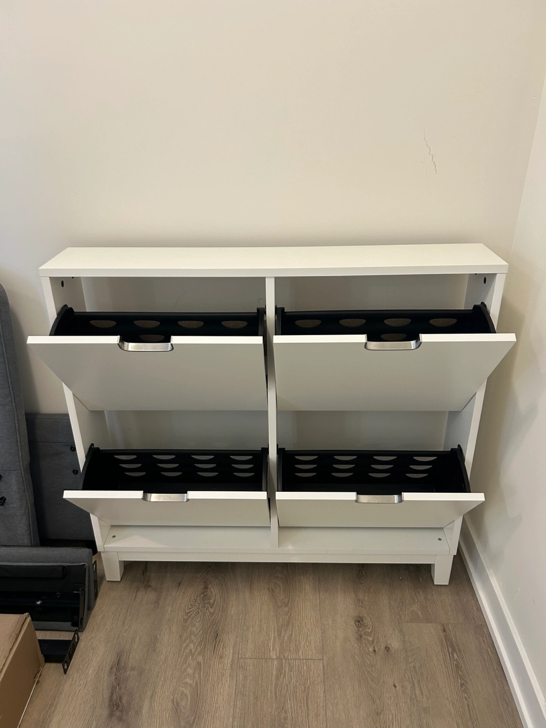 Selling a gently used IKEA shoe cabinet in white! It has four compartments, perfect for keeping your entryway tidy. Great for storing shoes or other items you want to keep out of sight. It's in excellent condition and ready for a new home! Needs to be drilled to a wall
