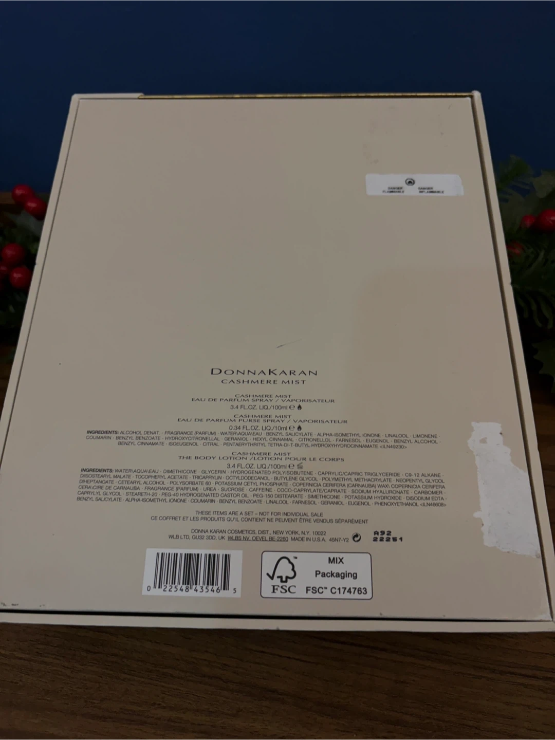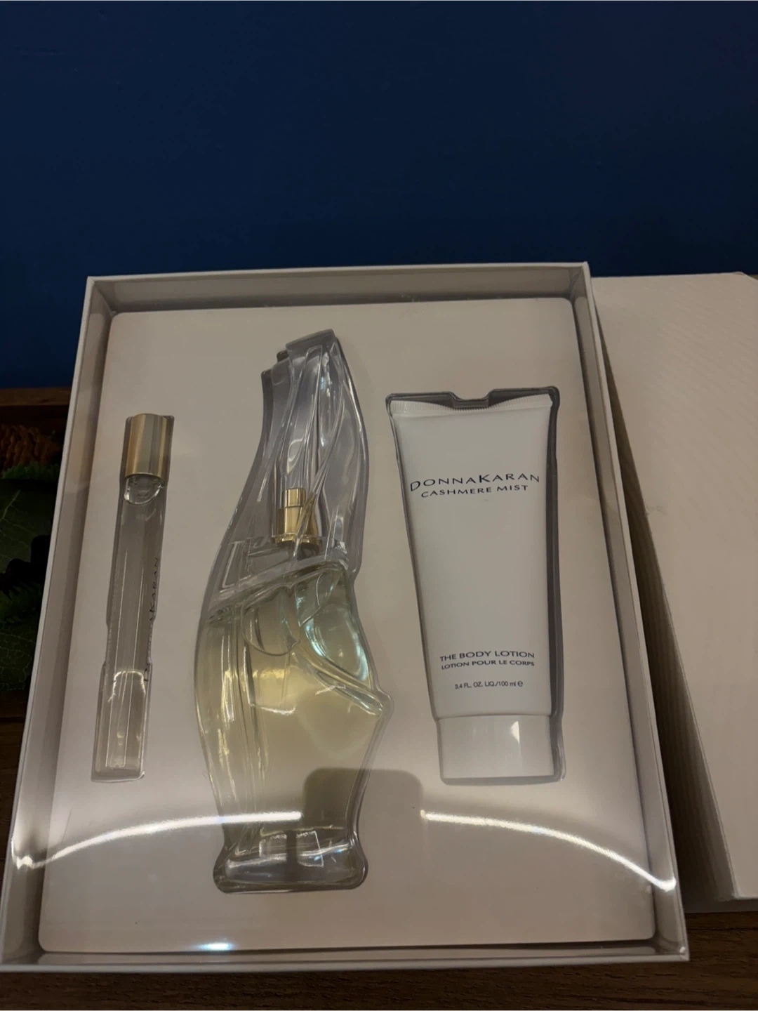Selling a Donna Karan Cashmere Mist gift set! It includes the perfume, body lotion, and a travel-size spray. The set comes with its original box