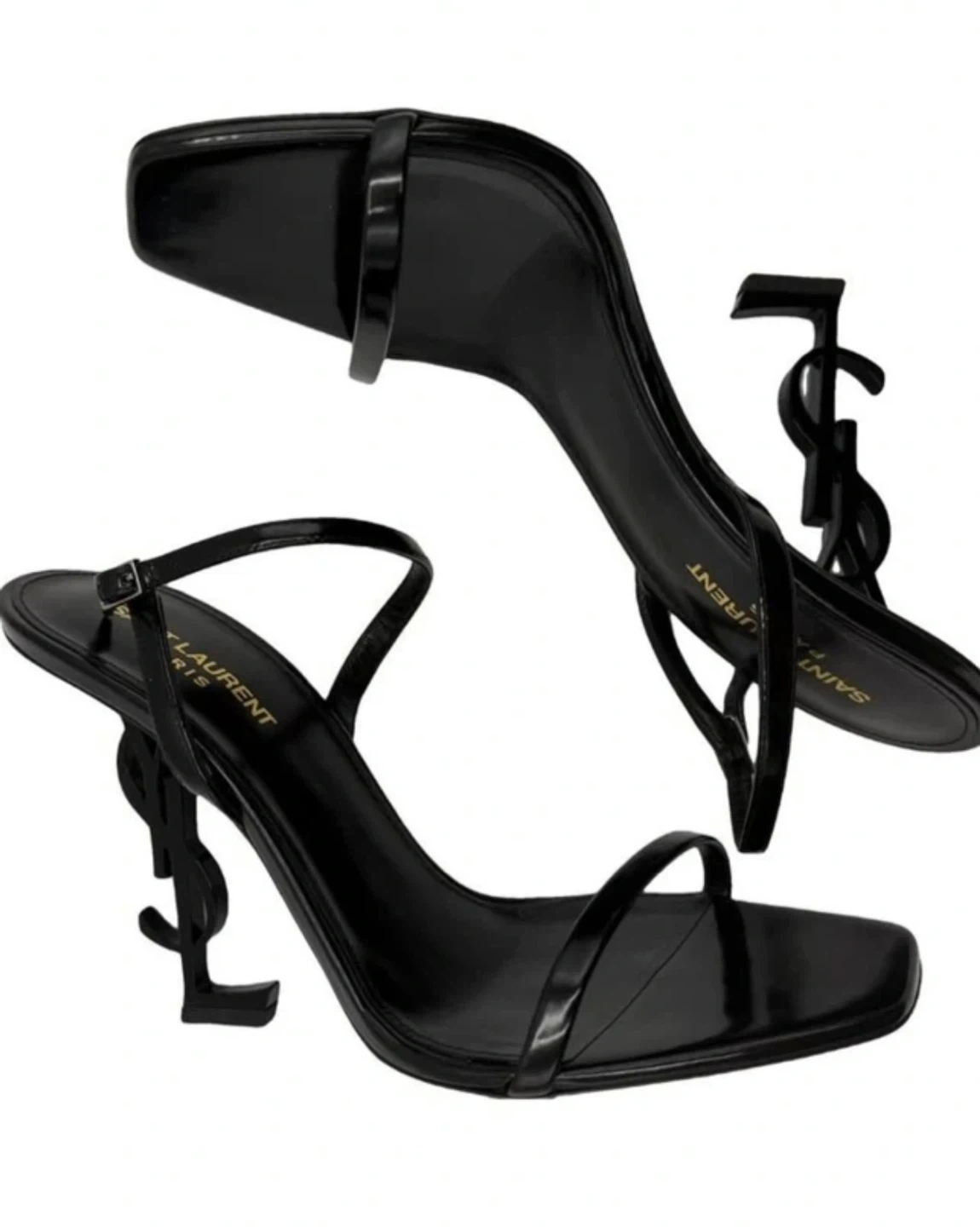 These stunning Saint Laurent sandals are crafted from glossy black patent leather. They feature a distinctive YSL logo heel and thin ankle strap. A statement piece for any wardrobe!