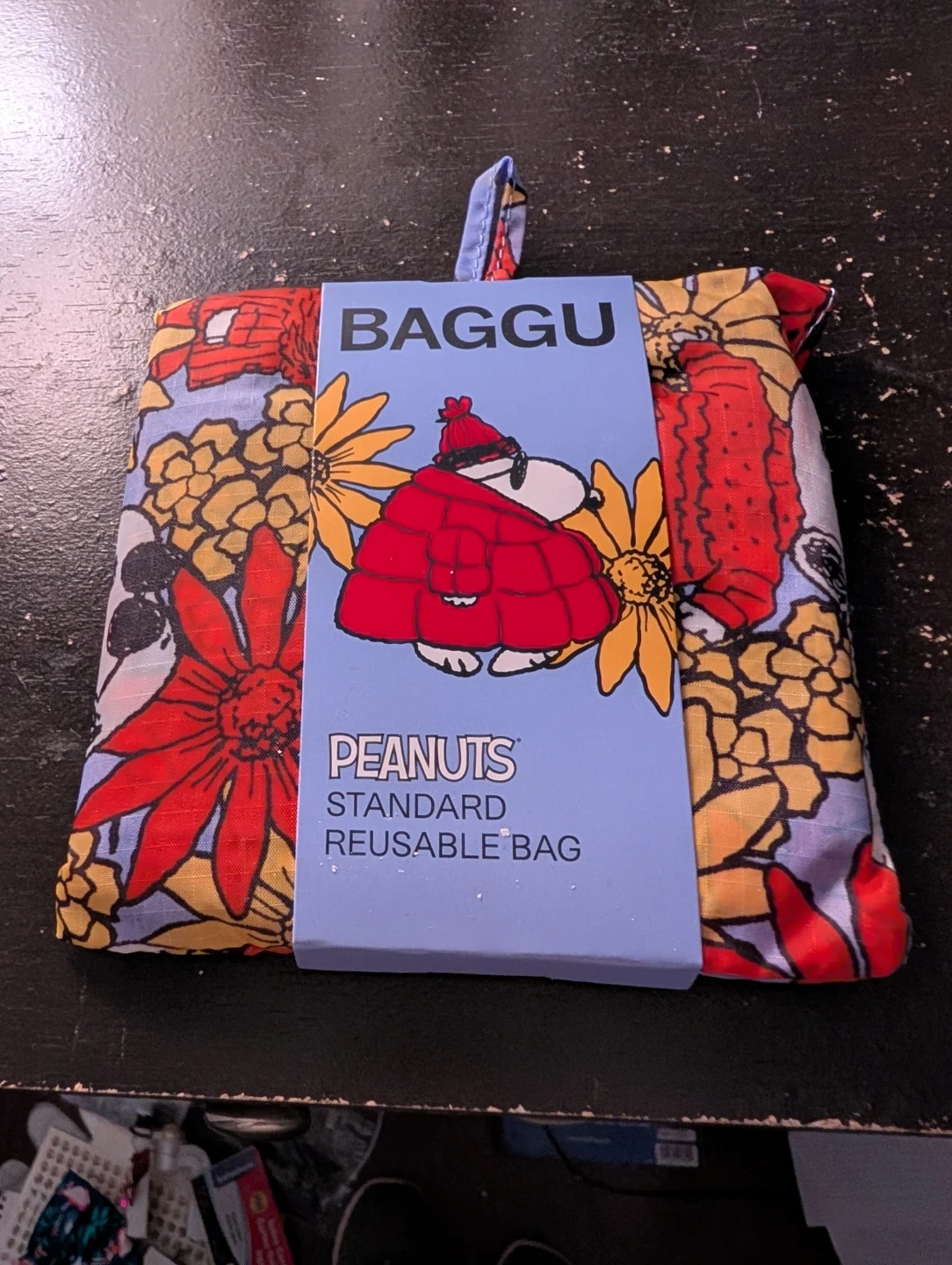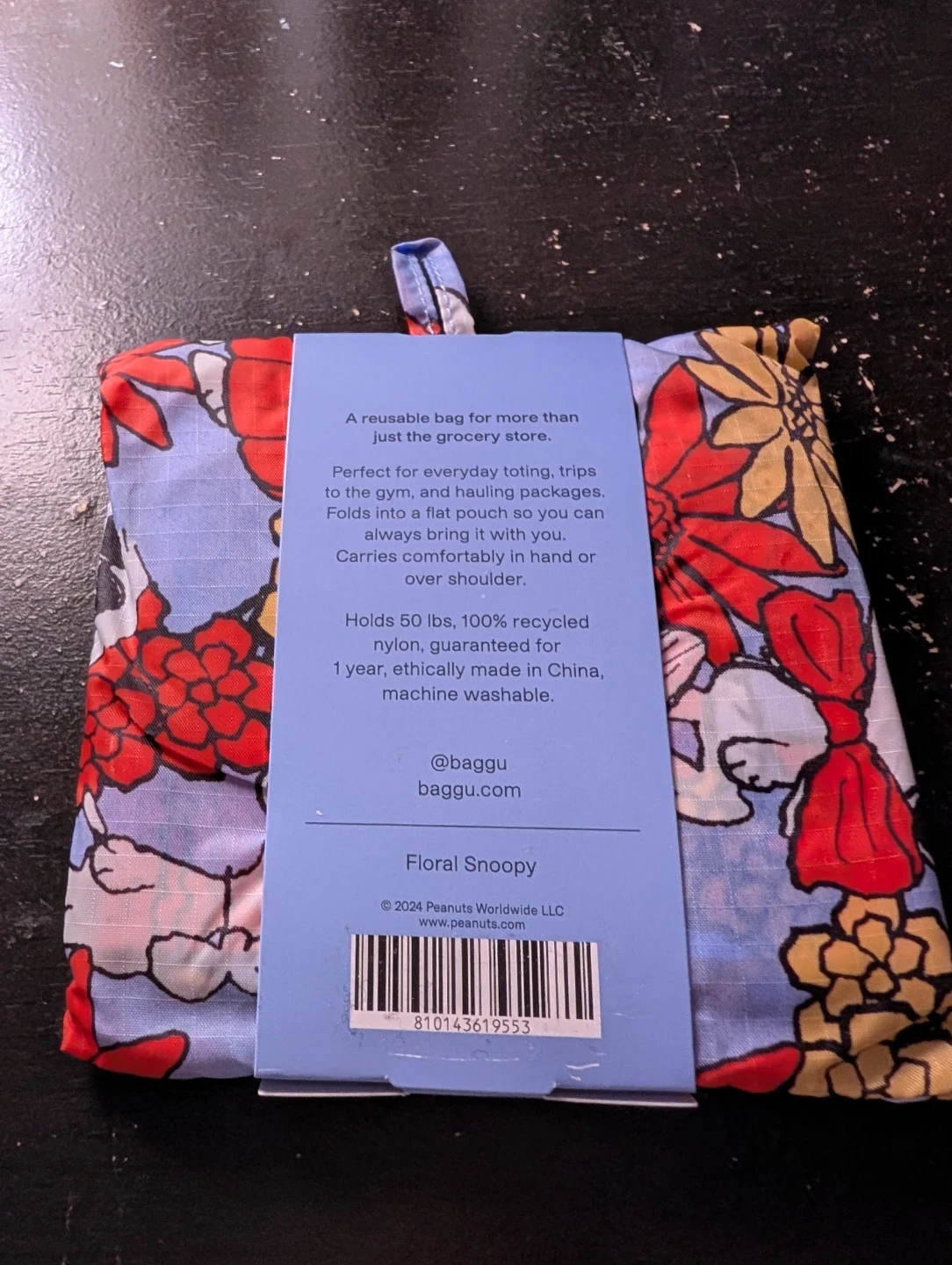 A reusable Baggu bag featuring a Floral Snoopy design. It holds 50 lbs and is made from 100% recycled nylon. This bag folds into a flat pouch for easy carrying. It's ethically made in China and machine washable.