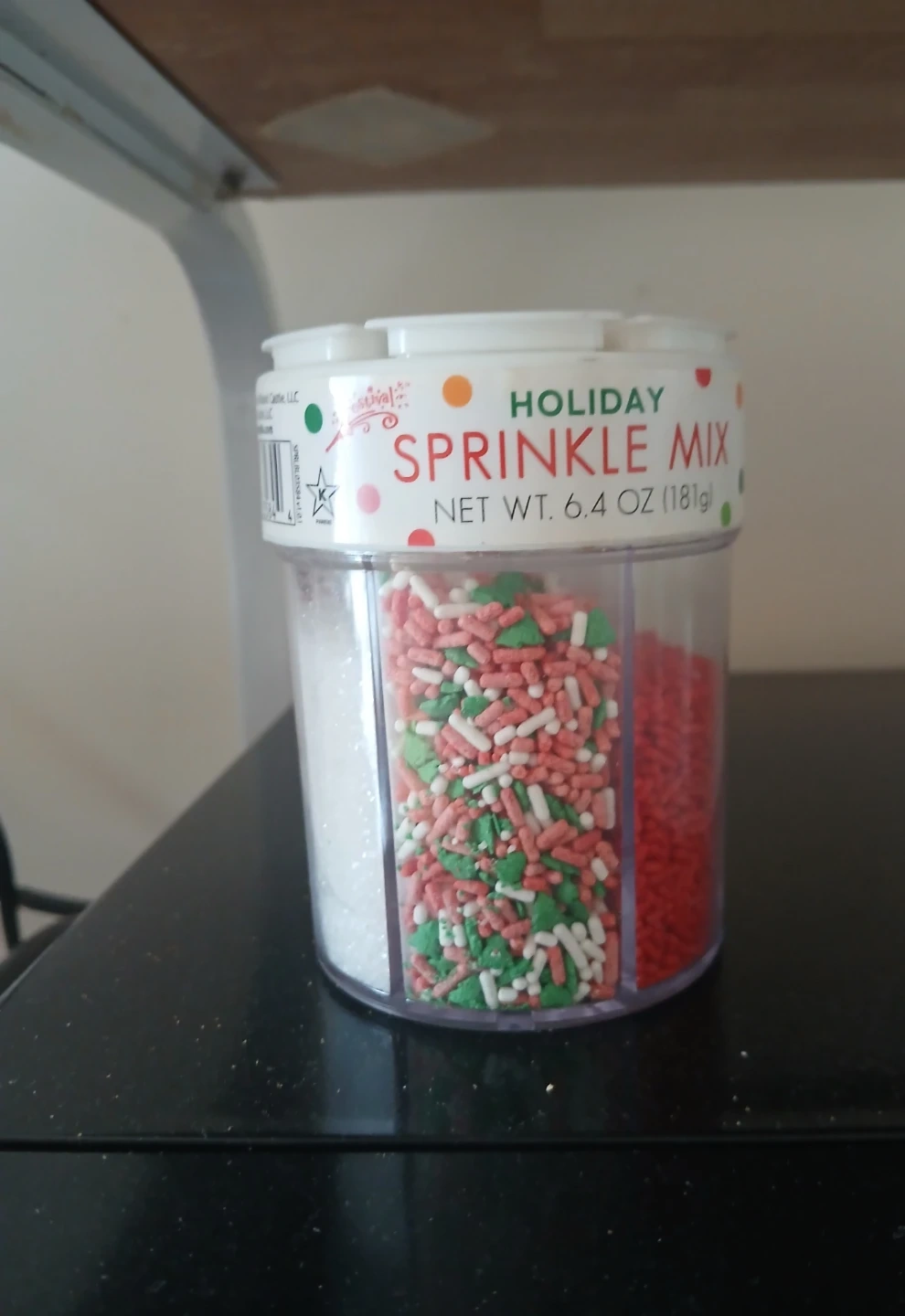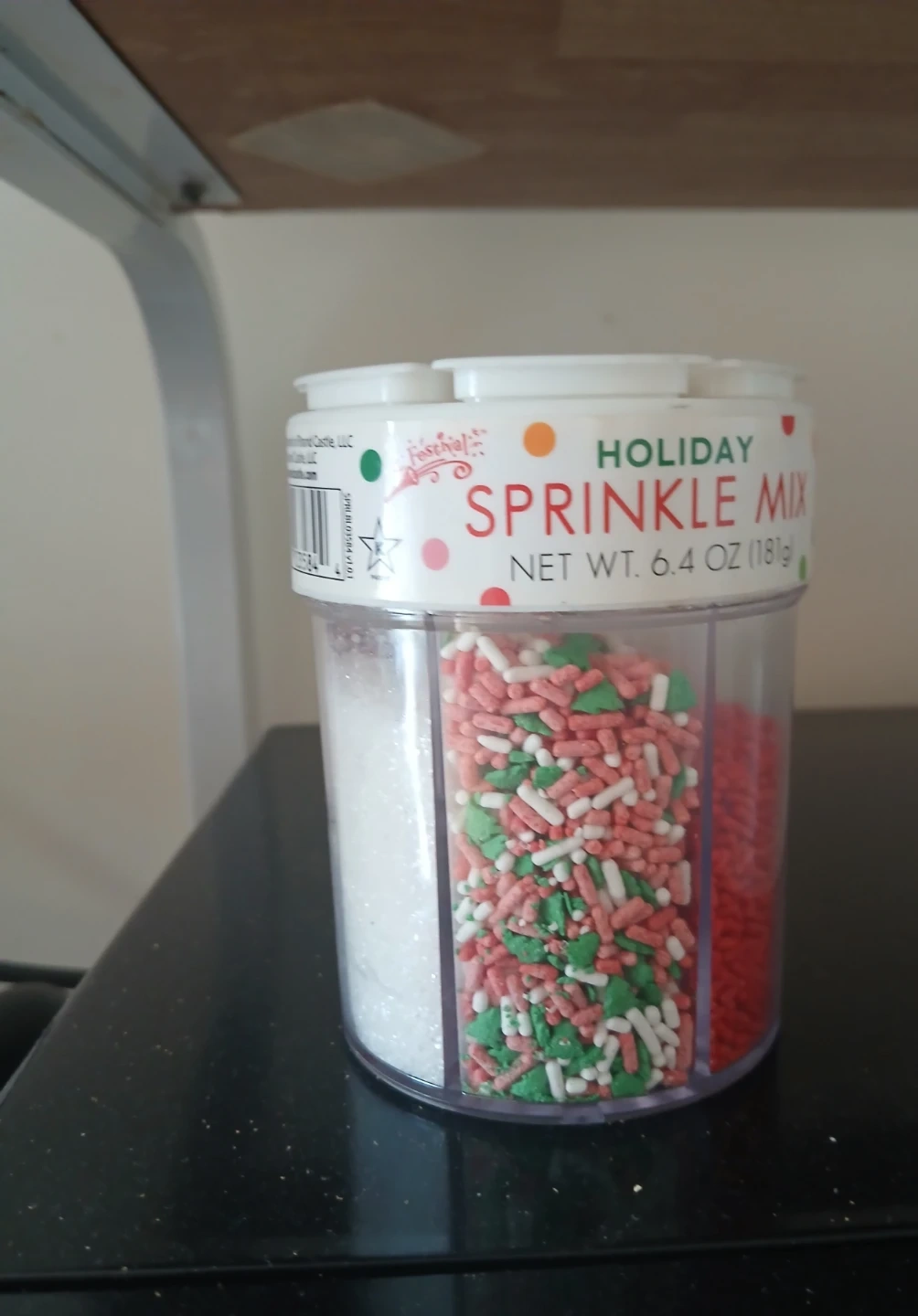 Festive sprinkle mix for holiday baking and decorating. It contains red, green, and white sprinkles. Net weight is 6.4 oz (181g).