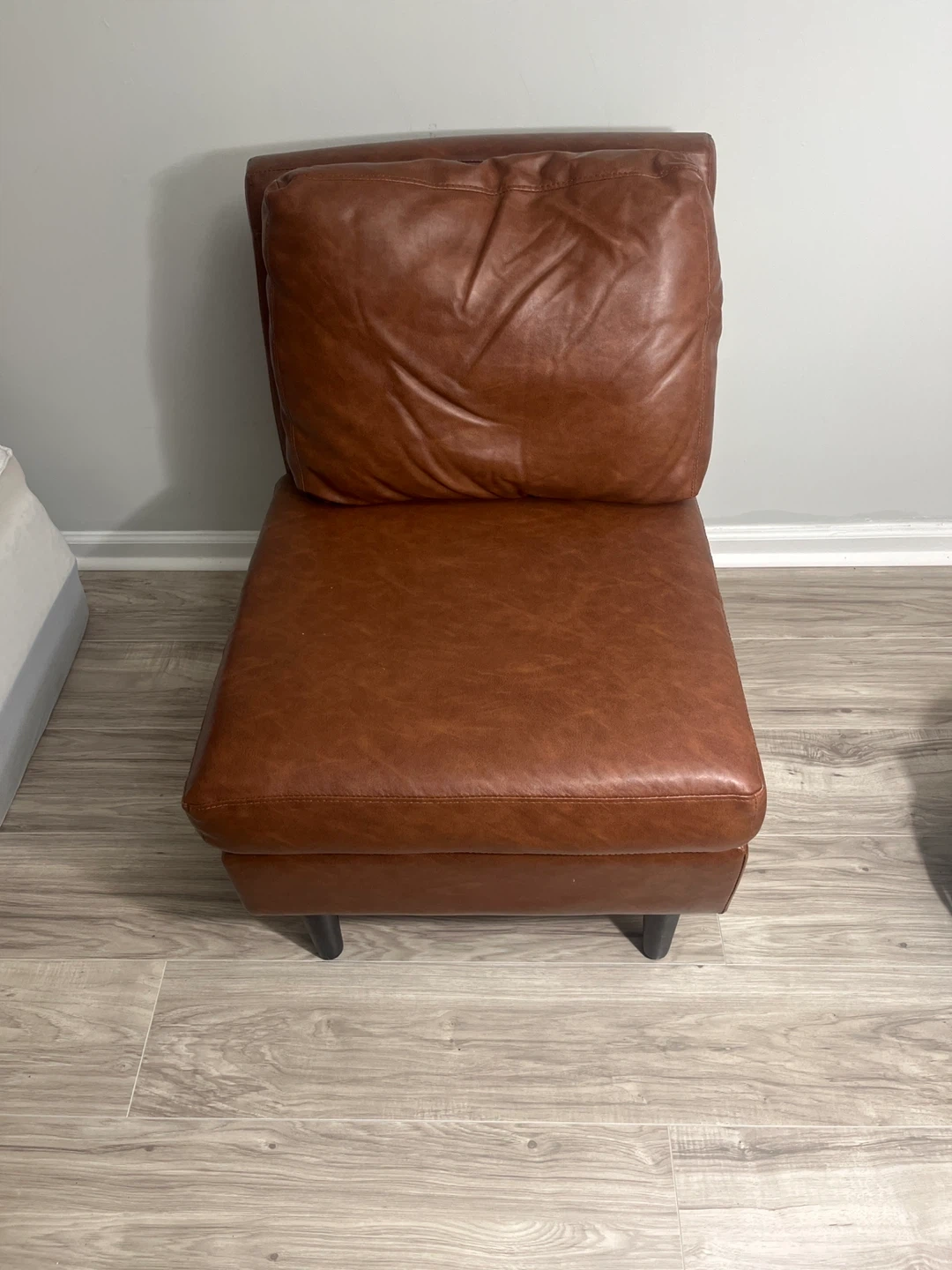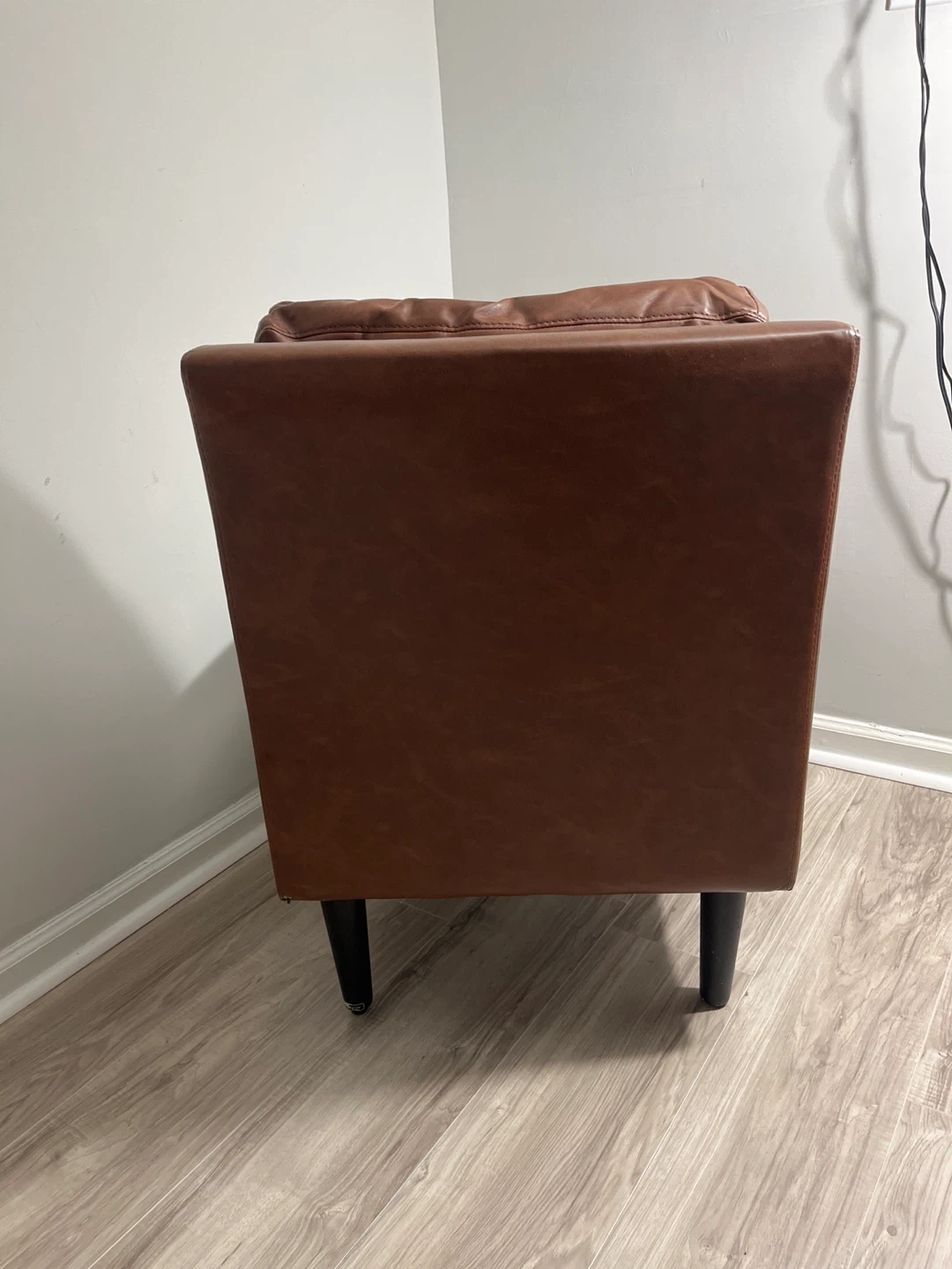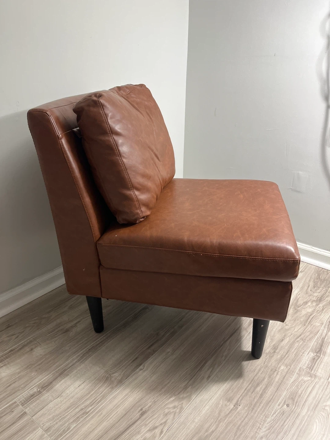 Brown faux leather armless accent chair with a plush accent pillow. Simple black legs support the seat. Its compact design makes it a great addition to any room.