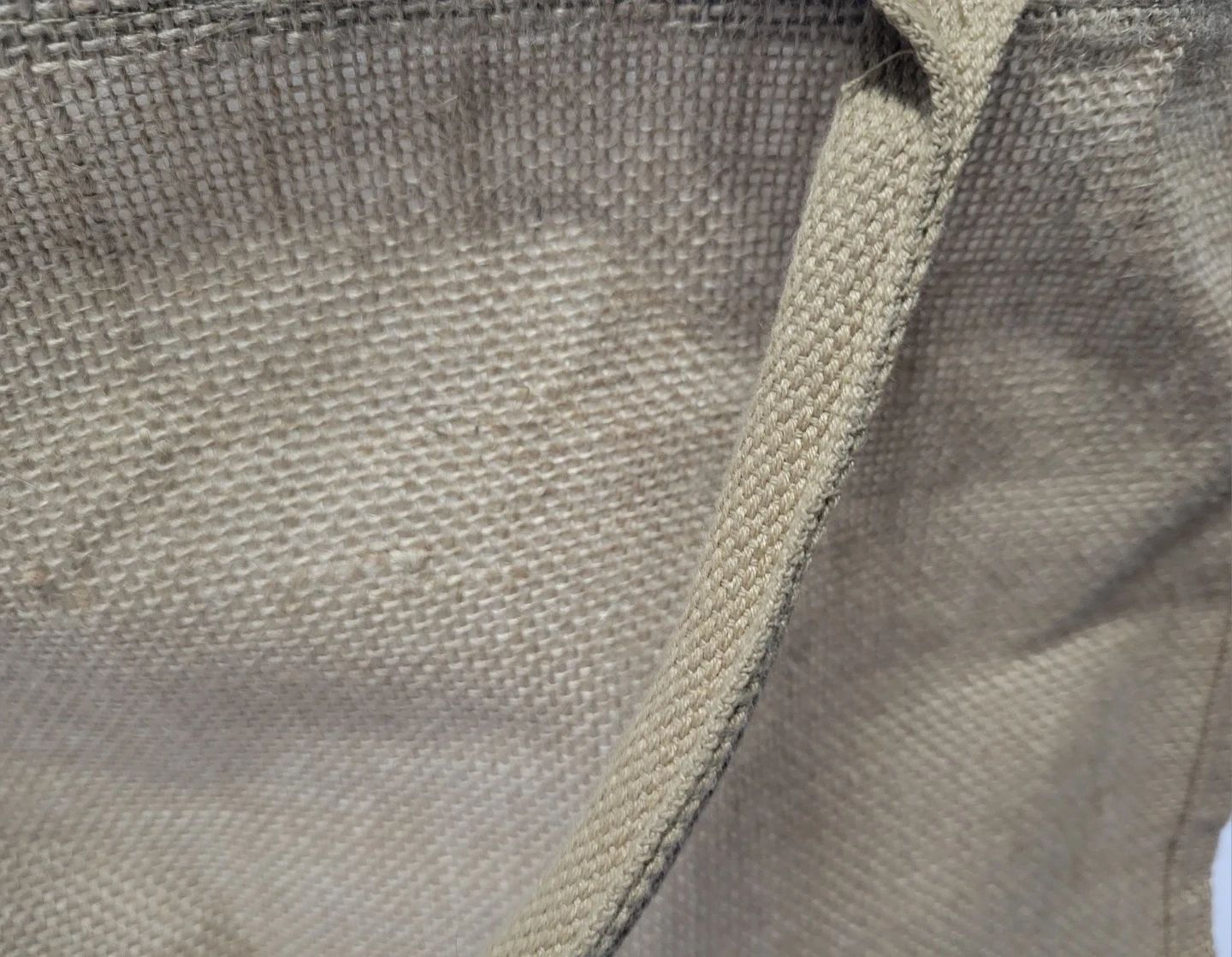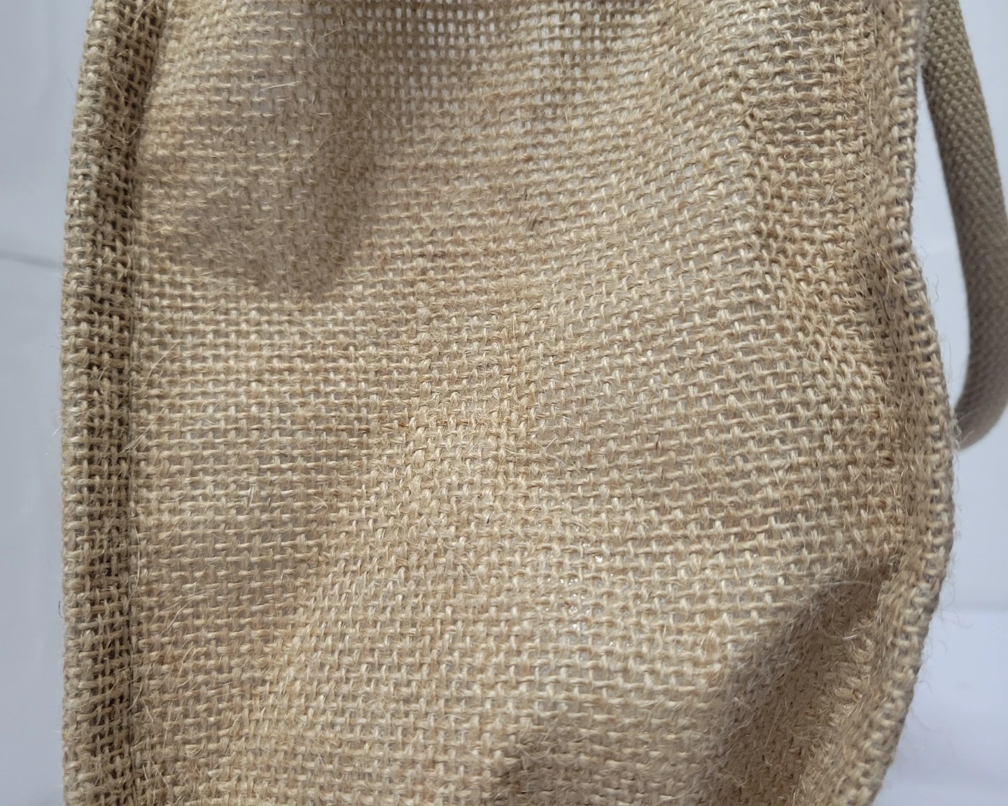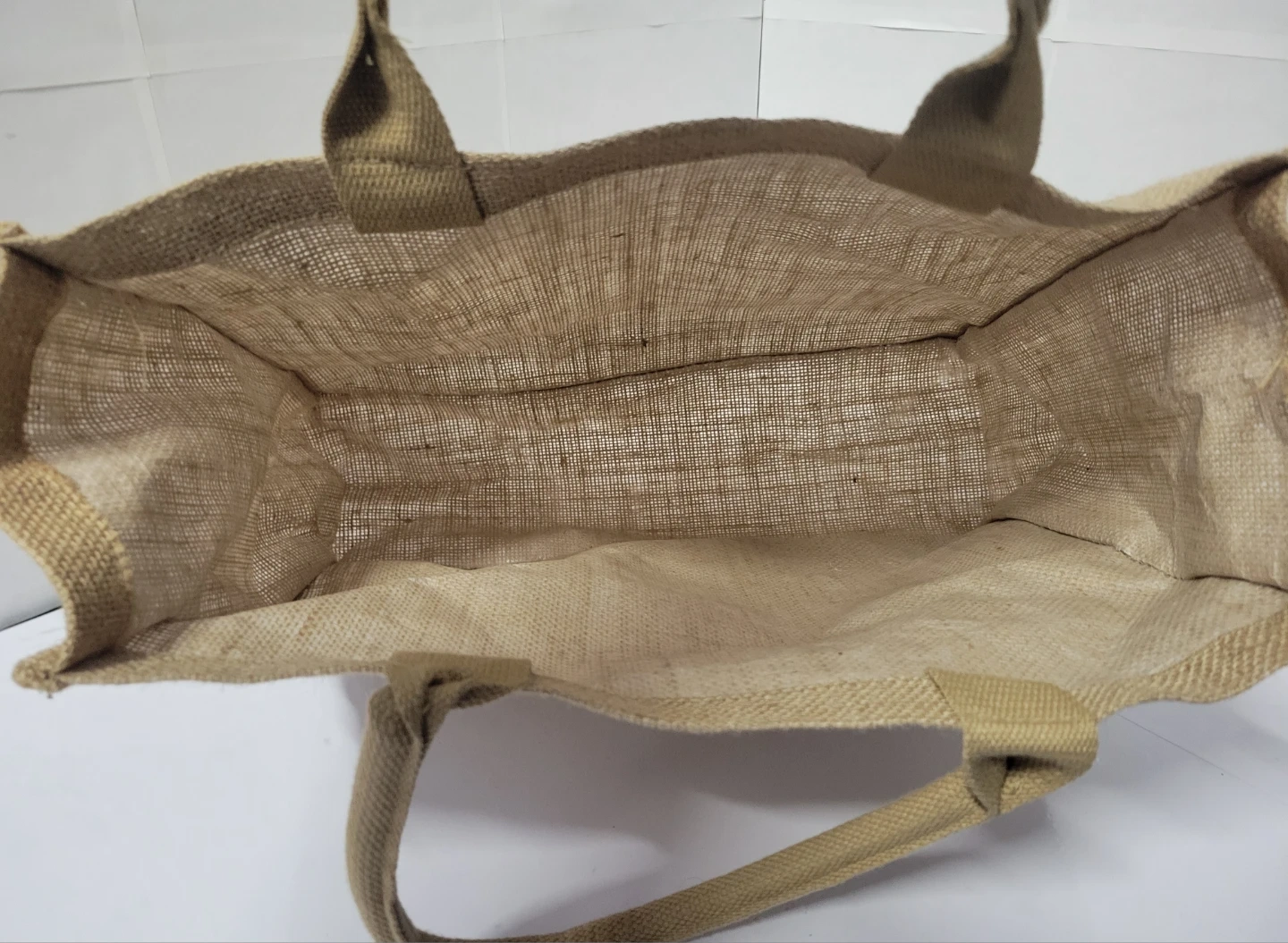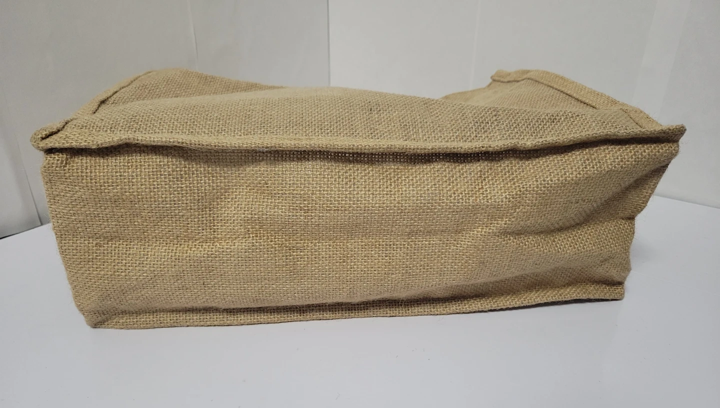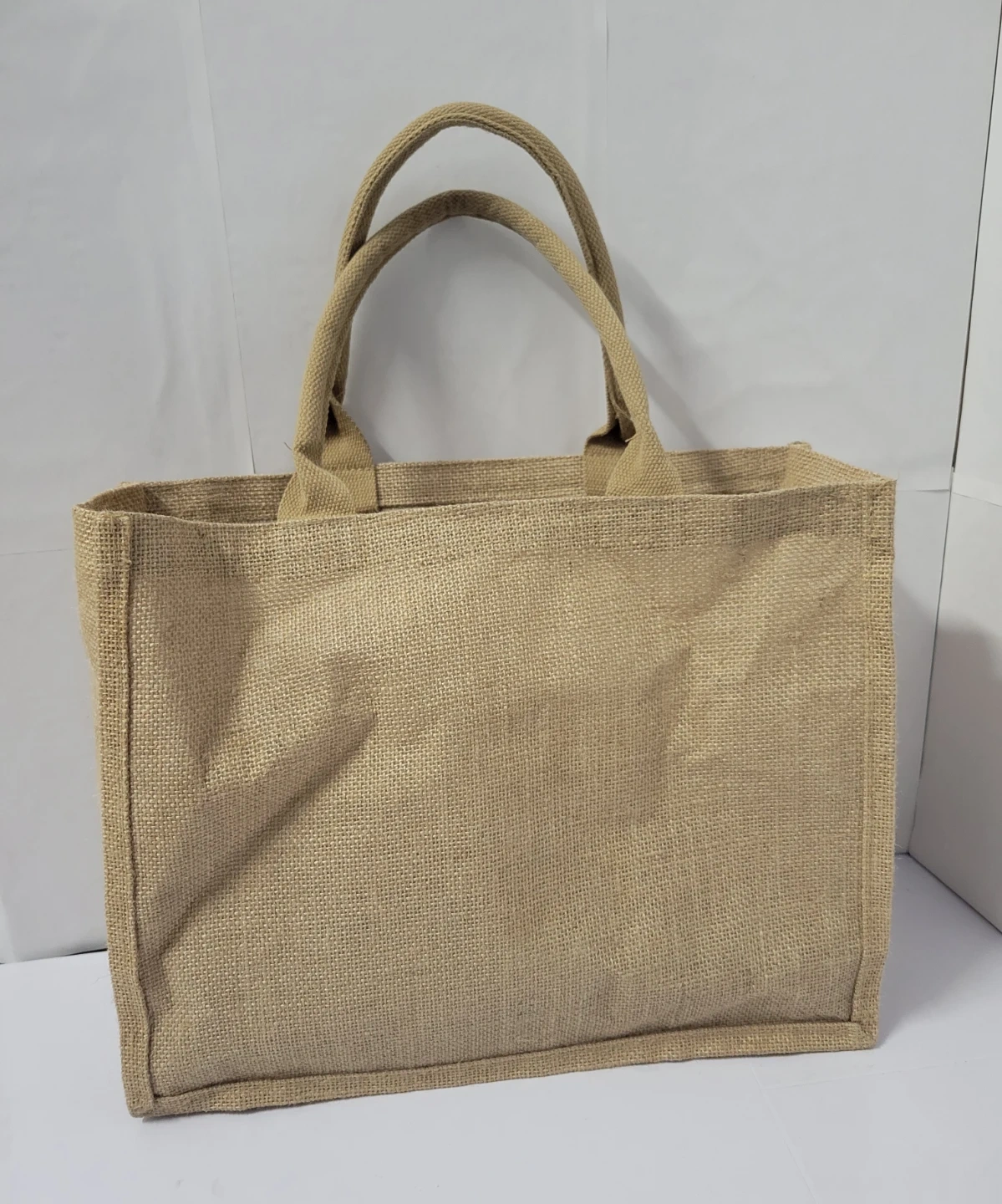 This is a sturdy tote bag made from natural jute material. It features reinforced handles and a wide opening for easy access. The bag's construction makes it suitable for everyday use.