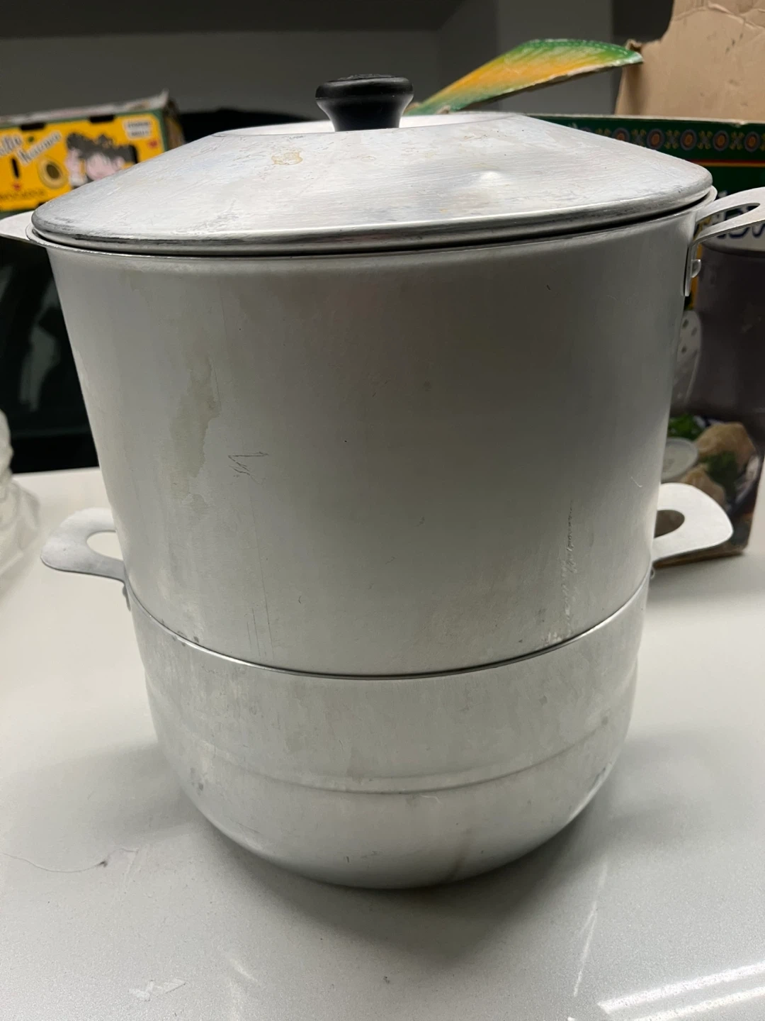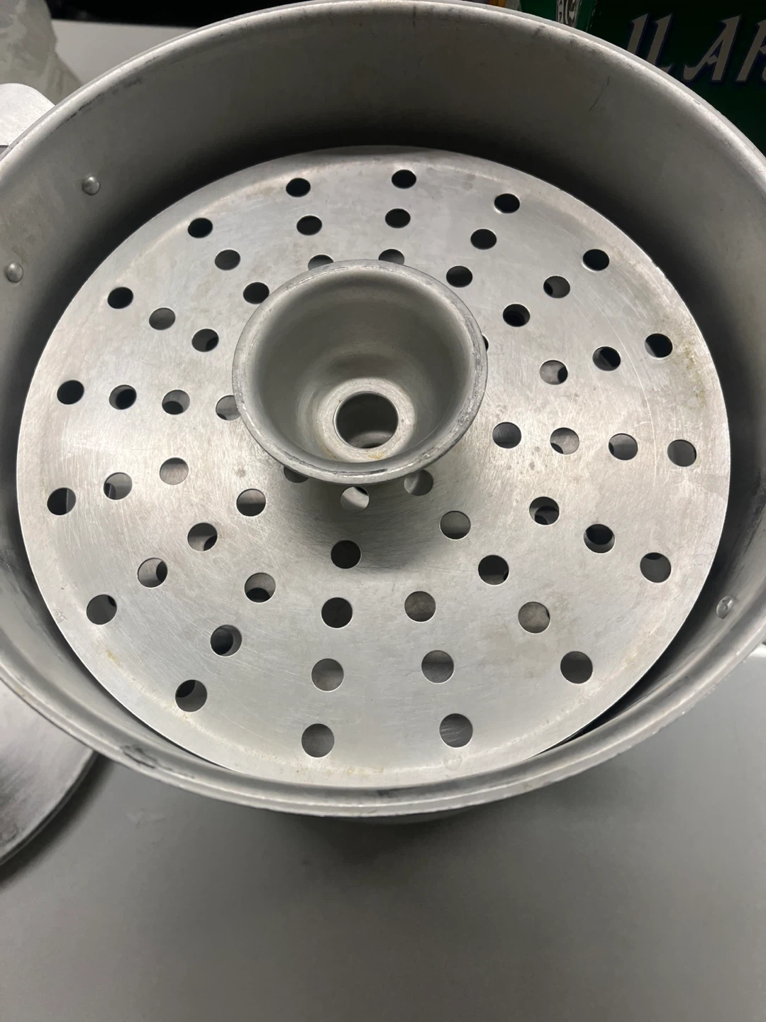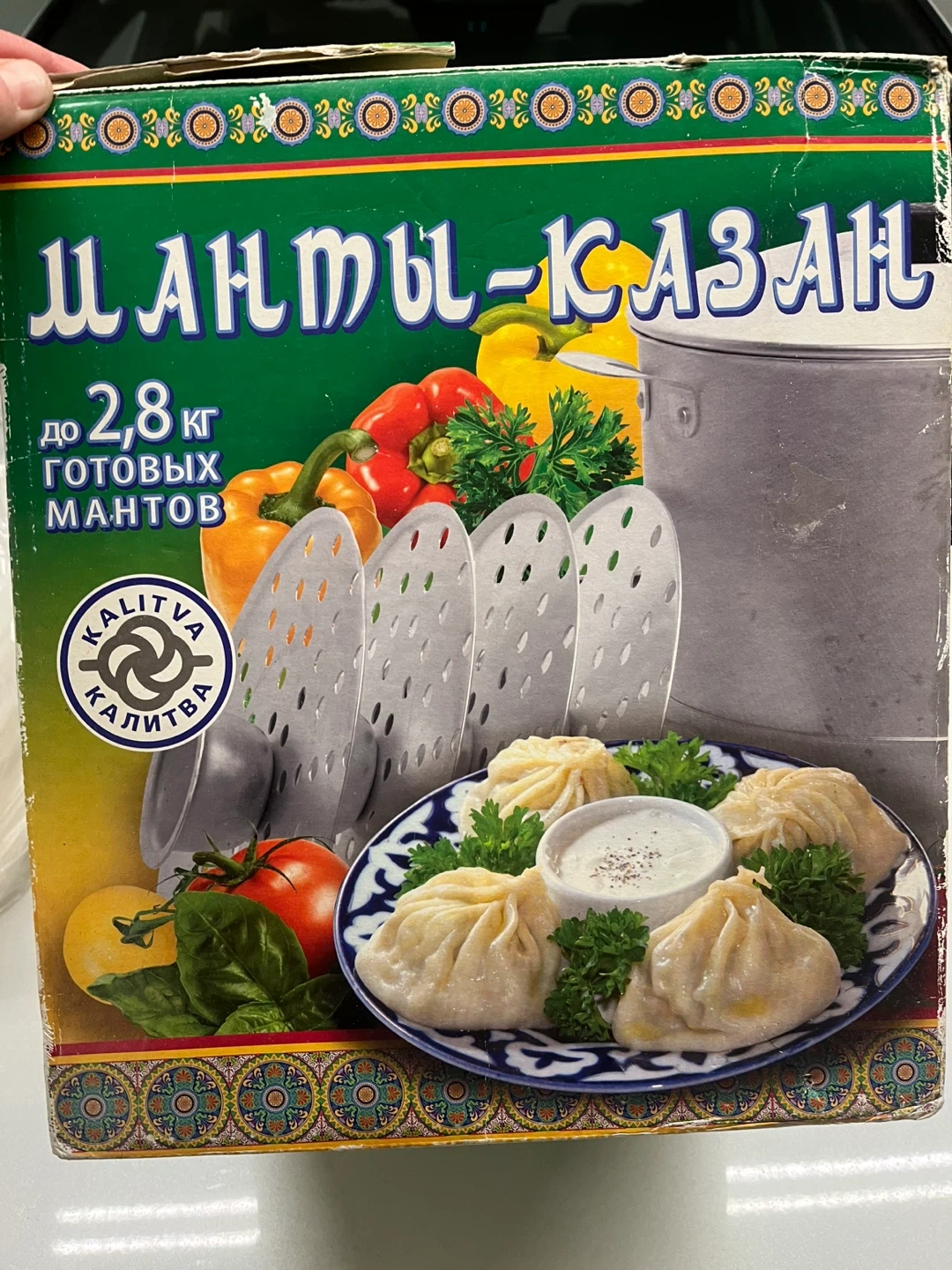 This Manty Kazan steamer pot is made of aluminium. It can hold up to 2.8 kg of manty. It's designed for steaming dumplings.
