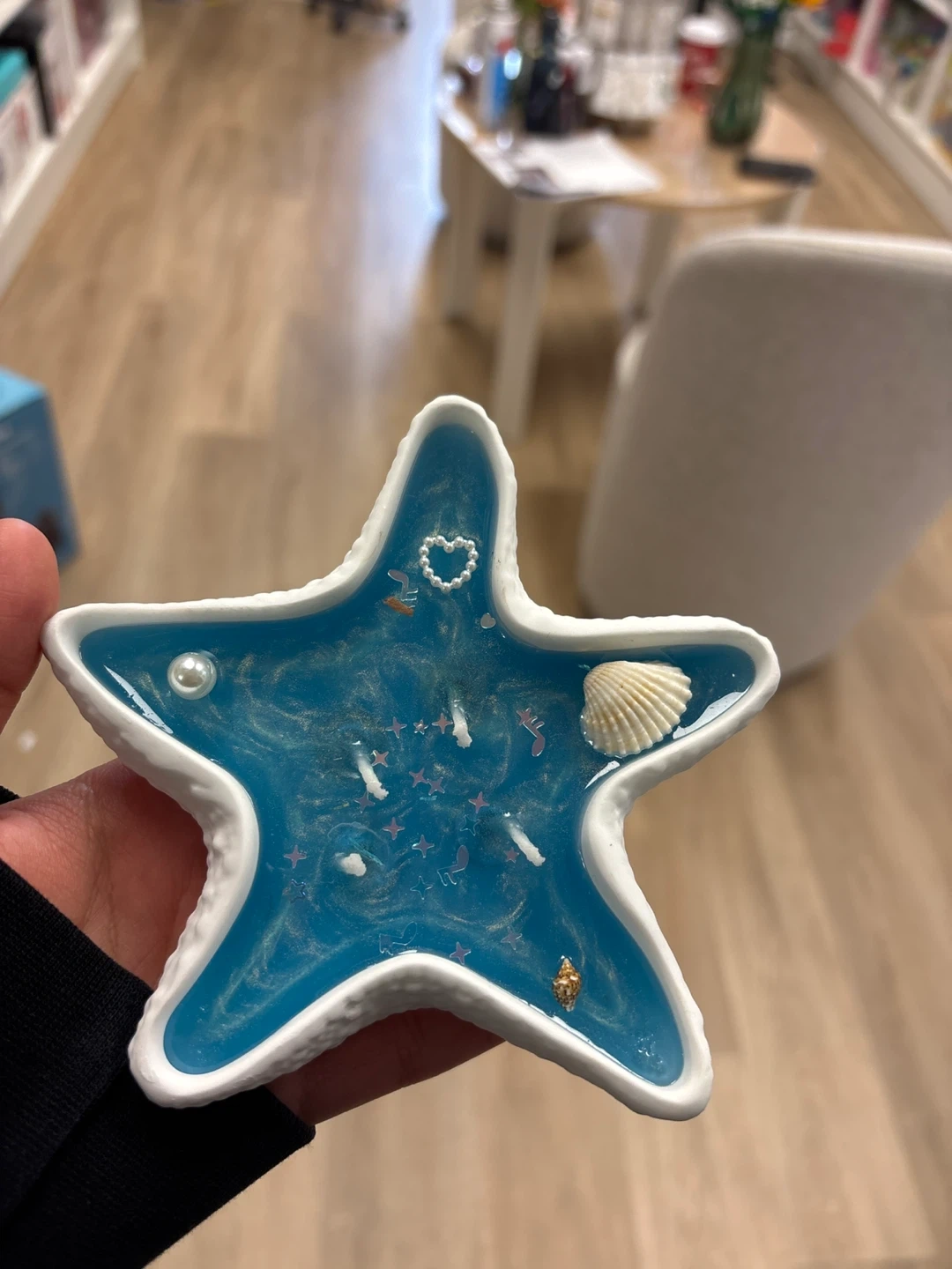 This is a unique, handmade trinket dish shaped like a starfish. It's decorated with a blue resin ocean scene, complete with tiny shells.