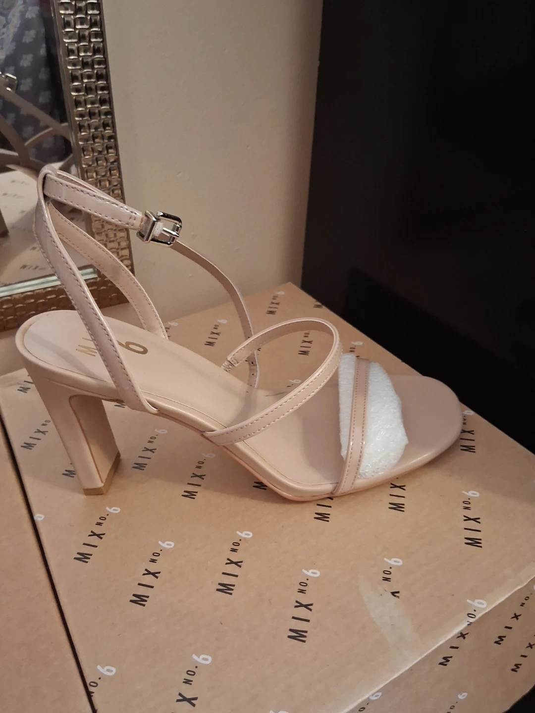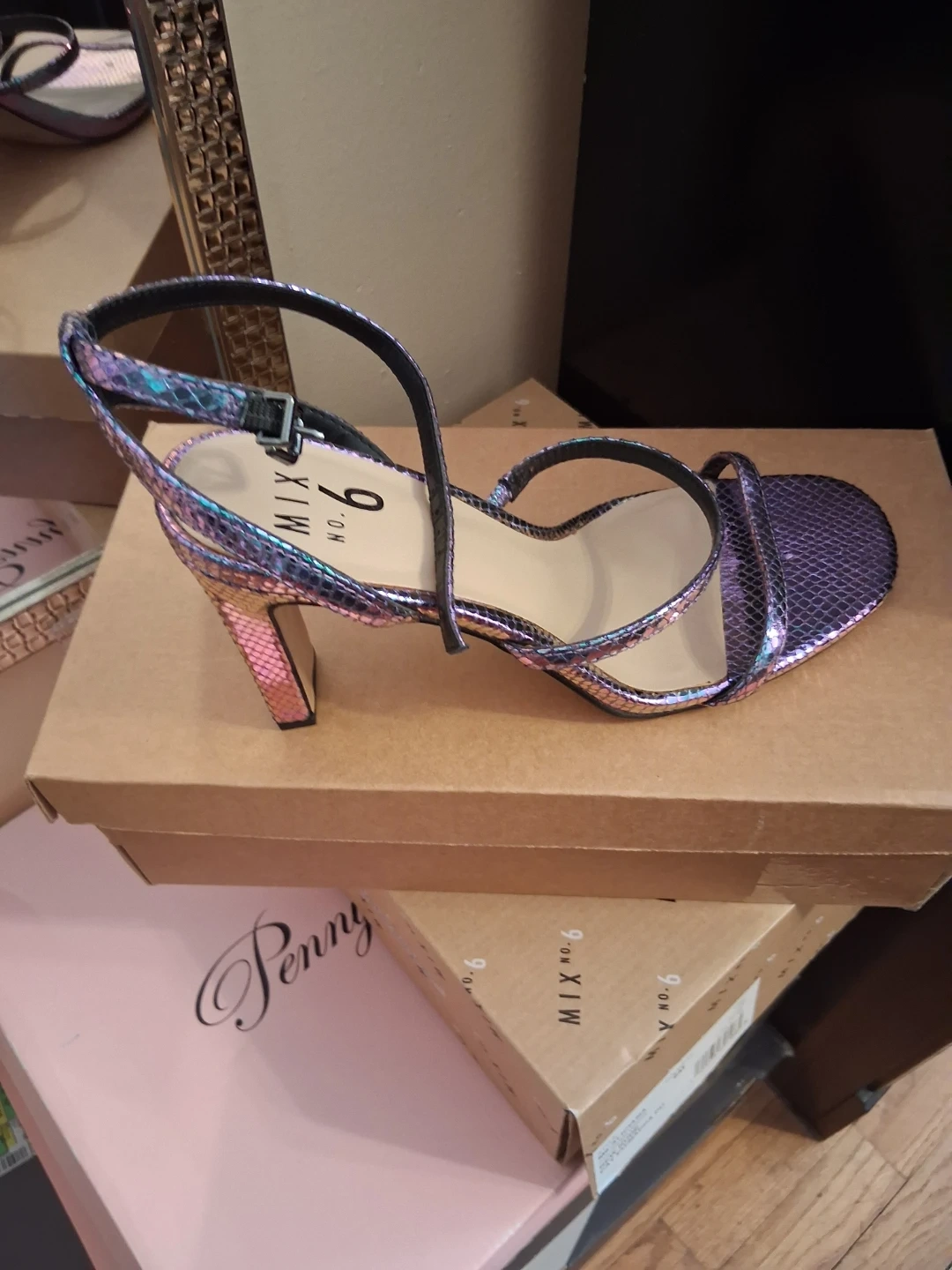 These are stylish MIX. NO. 6 heeled sandals. They feature a multi-strap design with an ankle buckle closure. Available in a shimmering iridescent purple and a classic nude.