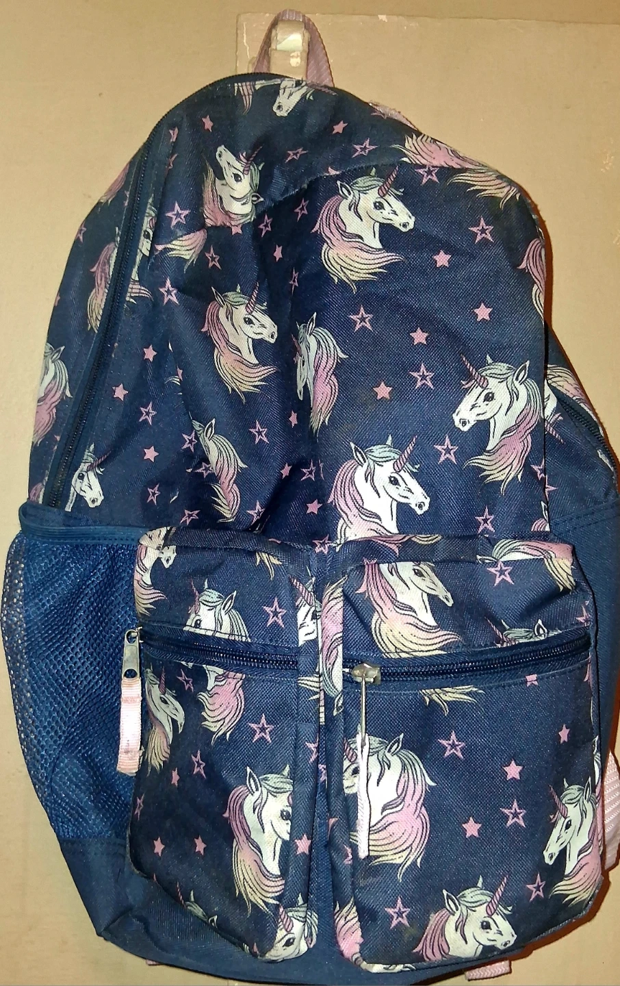 This cute navy blue backpack features a fun unicorn and star pattern. It has a main zippered compartment, a front zippered pocket, and a mesh side pocket. Adjustable padded shoulder straps for comfort. Perfect for school or daycare! Pick up only unless near intersection of Oxford and Gammage Street.