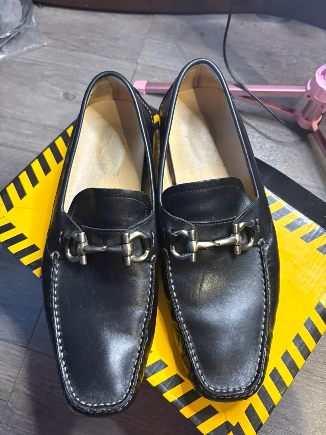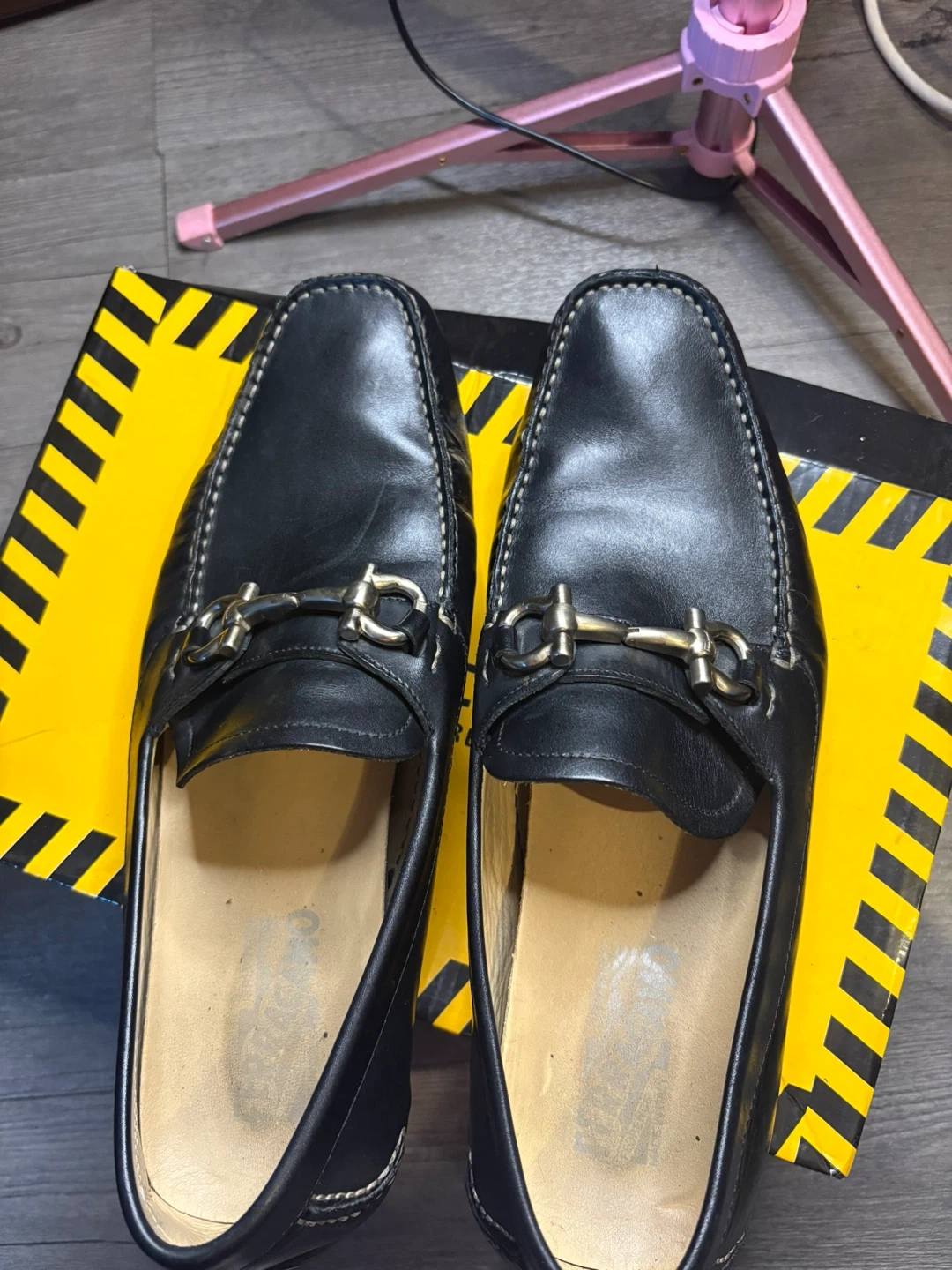 Selling a pair of Salvatore Ferragamo black leather loafers. They're in great condition and ready for a new home! The sleek design and quality craftsmanship make them a stylish addition to any wardrobe