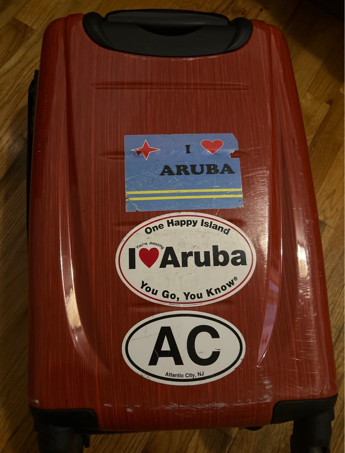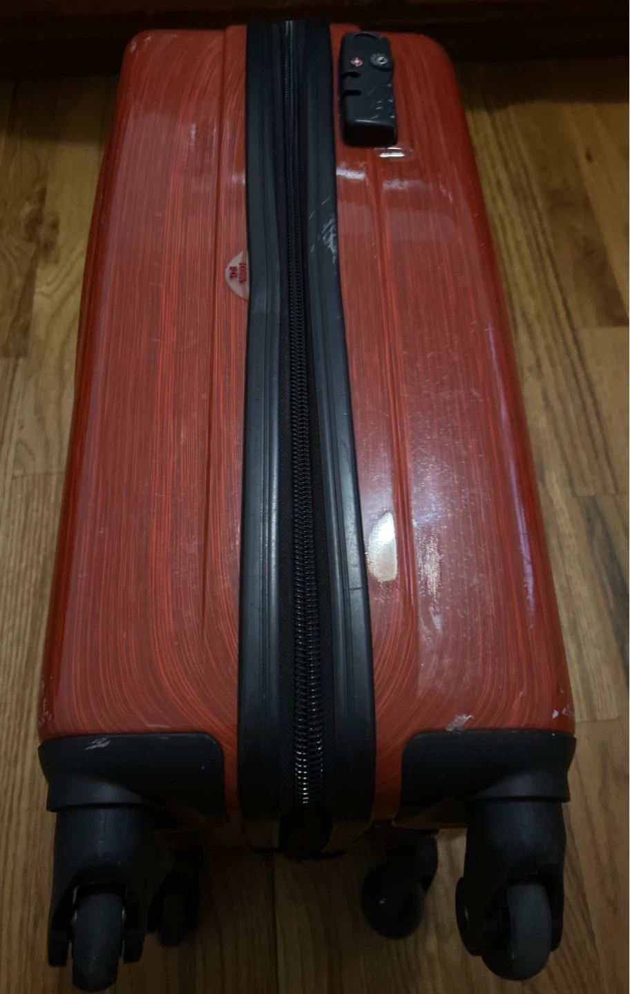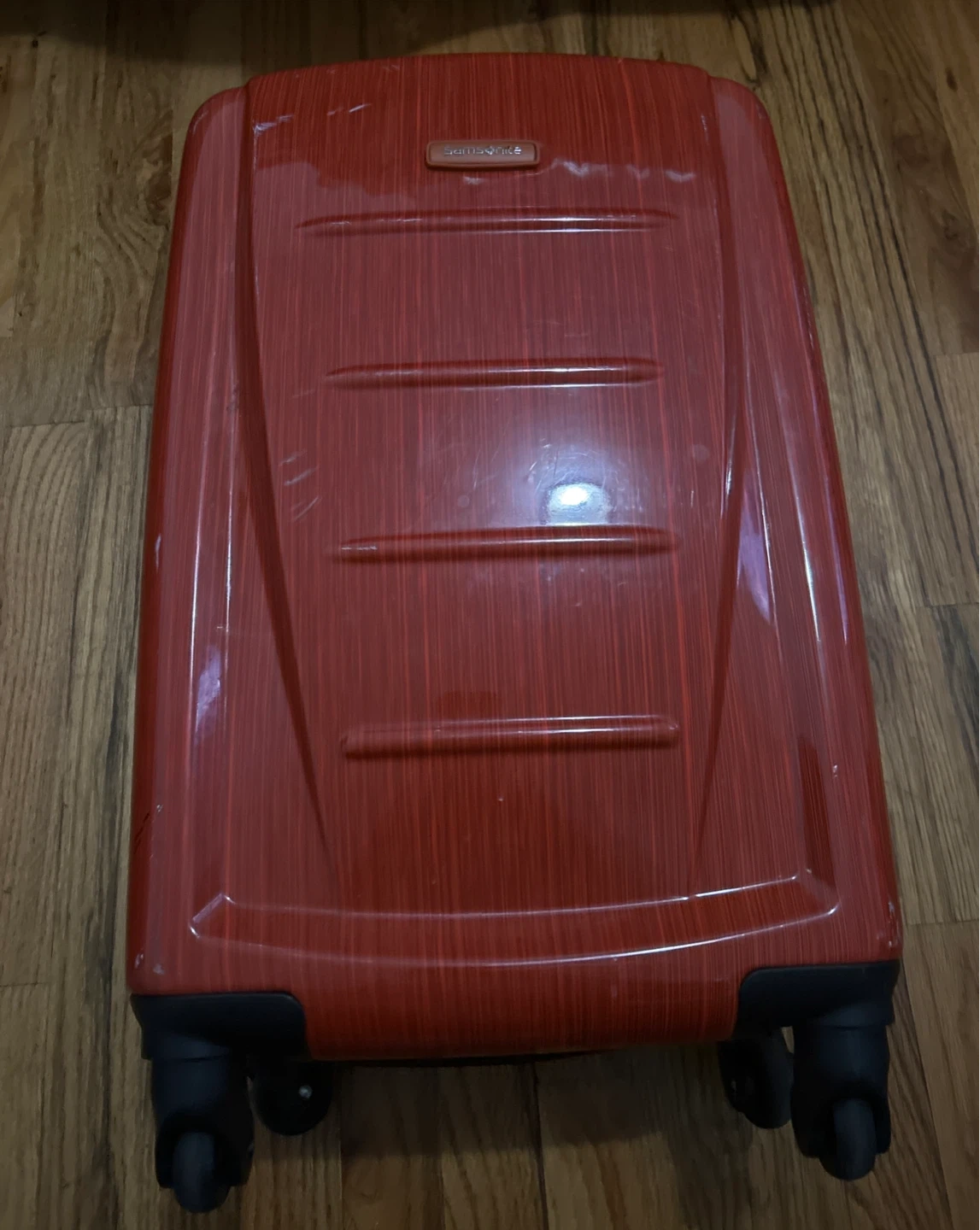 Samsonite hard sided carry-on luggage in orange. Pull out handle works fine, does have a few outer scuffs and a stain on the extra zippered compartment (from a body oil). Still in great shape, has stickers stuck on the back that you can remove.