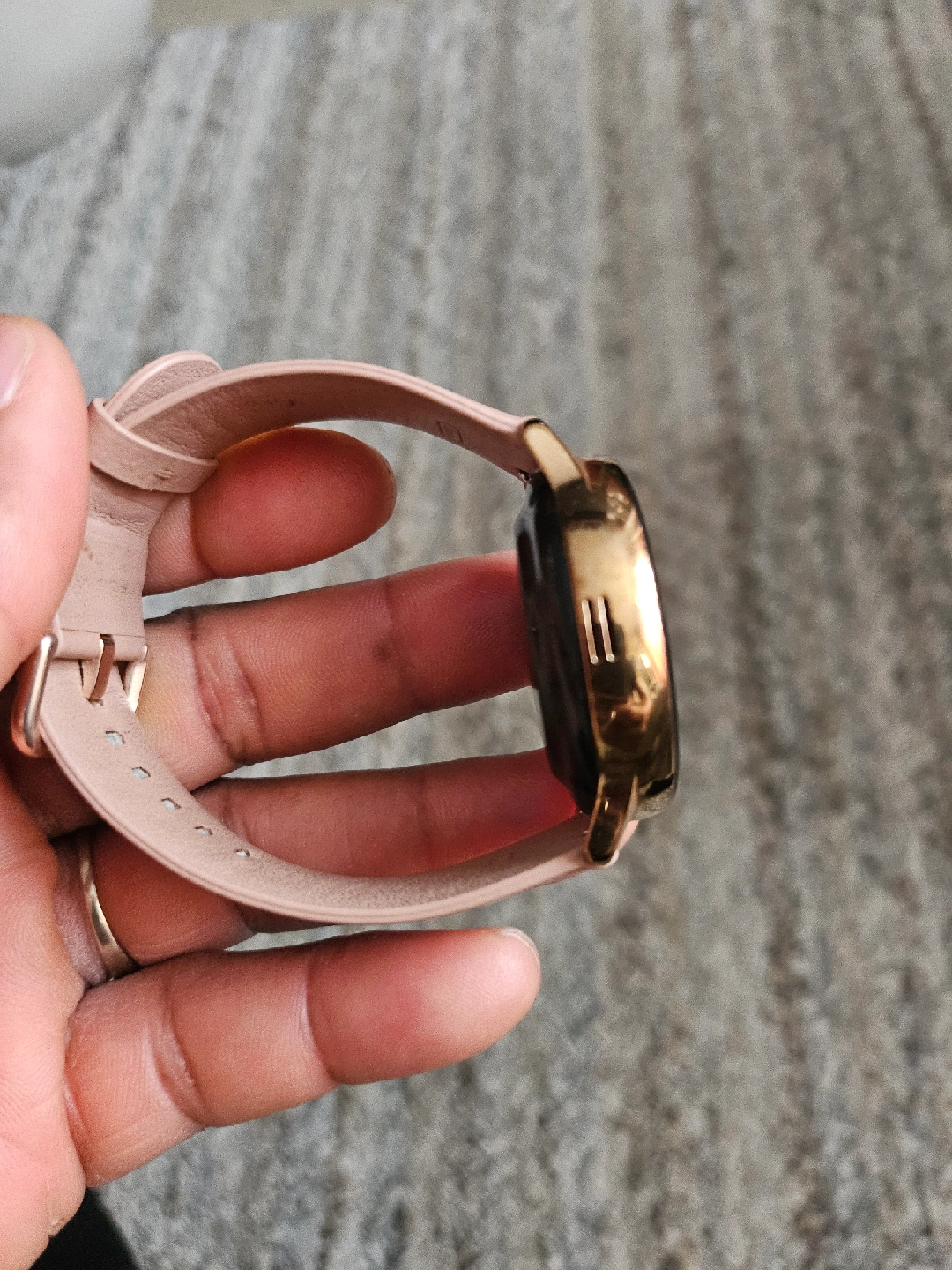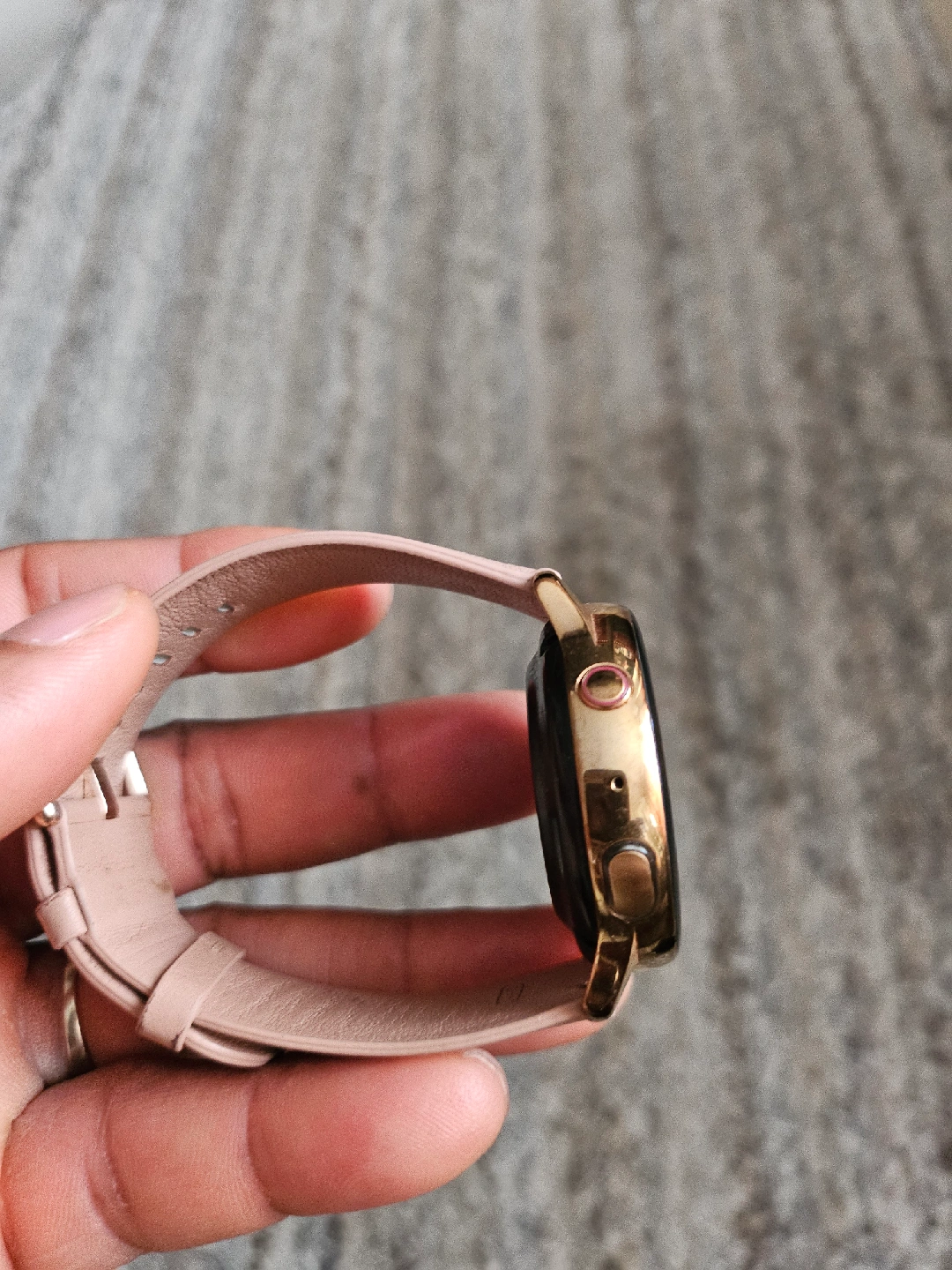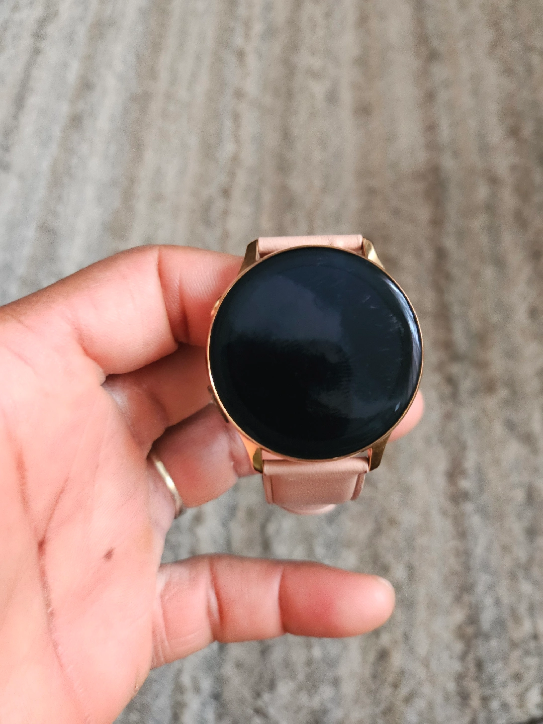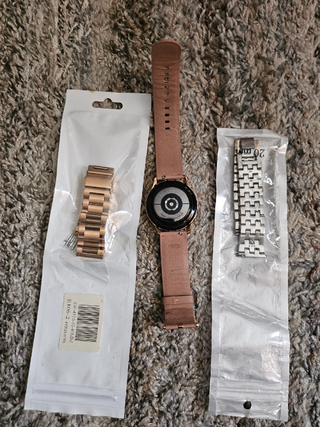 Selling a Samsung Galaxy Watch Active 2 in gold! It comes with a pink leather band and two additional 20mm bands, one gold and one silver. Great for switching up your style!