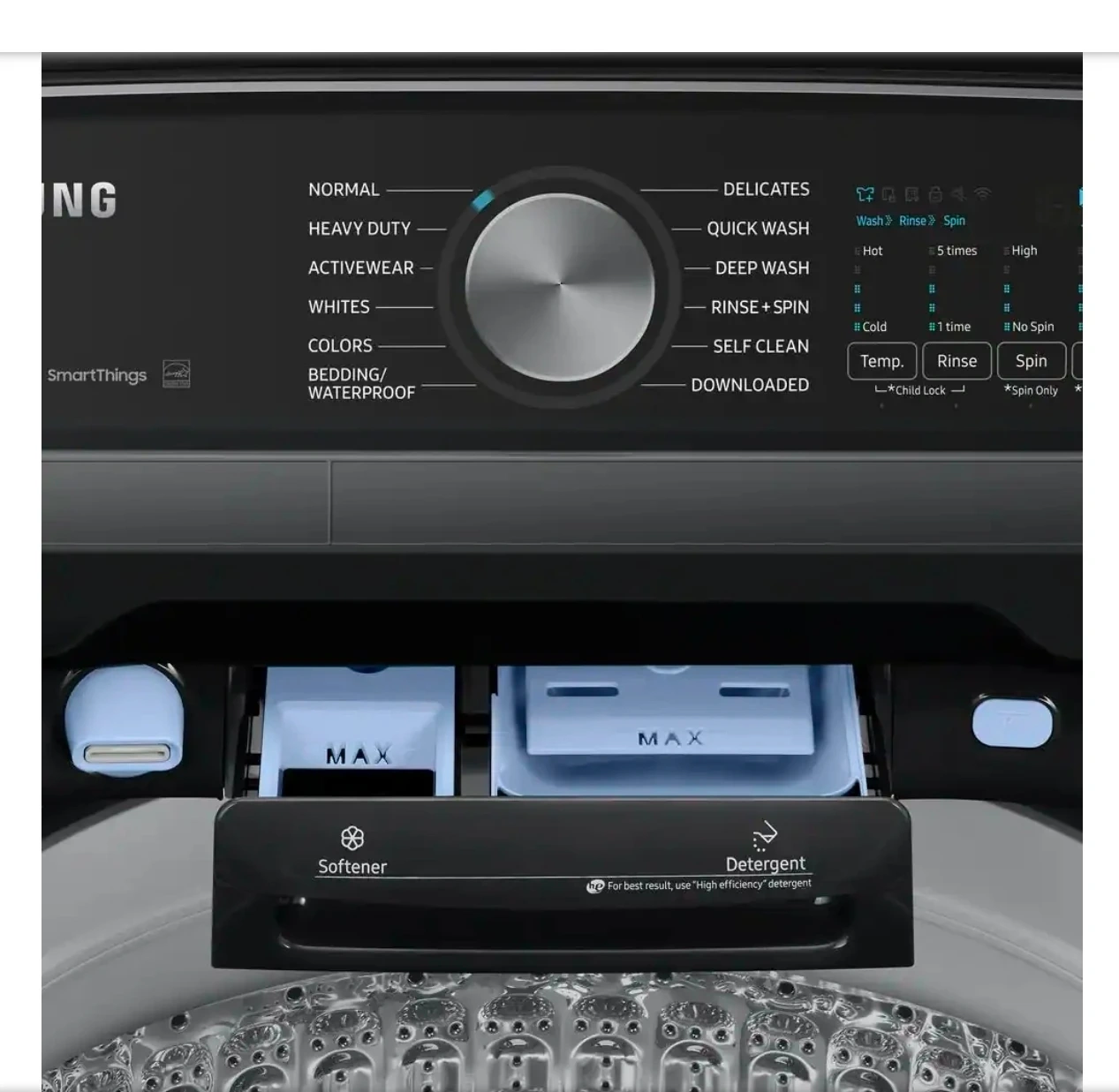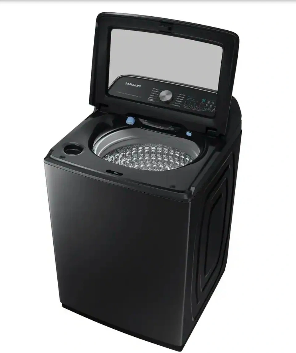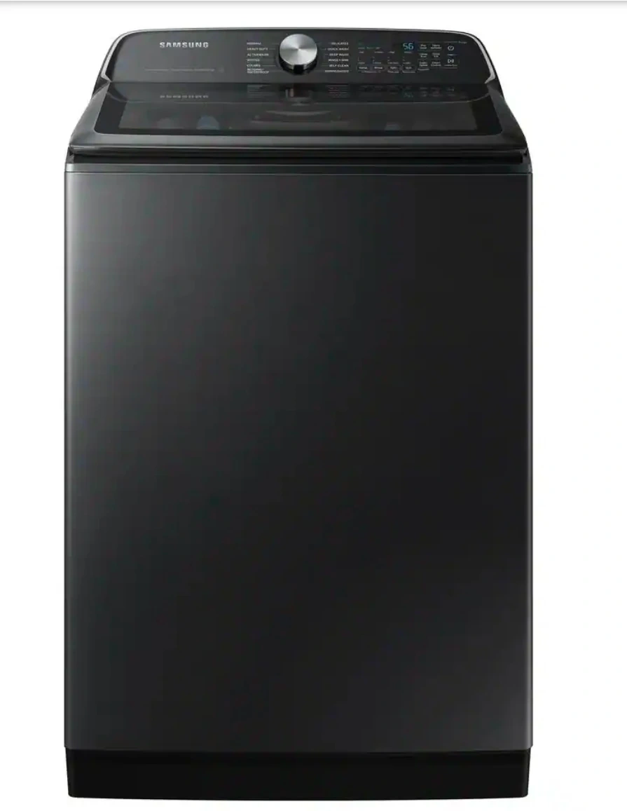 64Samsung's 5.5 cu. ft. Extra-Large Capacity Top Load Washing Machine is equipped with Super Speed Wash, which powerfully cleans a full load of laundry in just 28 minutes. Without sacrificing cleaning performance. With Wi-Fi connectivity, you can remotely start, stop, or delay your smart washer from our simple-touse SmartThings App. Active WaterJet, a built-in water faucet, lets you easily pretreat heavily soiled and stained clothes. Fewer loads, less time in the laundry room, and more time doing the things you love. With Wi-Fi connectivity, remotely start, stop, or delay your washer from one simple-to-use app. Get cycle recommendations based on soil level, energy usage notifications and so much more Wash a full load of laundry in just 28 minutes* without sacrificing cleaning performance. A built-in water faucet lets you easily pretreat soiled or heavily stained clothes with the press of a button. Scrub items right inside your washer, no laundry room sink needed. Samsung washing machines are assembled in America, and are covered by a 20-Year Warranty on the Digital Inverter Motor.* Purchase with confidence, and enjoy superior efficiency and long-lasting performance. Selecting the Deep Fill option before starting your laundry maximizes the water level to make sure all your clothes get a thorough soak Do your laundry in peace. Our innovative Vibration Reduction Technology+ reduces noise and vibration and creates a quiet washing experience. Keep your washer tub fresh and clean. Self Clean will notify you every 20 wash cycles when it is time for a cleaning. The thoughtfully designed Soft-Close Lid closes safely, gently, and quietly. The improved tub pattern draws out more water during the rinse cycle and helps prevent clothes from snagging during the wash ENERGY STAR Certified so you use less energy without sacrificing performance or functionality Easy troubleshooting from the convenience of your smartphone.* Smart Care interacts with your washer and dryer to perform an immediate diagnosis and offer quick solutions. Aiding the visually and hearing impaired, your washer and dryer now feature audio assistance, playing a different sound for each option, and braille right next to key control panel buttons.