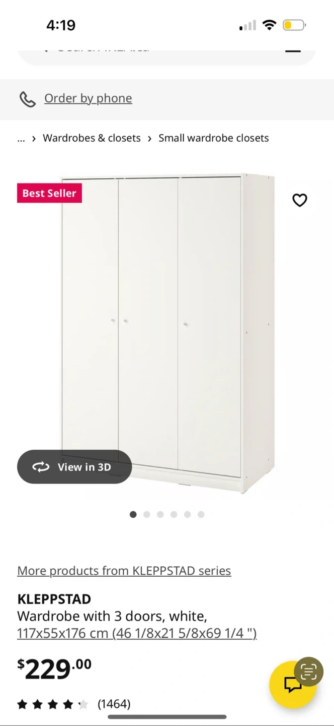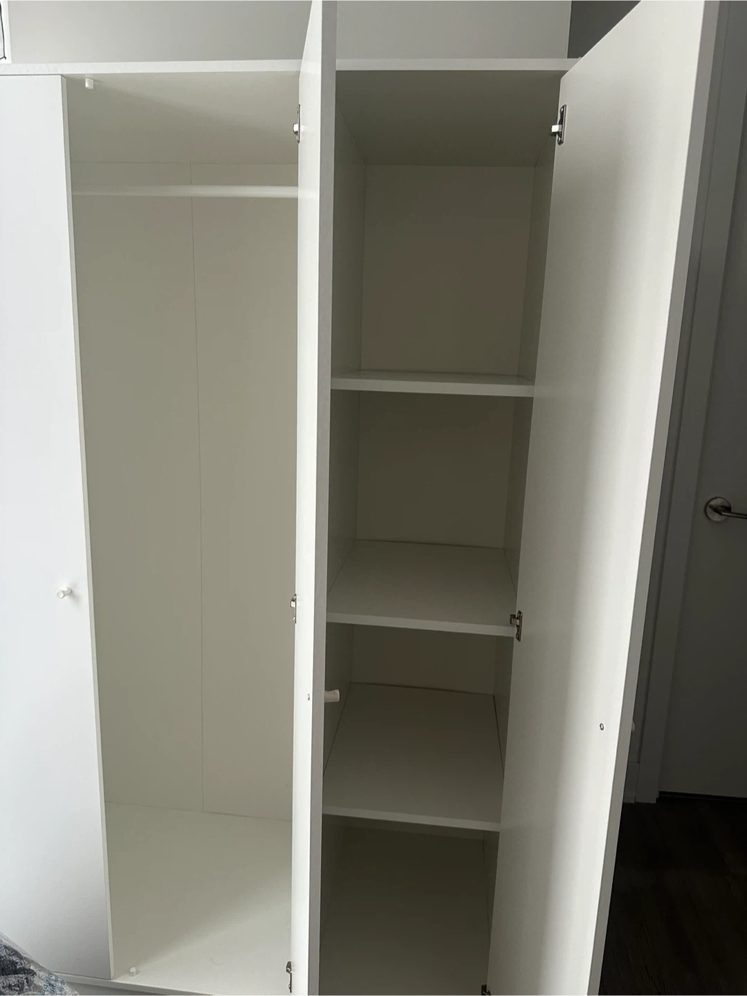 This is a KLEPPSTAD wardrobe with 3 doors in white. It measures 117x55x176 cm. Includes a hanging rail and three shelves. Plenty of storage for your clothes!