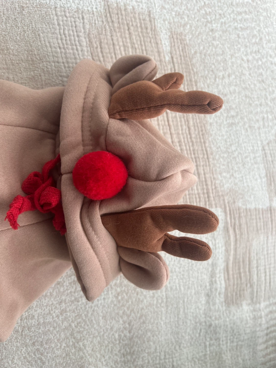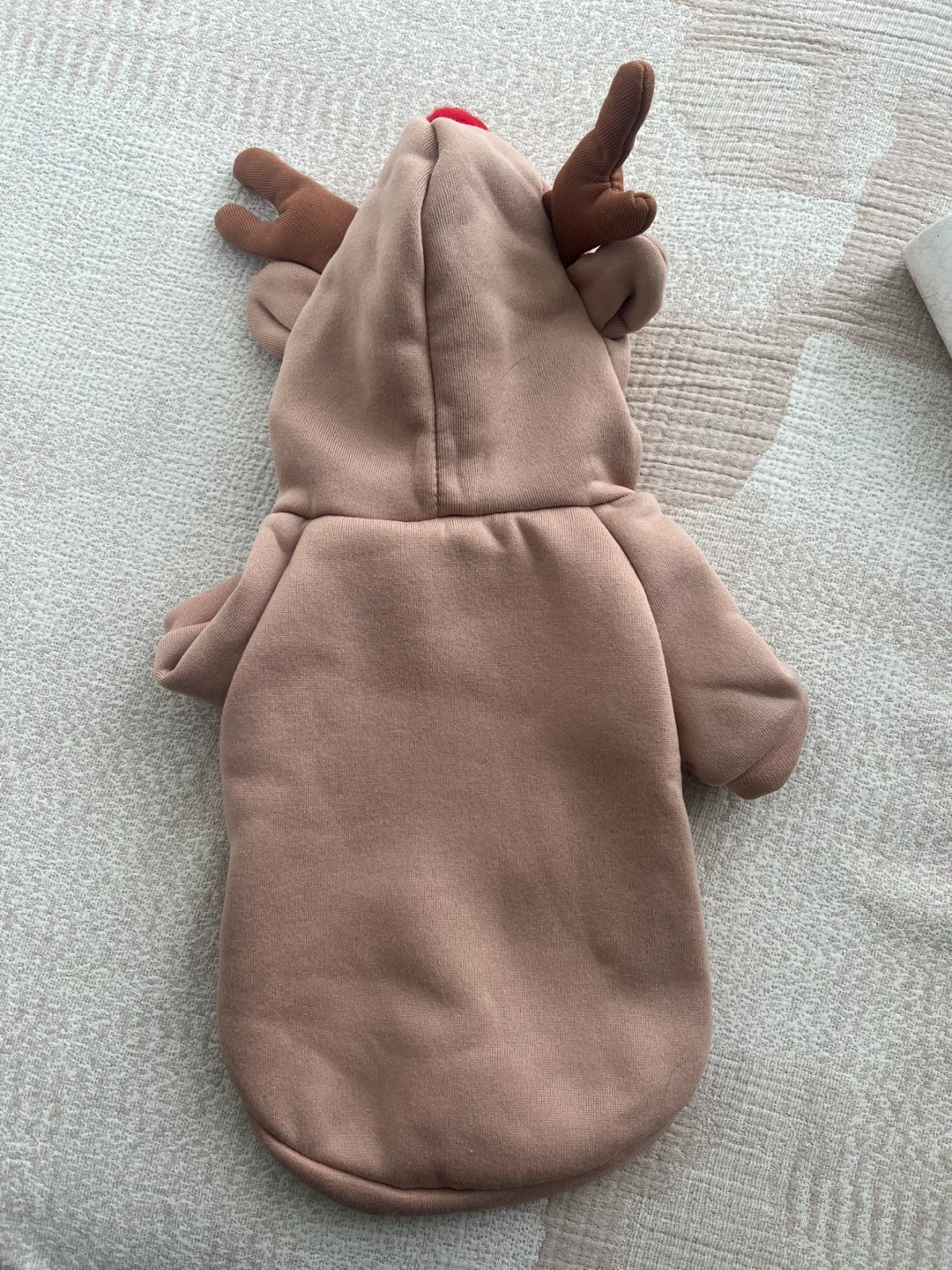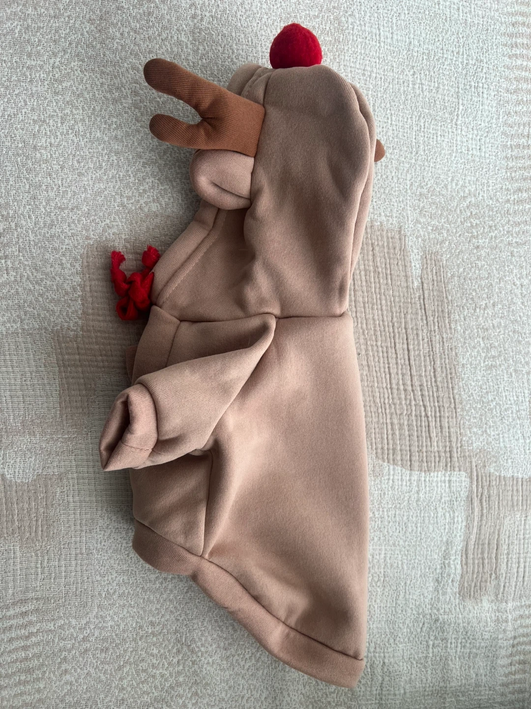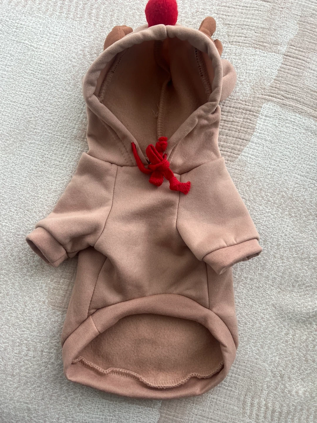 Get your furry friend ready for the holidays with this super cute reindeer hoodie! It's a light brown colour with a red pompom and antlers on the hood, and a red tie detail. Perfect for keeping your pet warm and stylish!