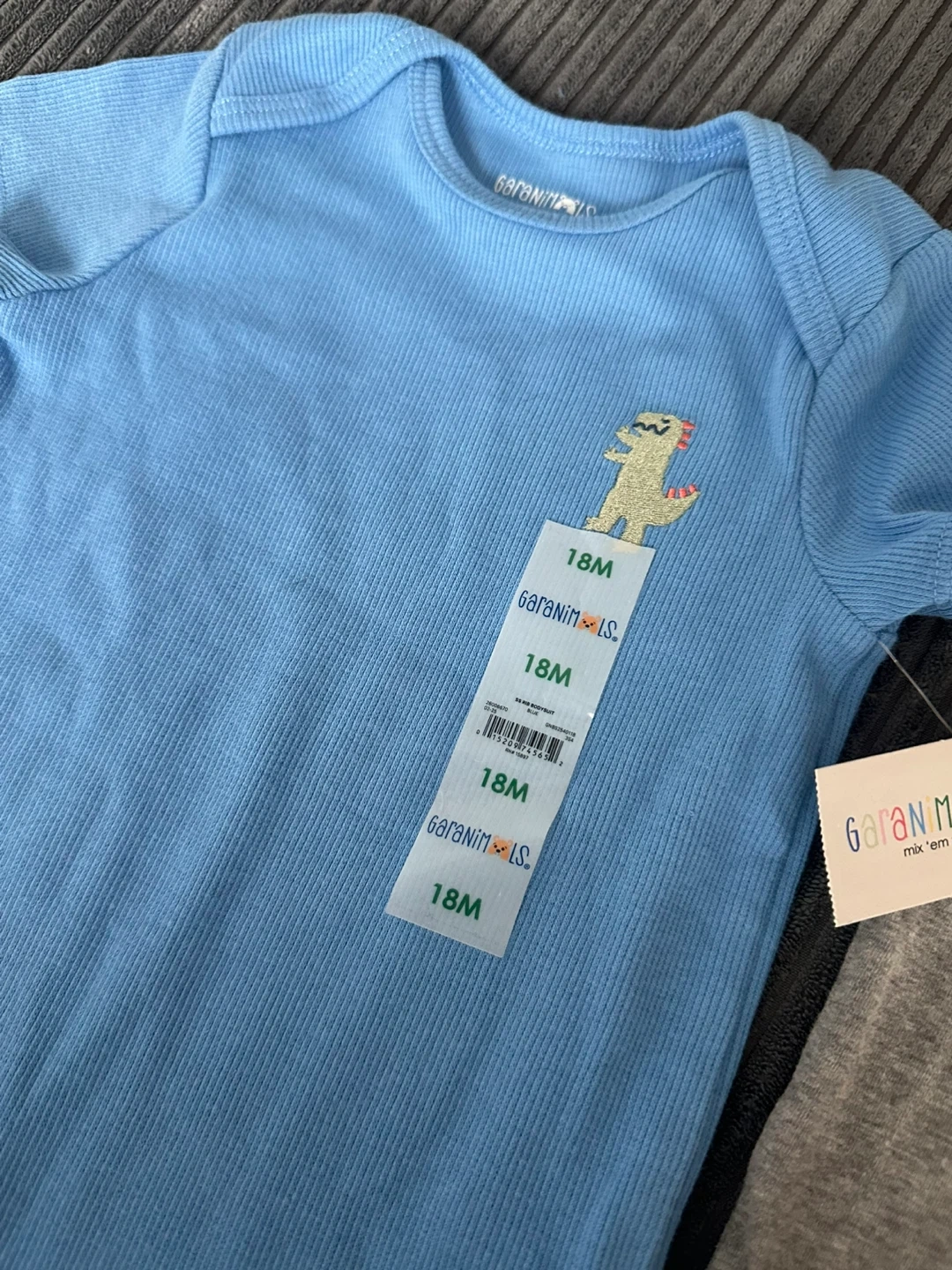 - A light blue Garaminimals dinosaur bodysuit
