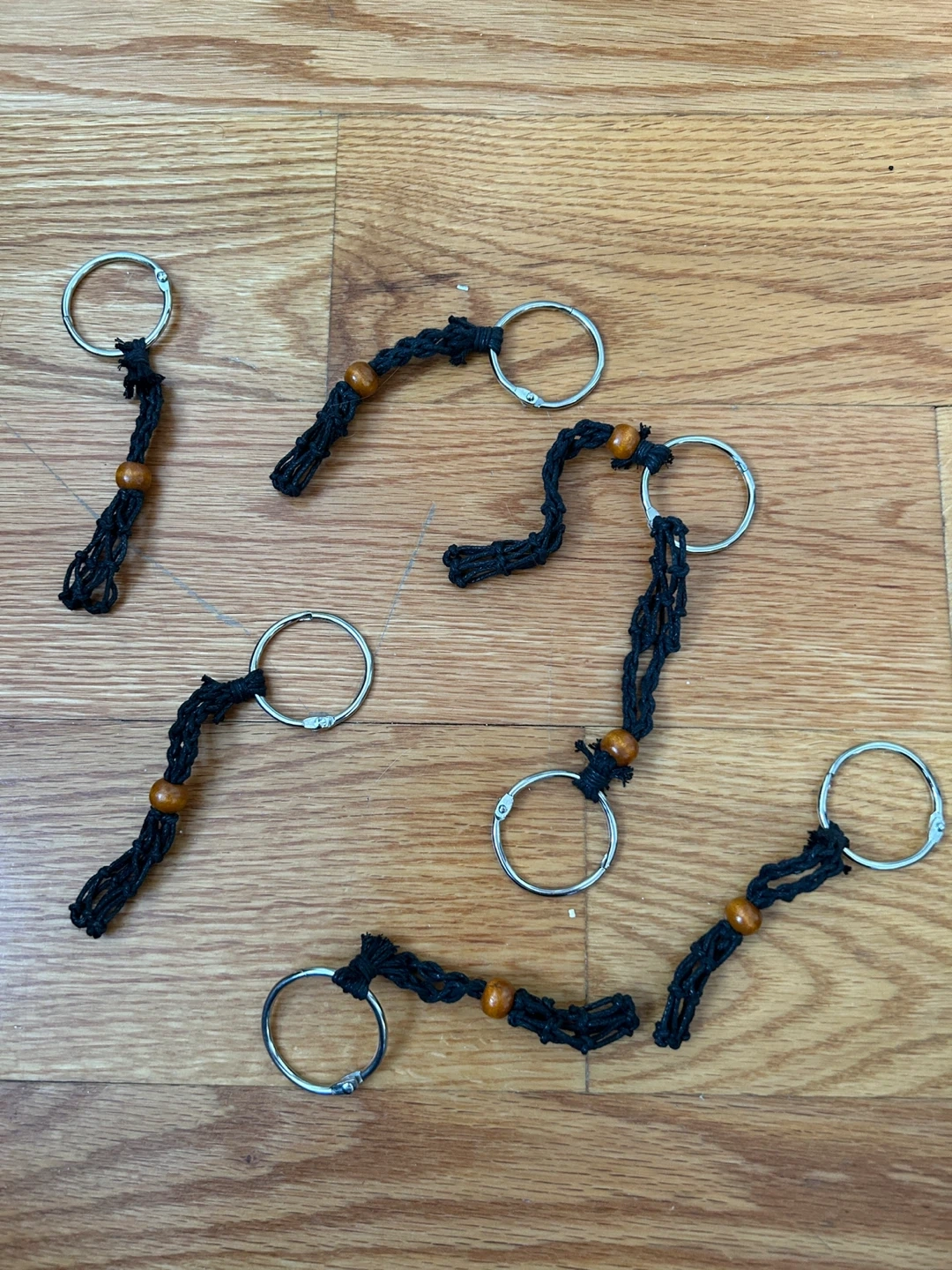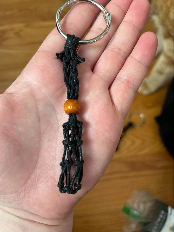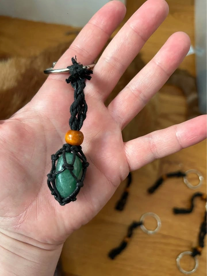 Set of seven macrame keychains for holding crystals. CRYSTALS NOT INCLUDED. The last picture is just for a demonstration of how it works - you can easily slot crystals of a few different sizes into the macrame pouch and adjust the size with the bead slider.