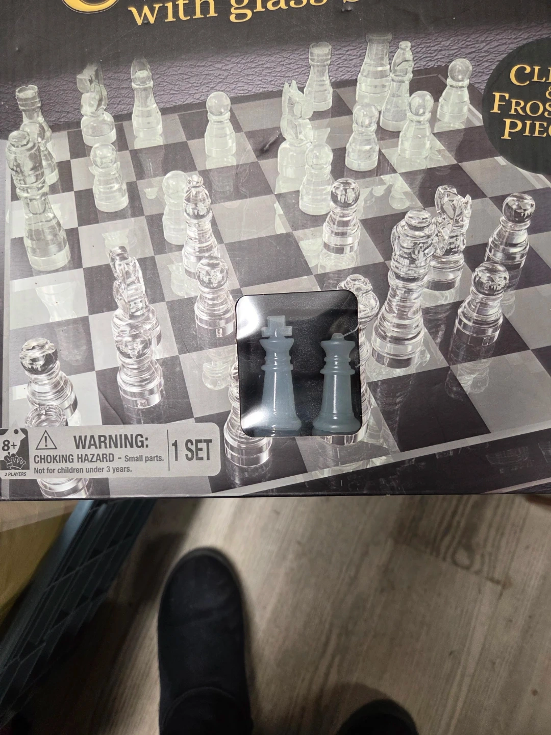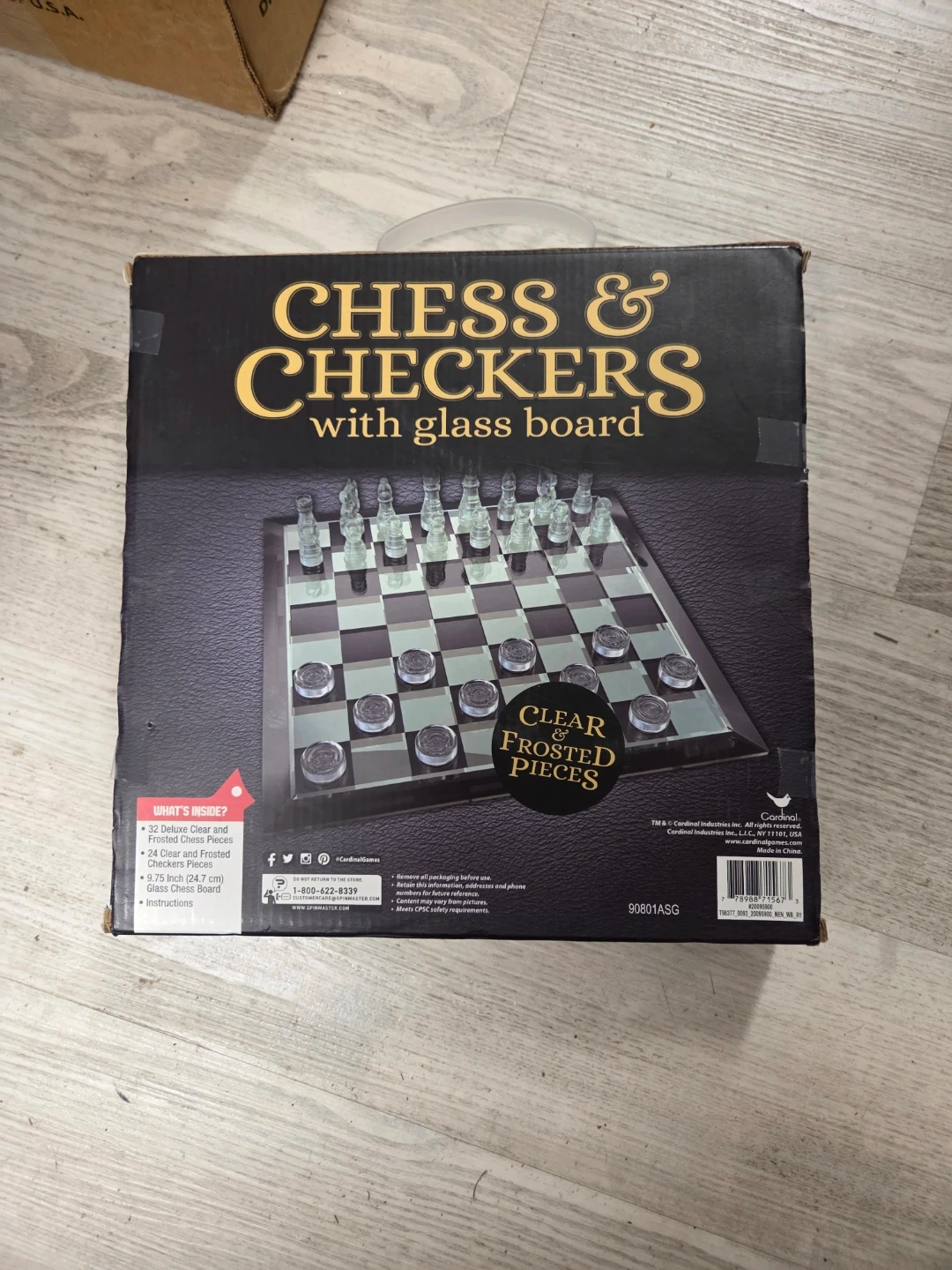 Enjoy classic strategy games with this elegant chess and checkers set. It features a durable glass board and clear frosted pieces for a sleek look. Board size is 9.75 inches (24.7 cm). Set includes 32 deluxe pieces and instructions.