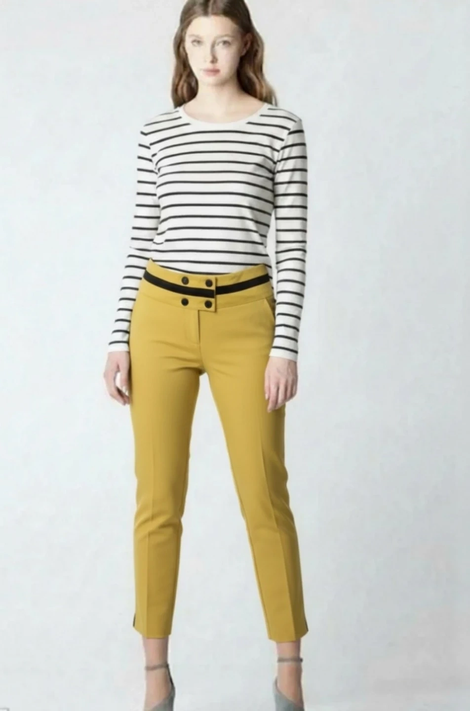 These mustard dress pants feature a stylish black waistband with button accents. They're a great option for adding a pop of color to your wardrobe. Made for a flattering fit.