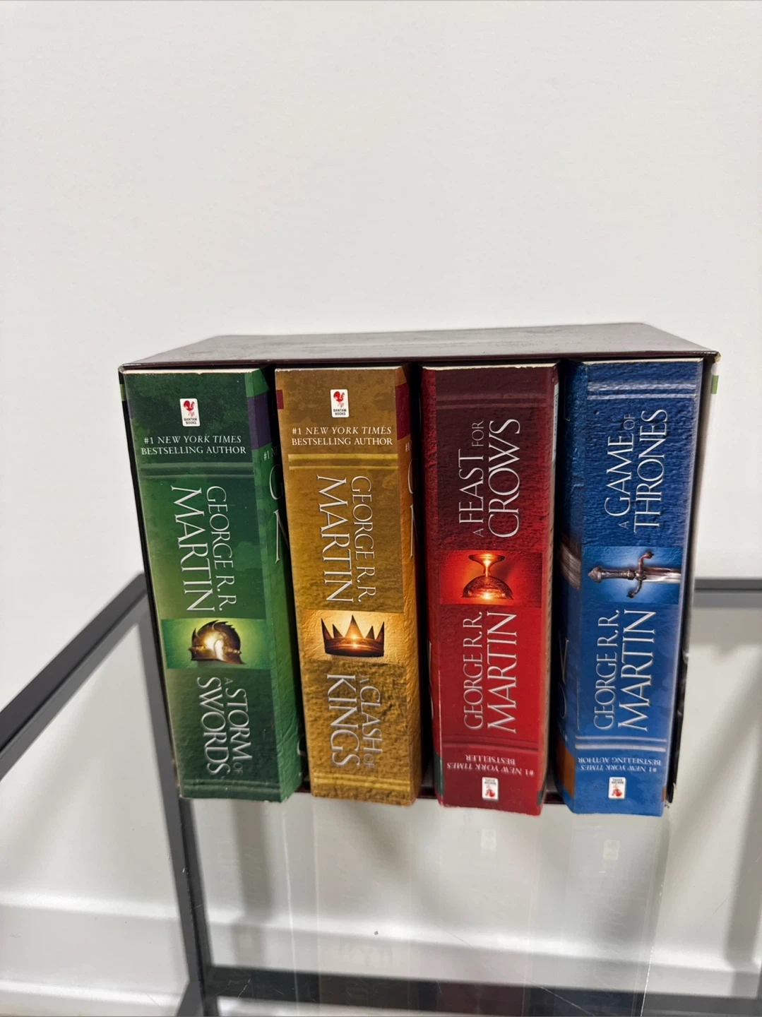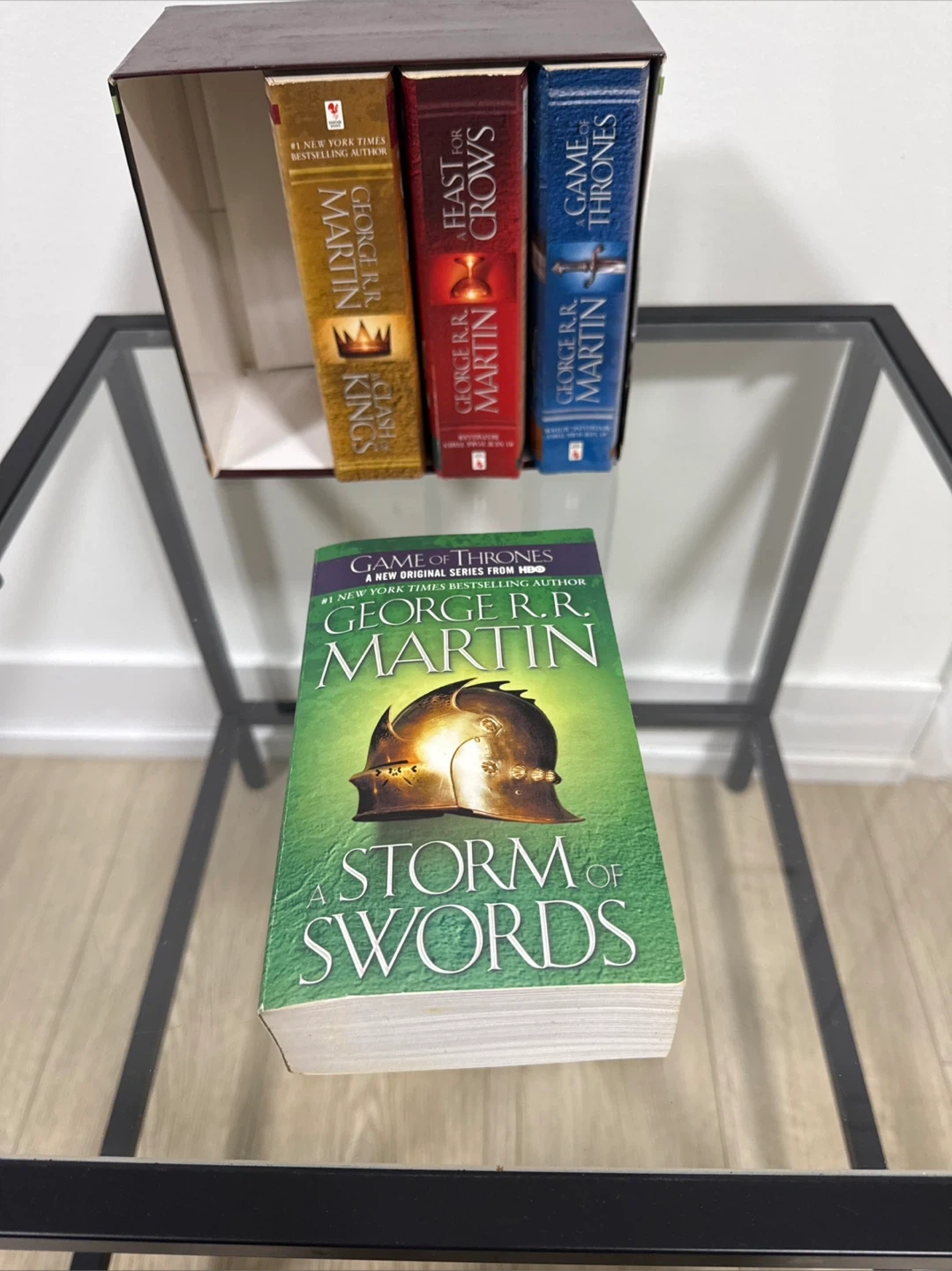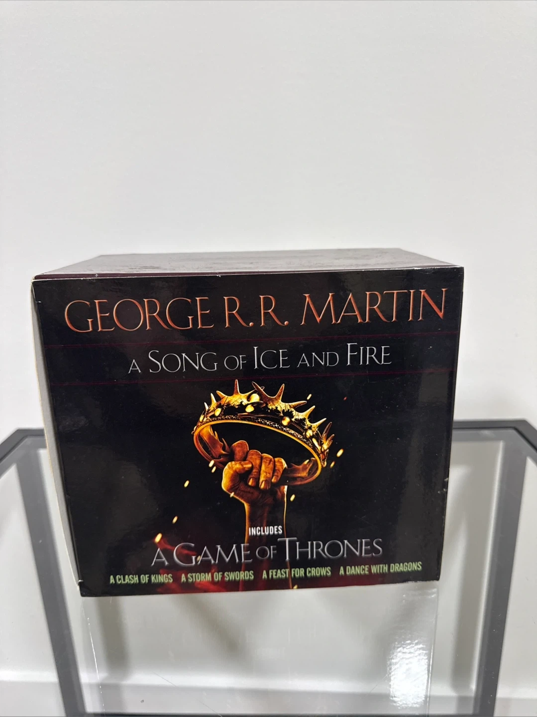 This box set includes A Storm of Swords, A Clash of Kings, A Feast for Crows, and A Game of Thrones. All books are by George R.R. Martin and part of the A Song of Ice and Fire series. This set is perfect for fans of epic fantasy novels!