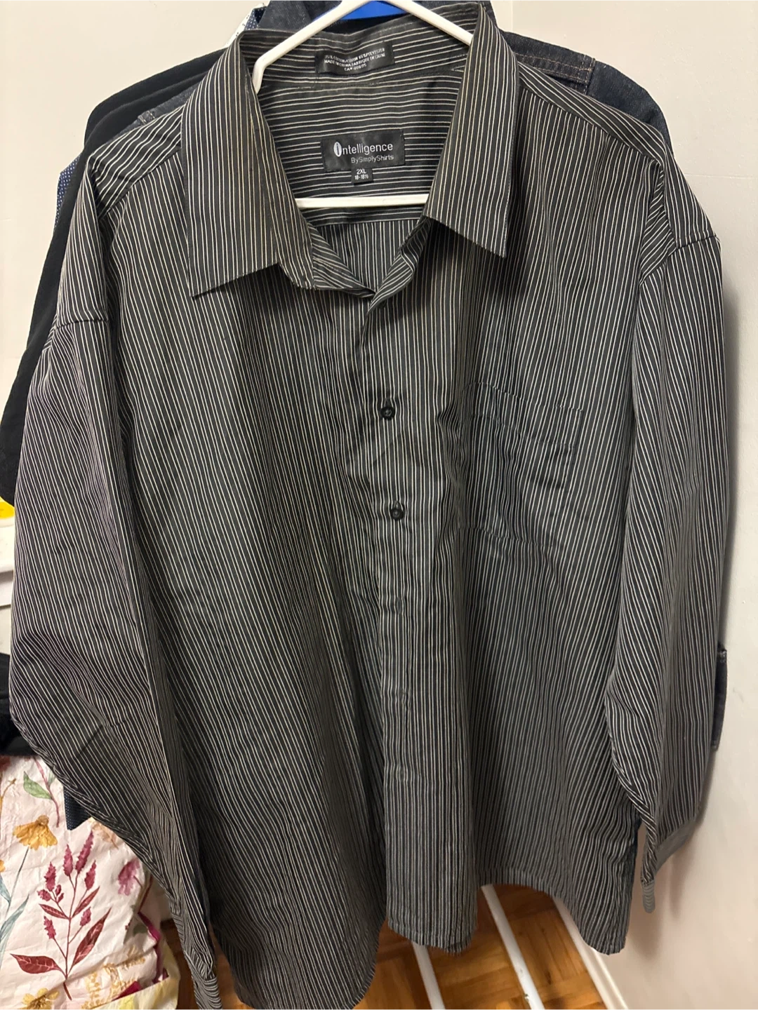 Men's long-sleeve dress shirt by Intelligence. It's a size 2XL with a pinstripe pattern. This shirt is suitable for smart casual or formal occasions.
