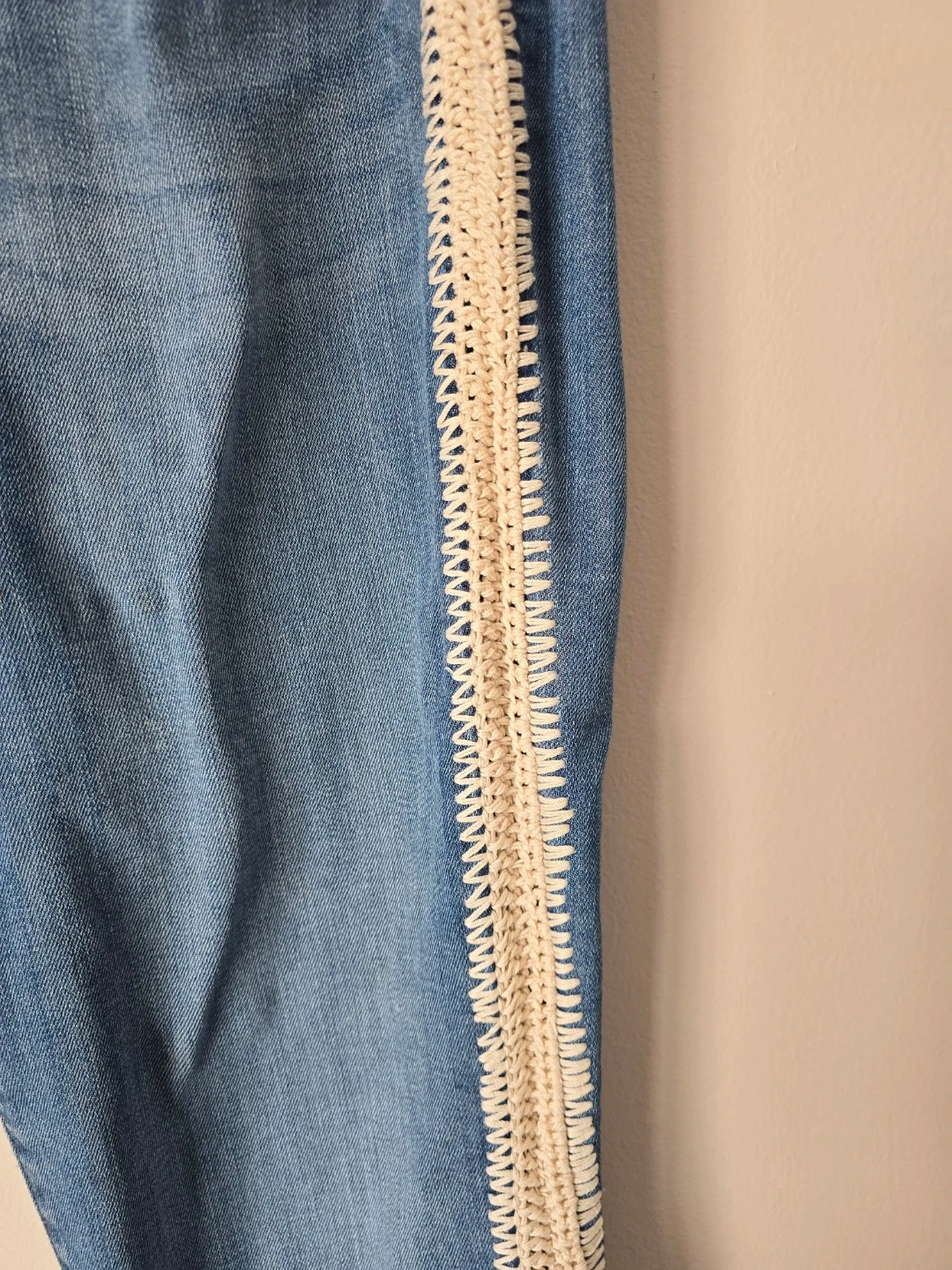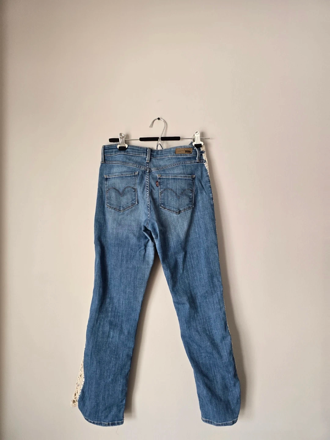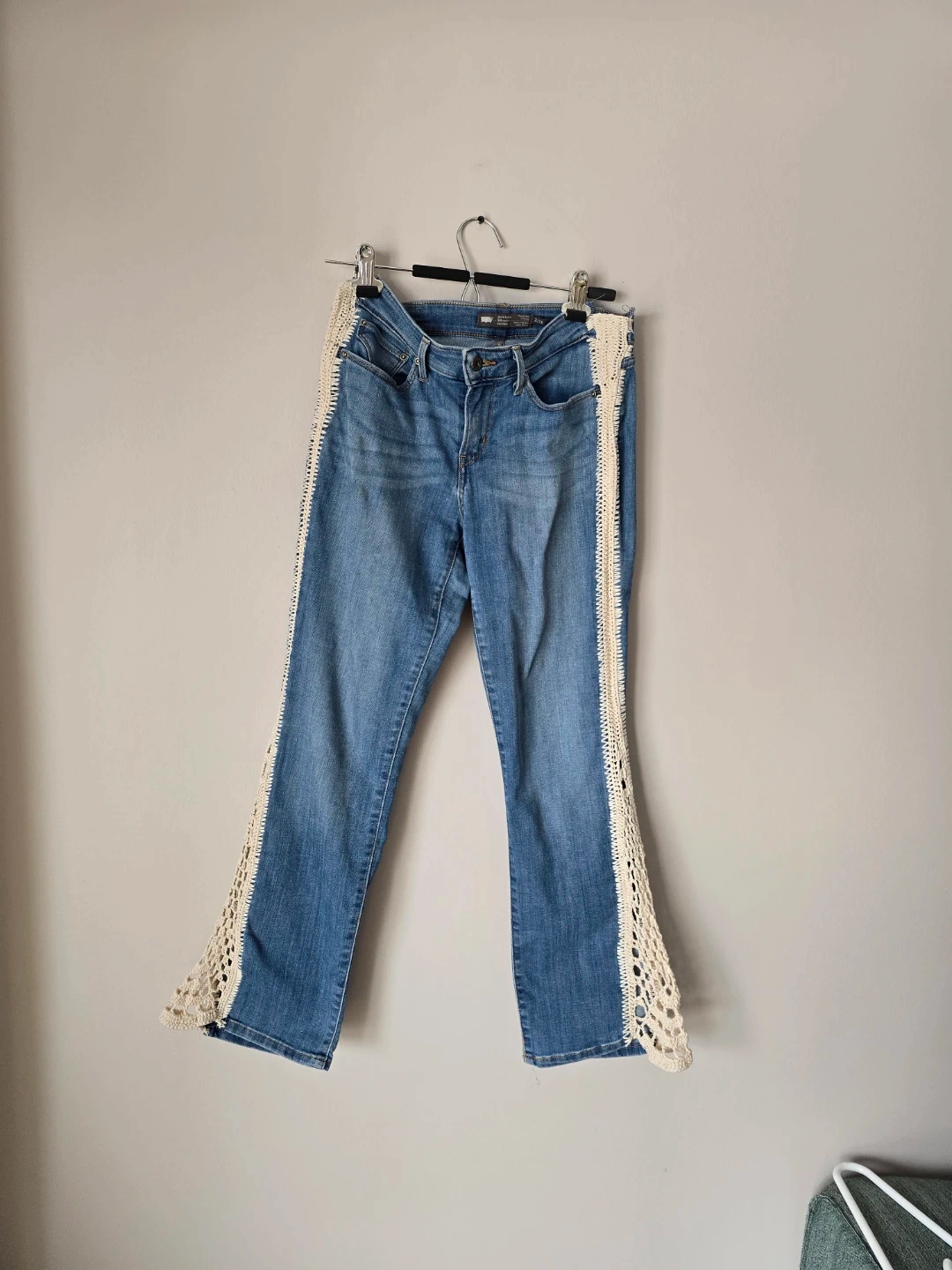 Women's blue denim jeans featuring a cream crochet trim along the outer seams. Classic Levi's styling with a unique decorative touch. These jeans have a comfortable fit and a stylish look.