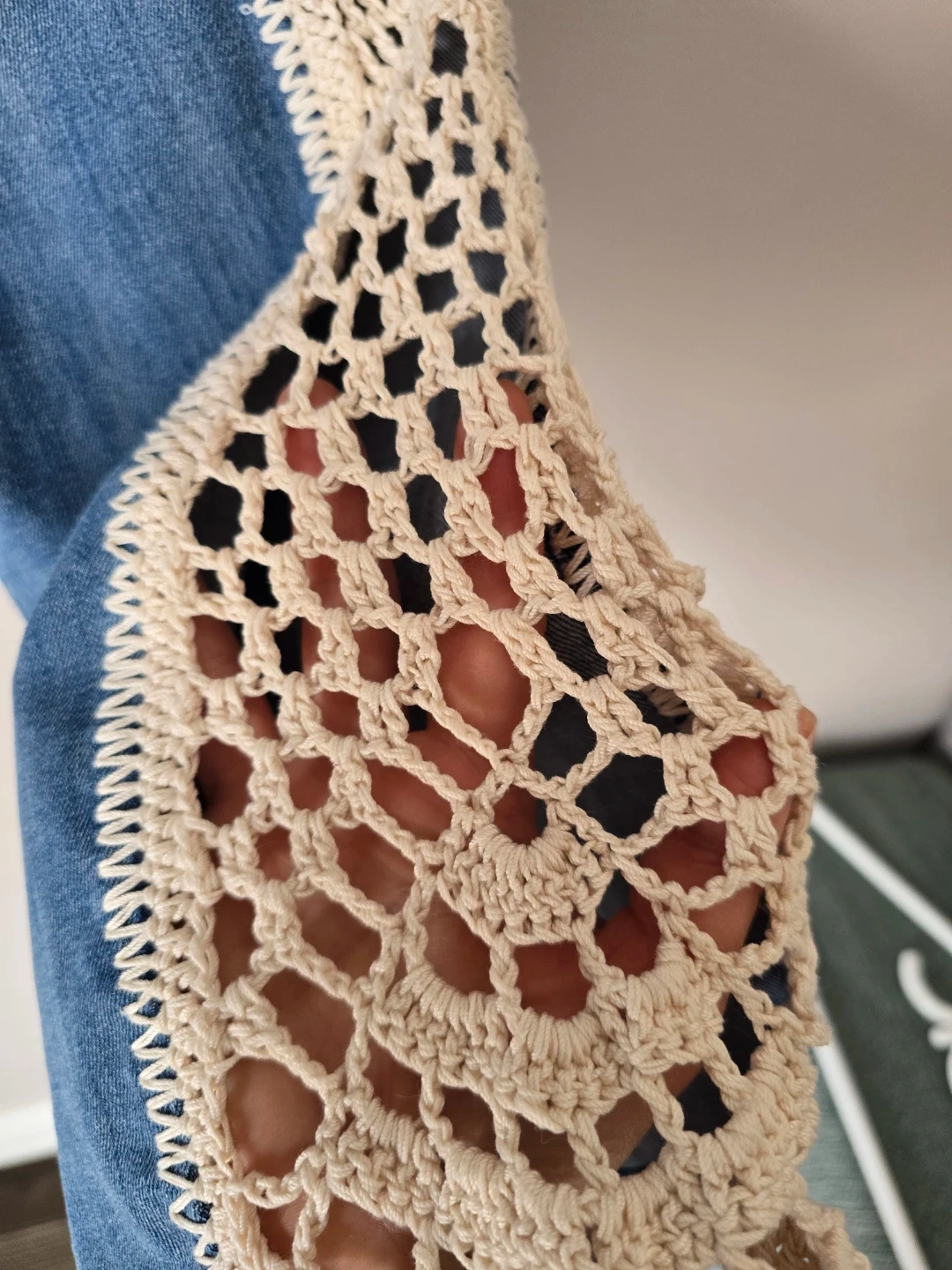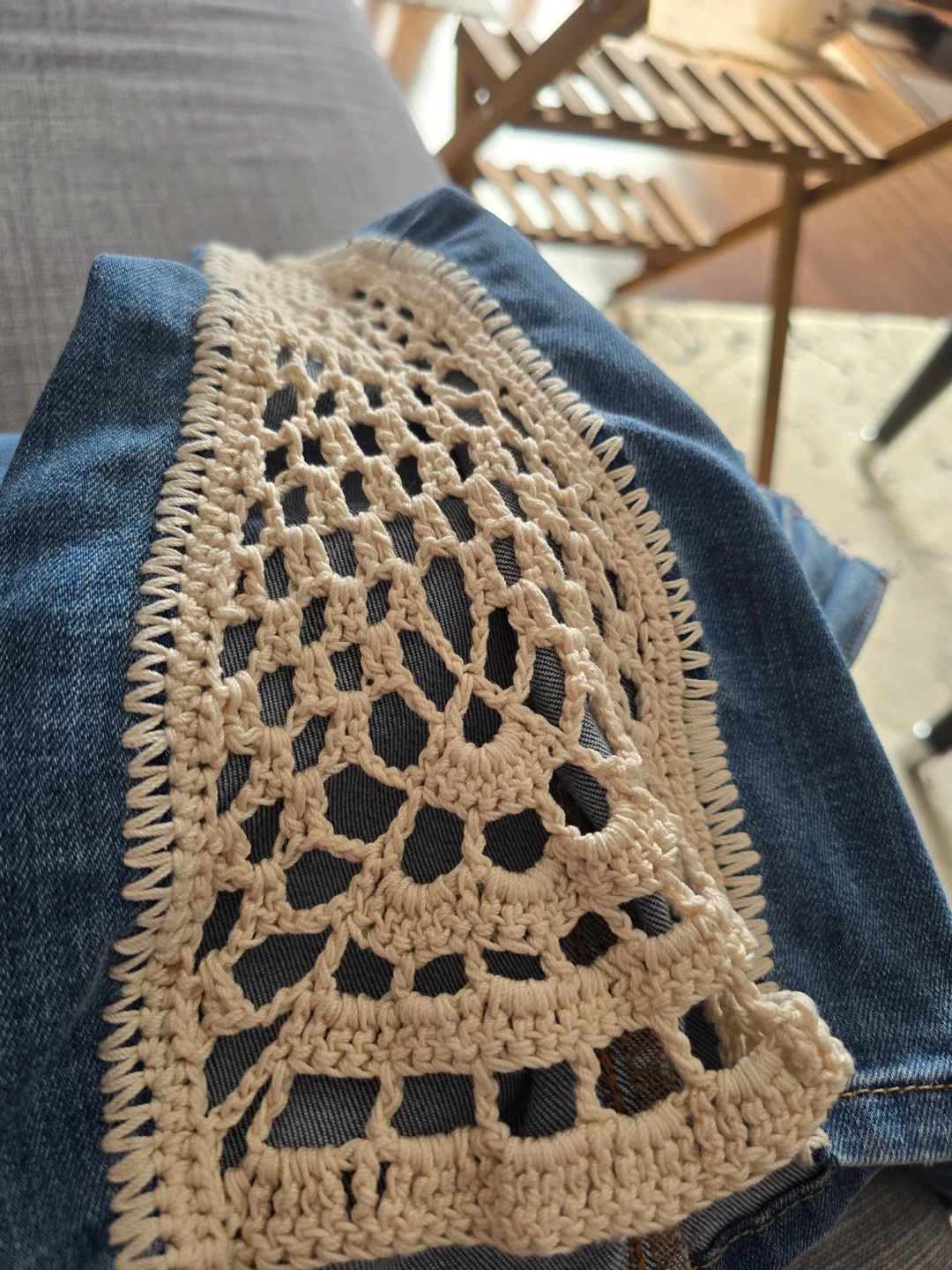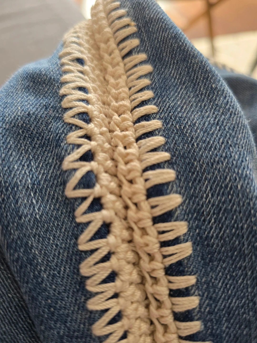 Women's blue denim jeans featuring a cream crochet trim along the outer seams. Classic Levi's styling with a unique decorative touch. These jeans have a comfortable fit and a stylish look.