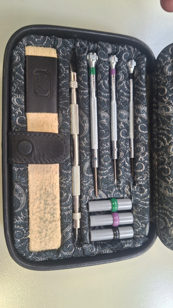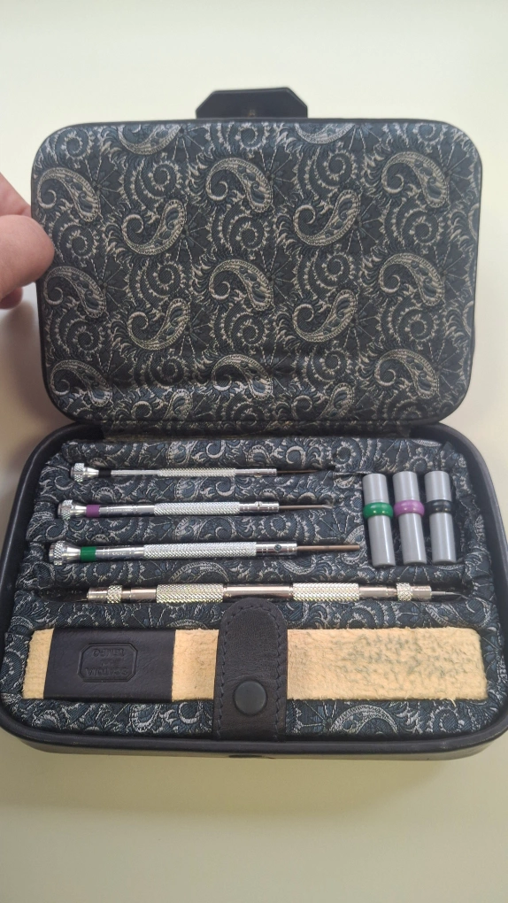 60Selling a Scatola del Tempo watch tool kit. It comes in a leather case and includes various tools for watch maintenance. The kit also includes polishing cloths. Great for any watch enthusiast!
