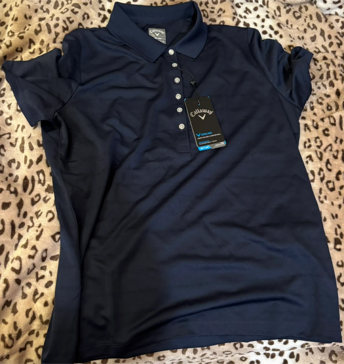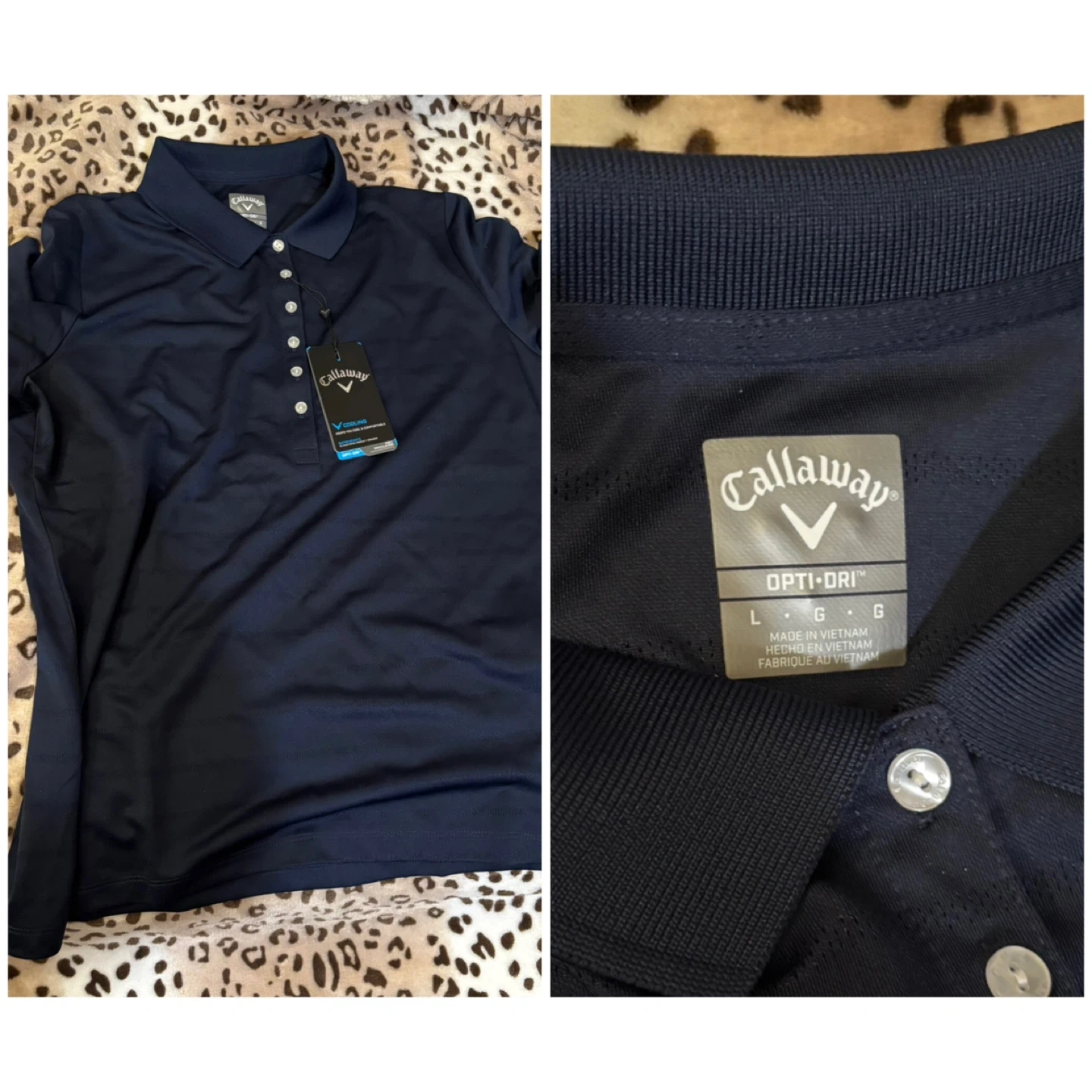 For sale is a Callaway Opti-Dri golf polo shirt in navy. It's made with Opti-Dri technology to keep you cool and comfortable. Made in Vietnam, size Large for women.