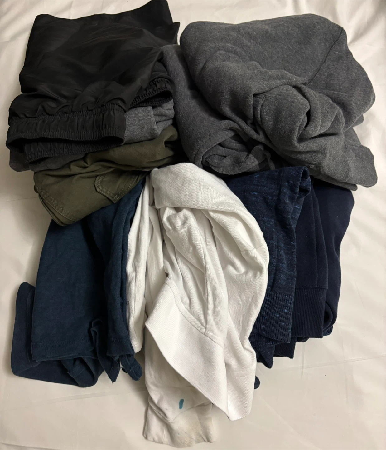 Bundle of men's casual wear including black track pants, grey hoodie, olive green pants, and various navy and white tops. Different colours and styles for everyday wear. Items are pre-owned and may show signs of wear.