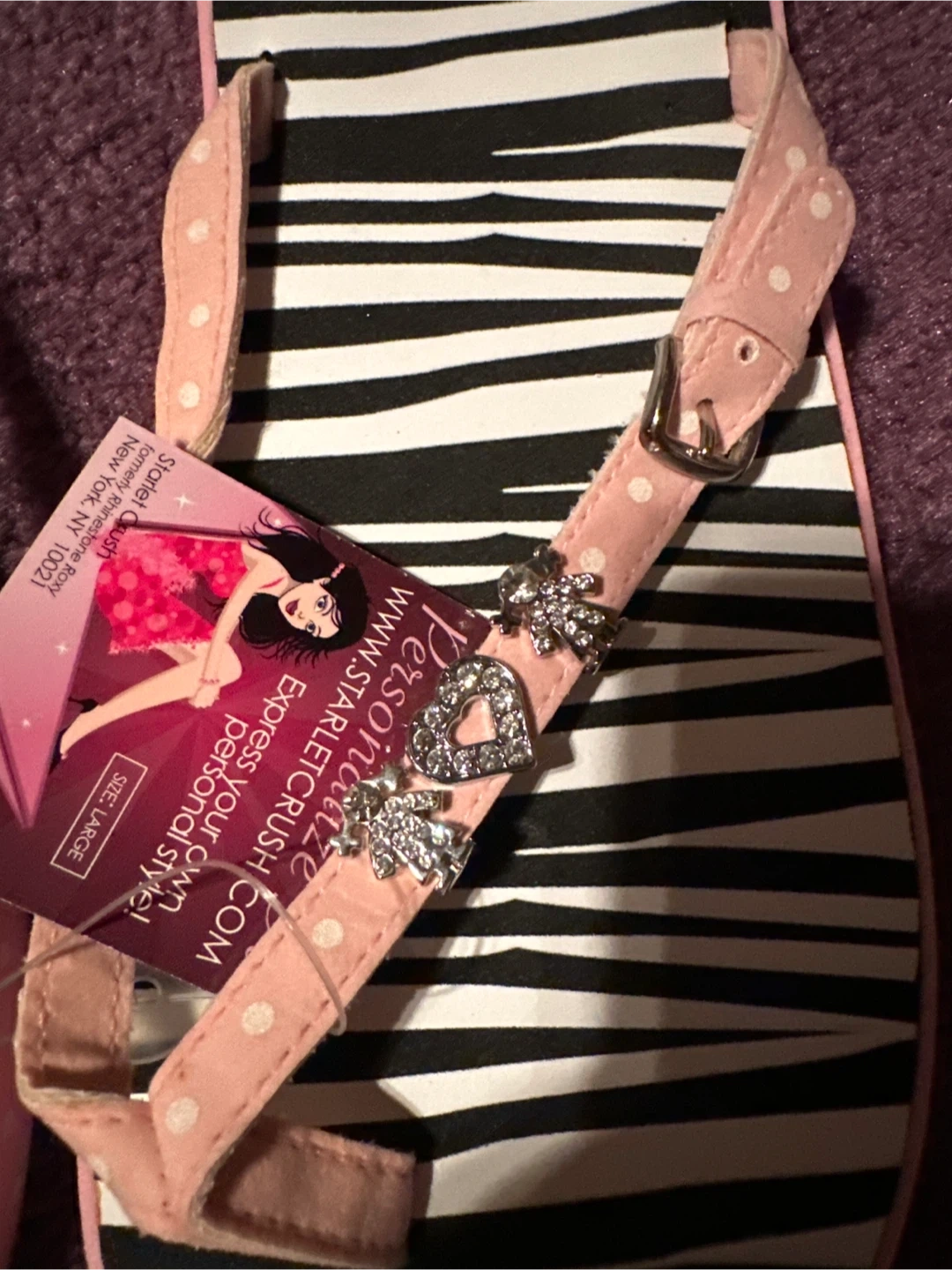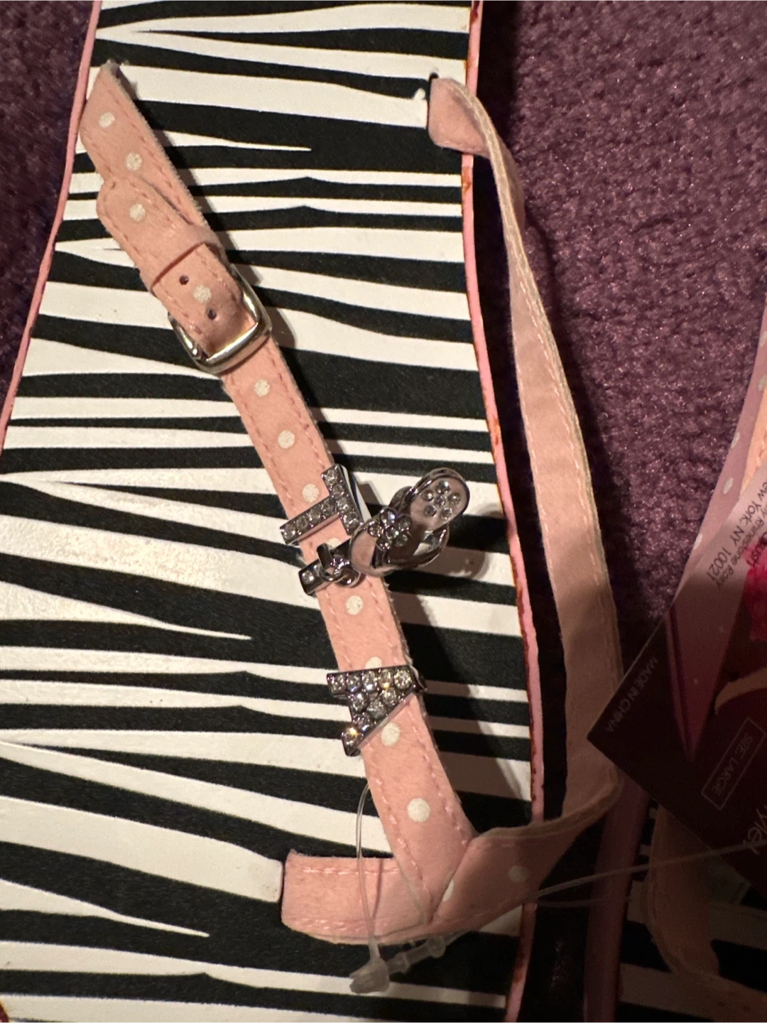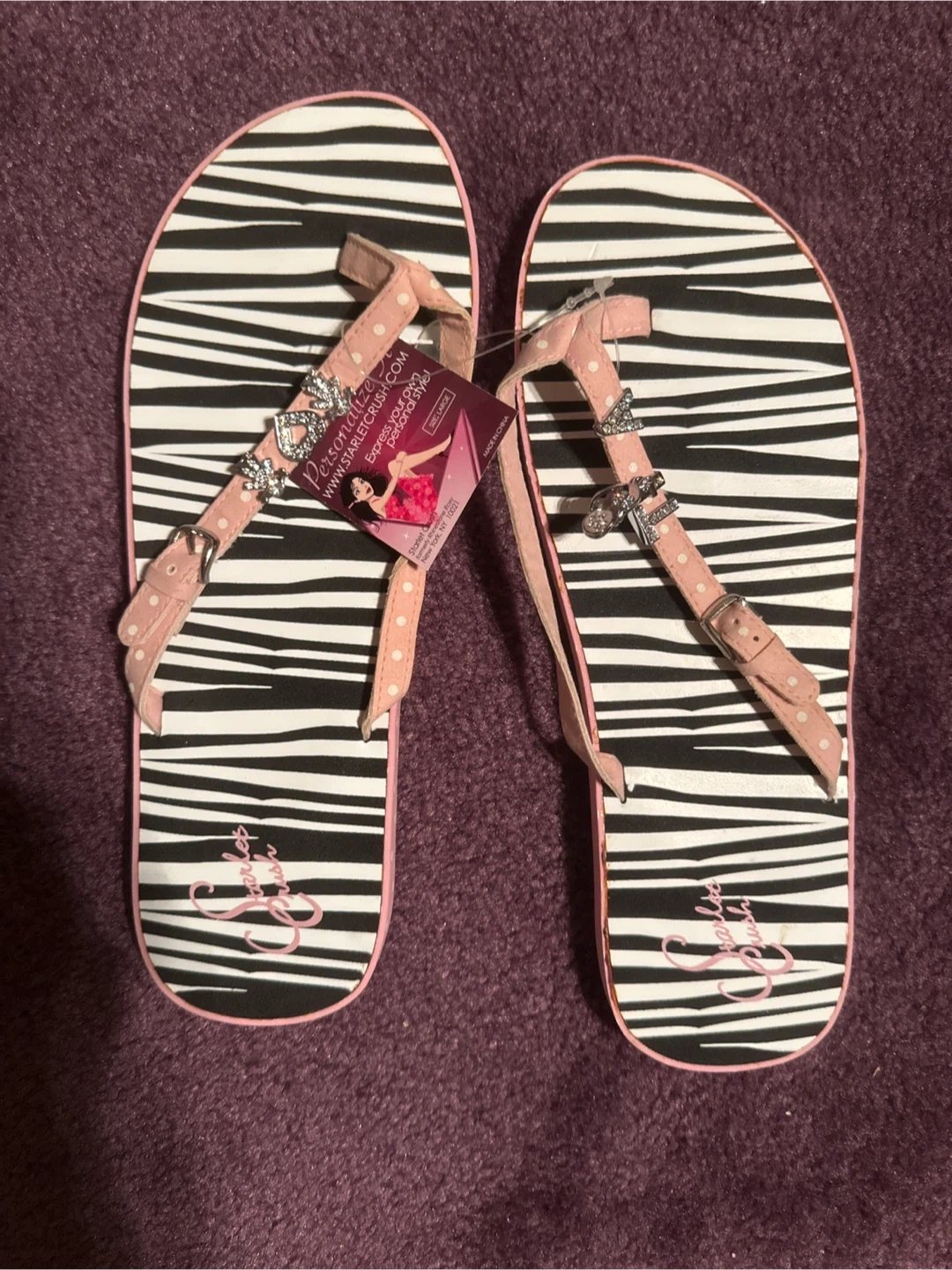 Fun zebra print flip flops with pink straps and silver embellishments. Straps are adjustable with a buckle closure. Size large. These are great for summer wear!