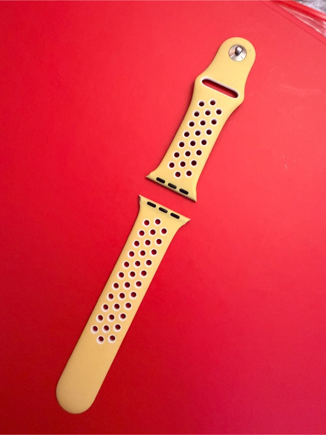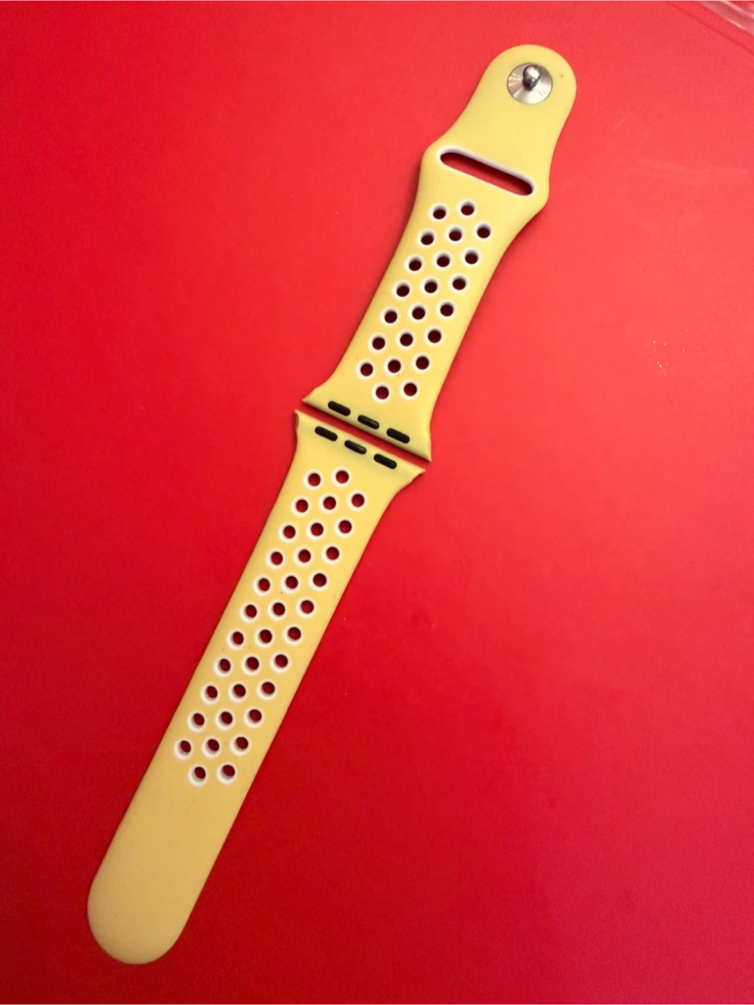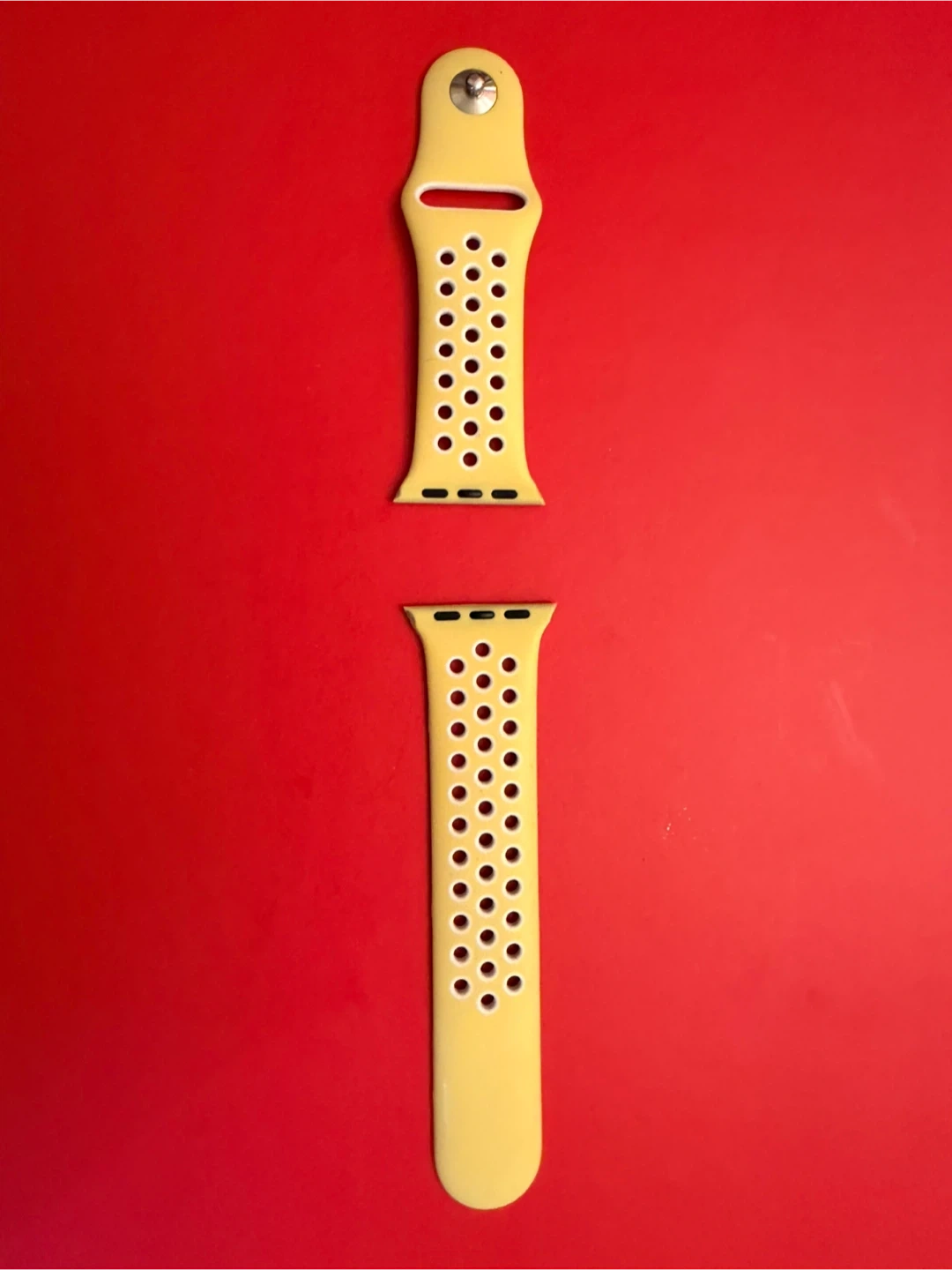 This yellow sport watch band features a durable silicone material with a breathable perforated design. It includes the pin closure mechanism for secure attachment.