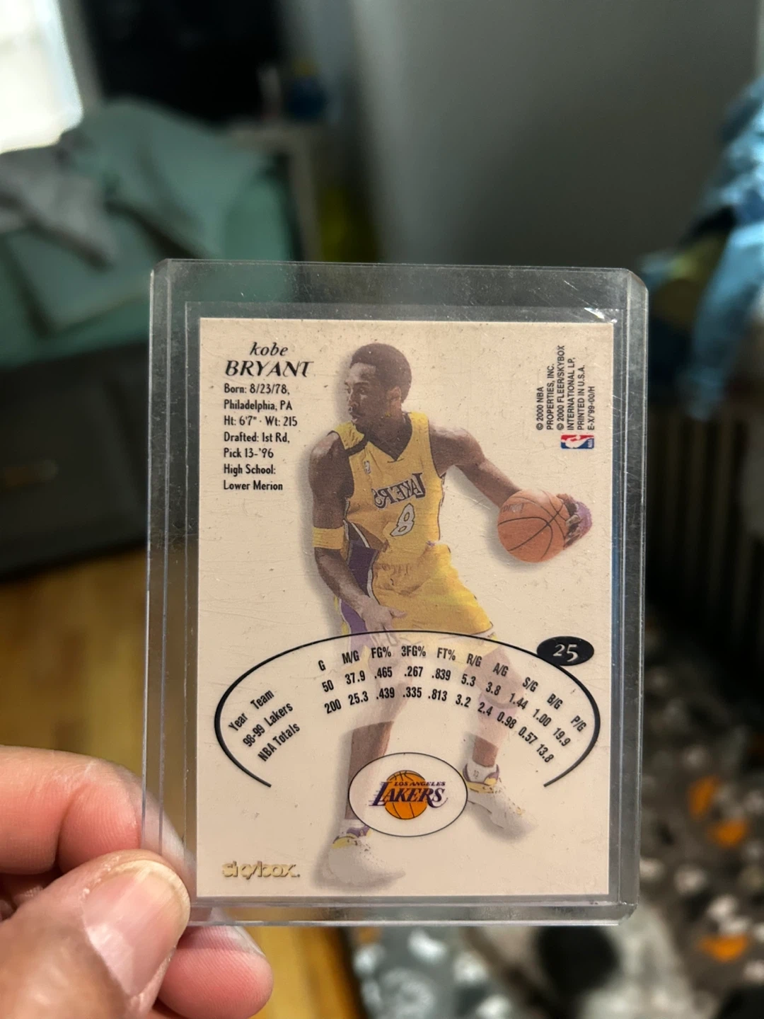This is a 2000 Fleer Exclusive basketball card featuring Kobe Bryant. It's from the 95-96 Lakers season. The card has stats and biographical information printed on the back.