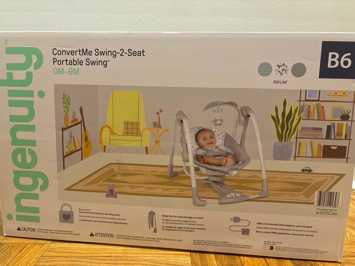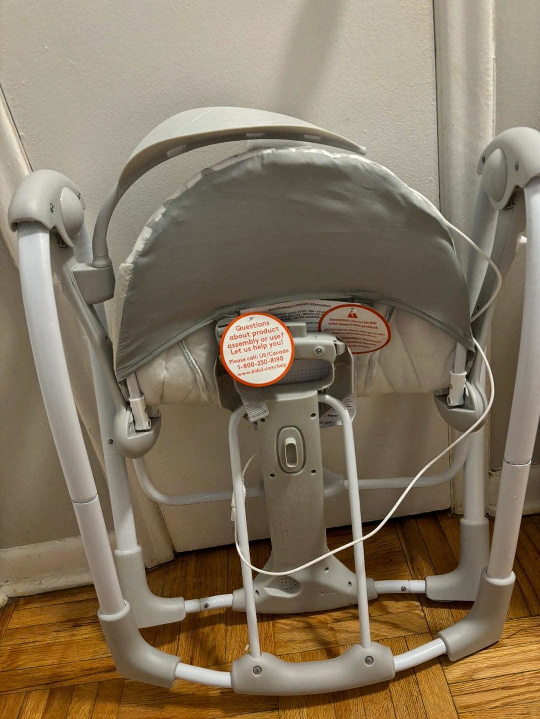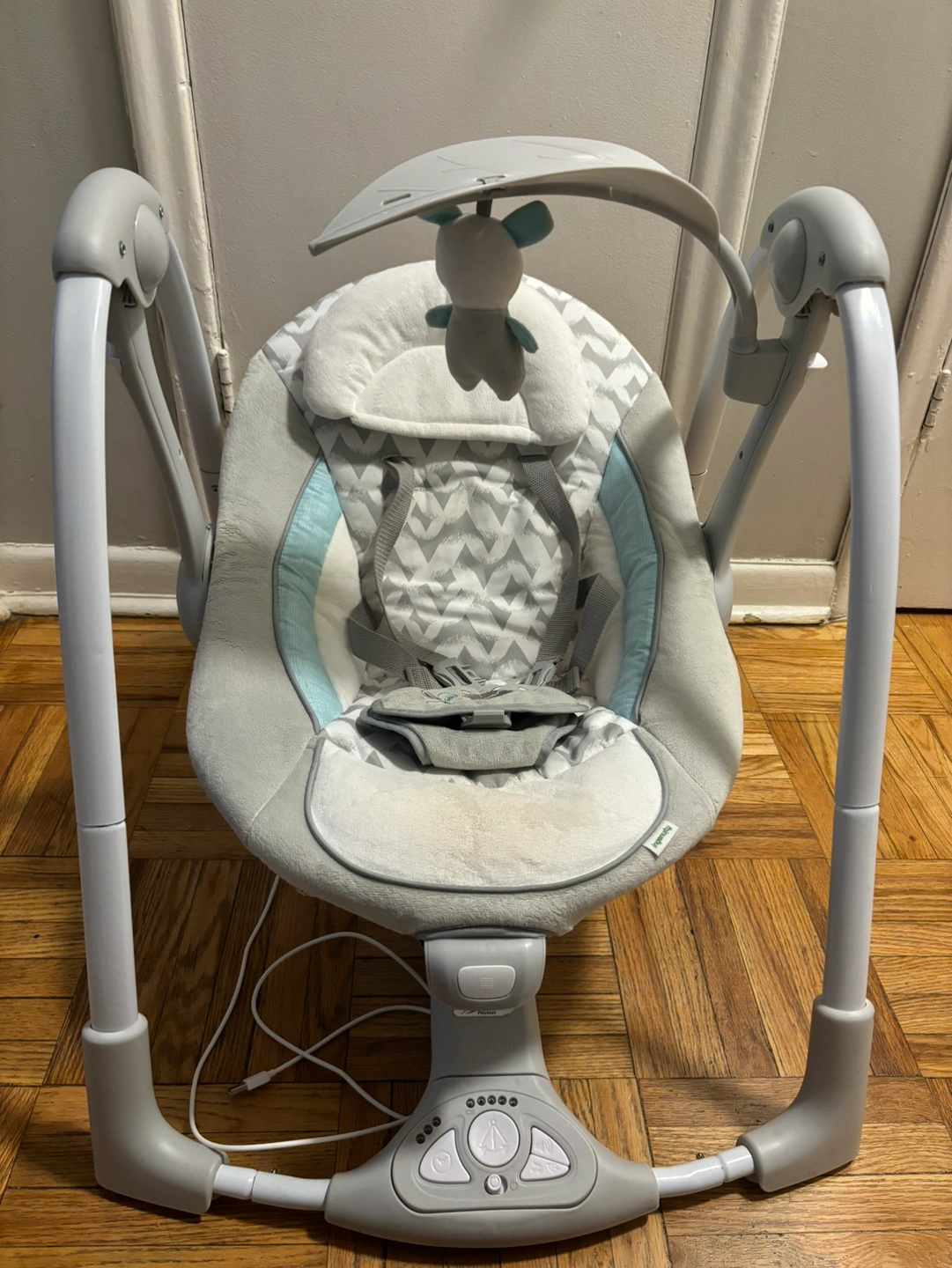 Baby swing with various speed , timer, and sound settings. Comes with a removable toy bar and head rest.