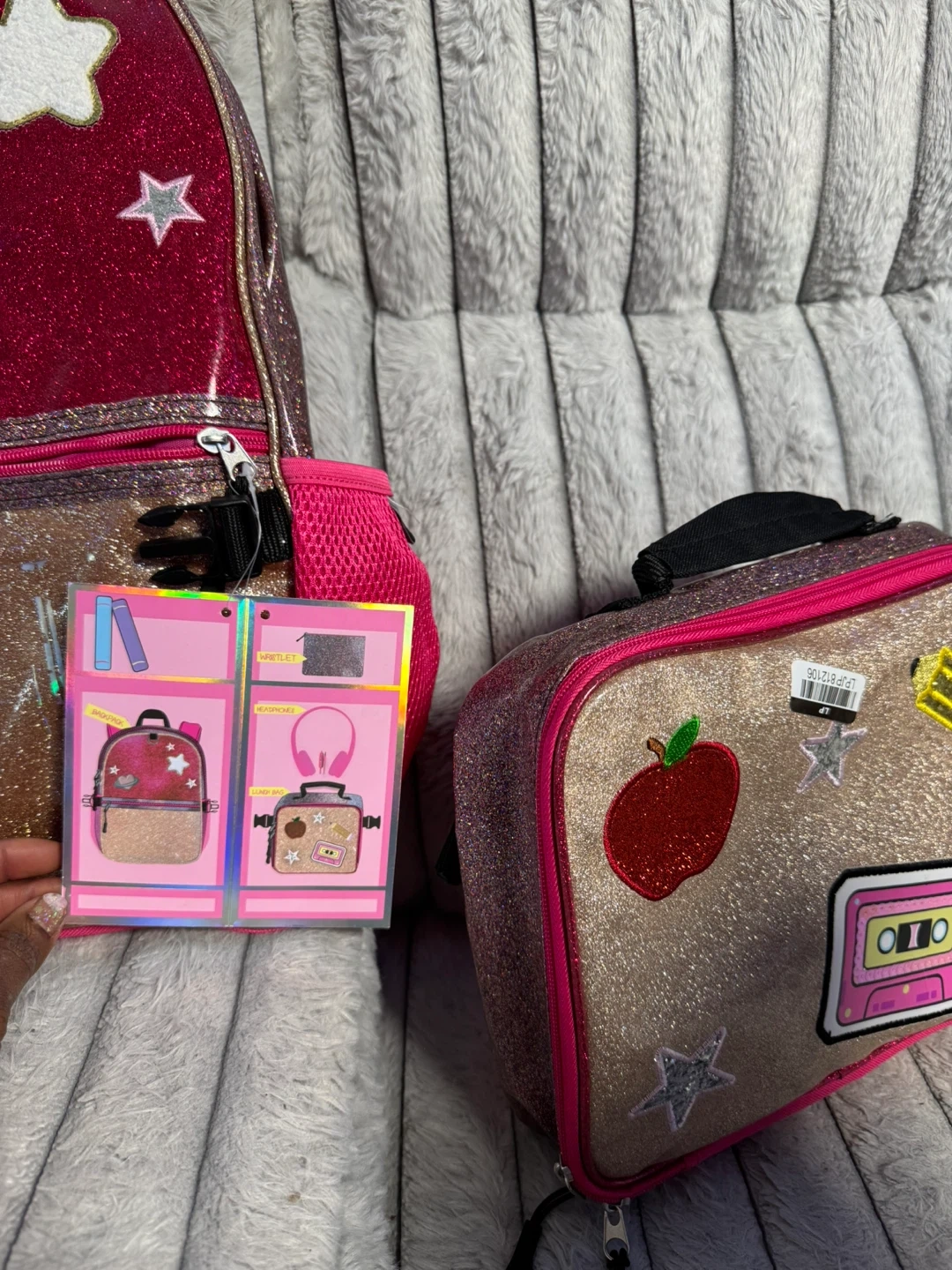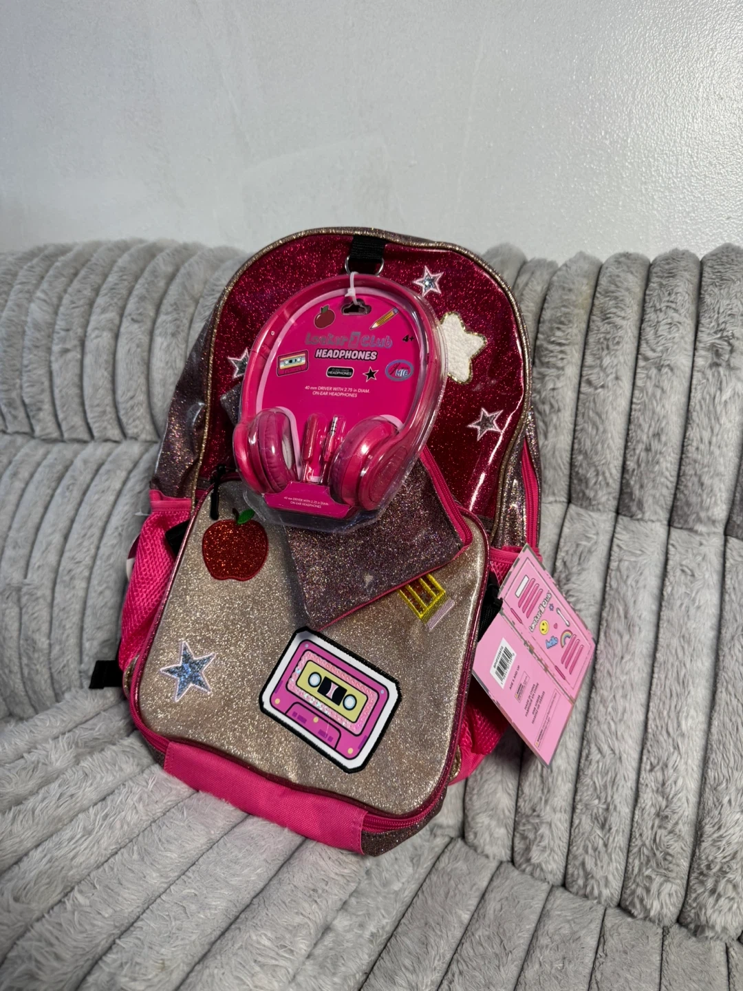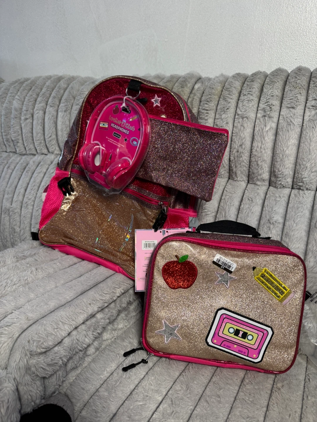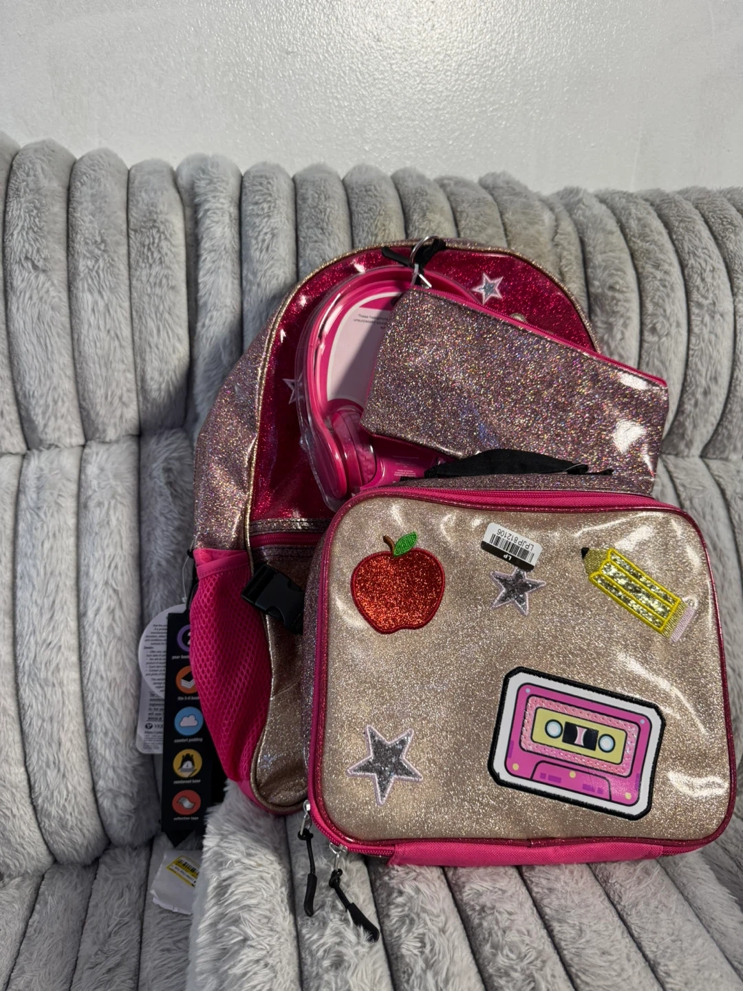 This set includes a pink glitter backpack with a pencil case and headphones. The lunch bag is also glittery and decorated with patches. It's a fun set for school or travel!