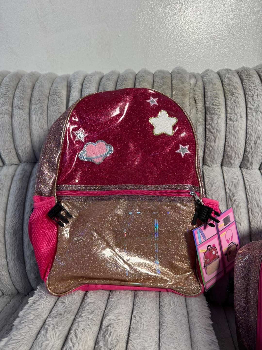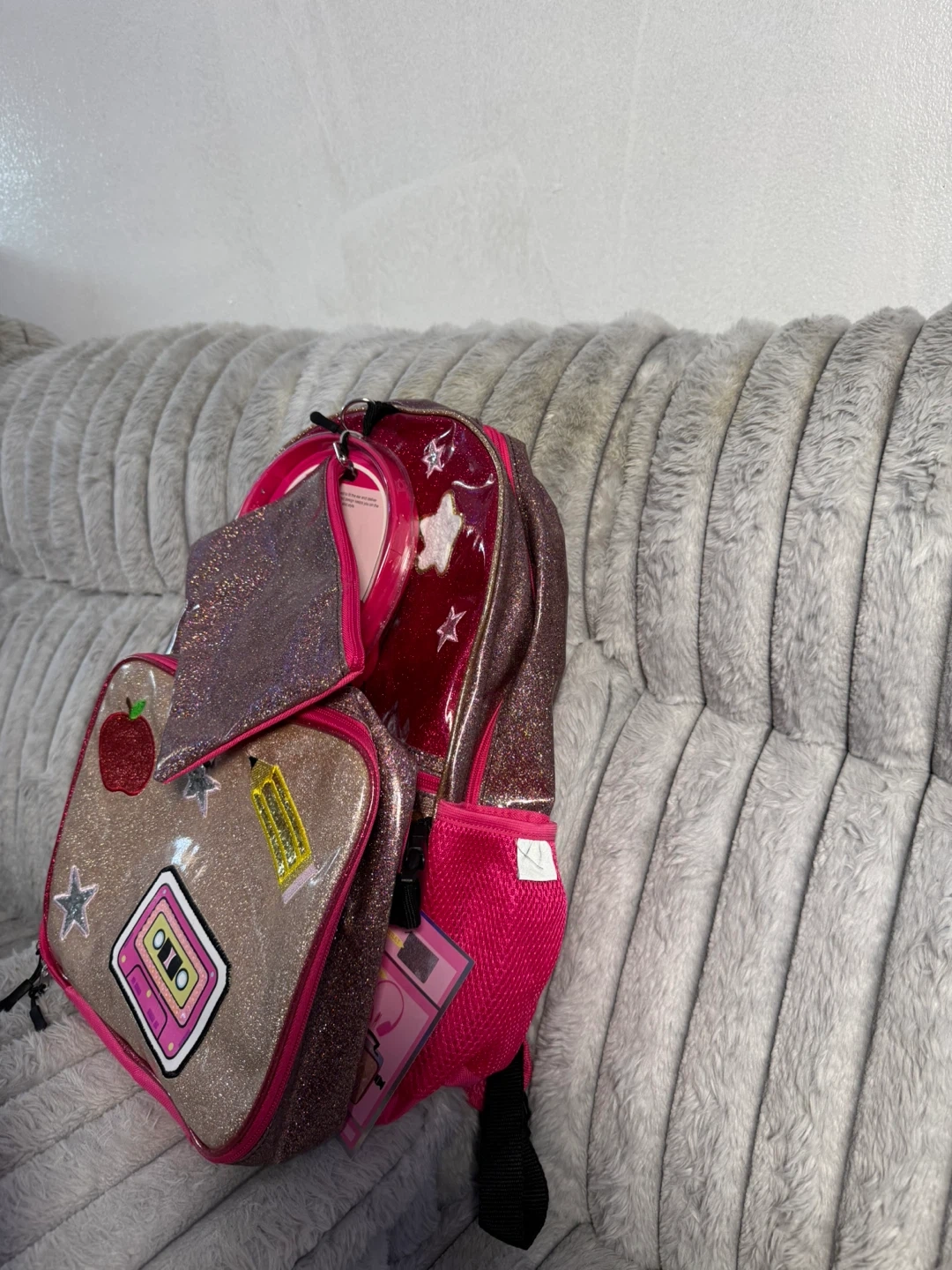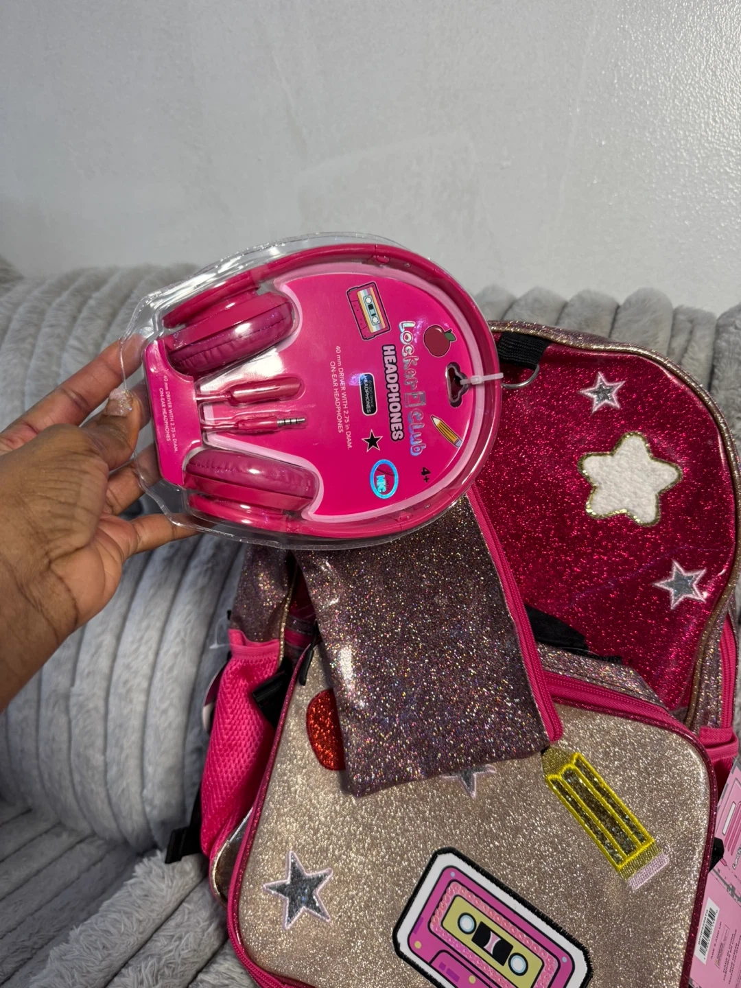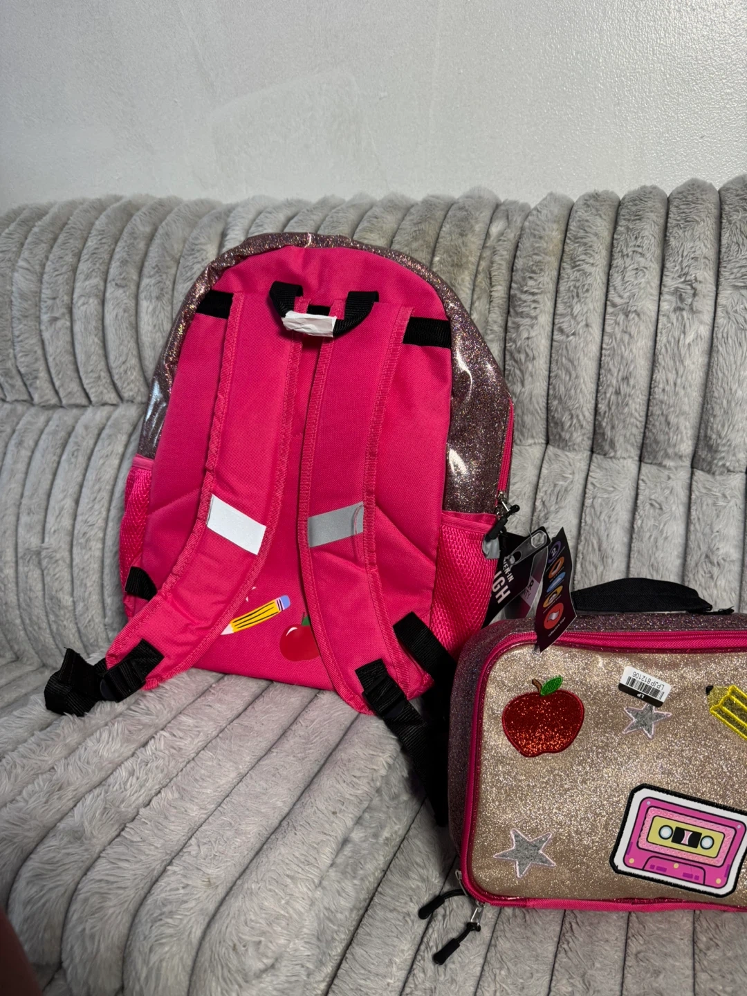 This set includes a pink glitter backpack with a pencil case and headphones. The lunch bag is also glittery and decorated with patches. It's a fun set for school or travel!