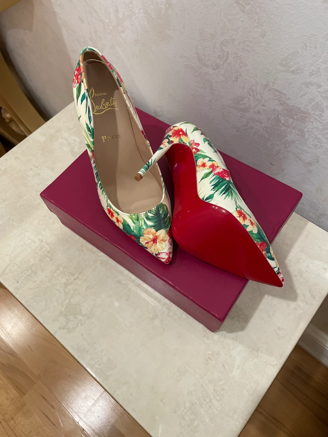 Beautiful Christian Louboutin heels featuring a vibrant floral print. These iconic Paris pumps showcase a classic stiletto heel and the signature red sole. Comes with original box.
