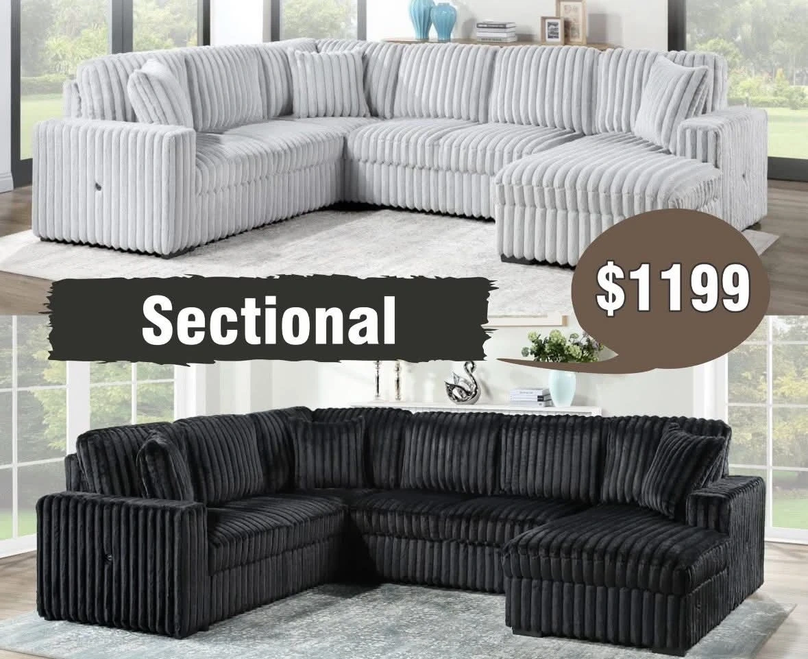 65Selling a stylish sectional sofa! It features a unique corduroy design in both gray and black. It's perfect for adding a modern touch to your living room. Originally priced at $1199