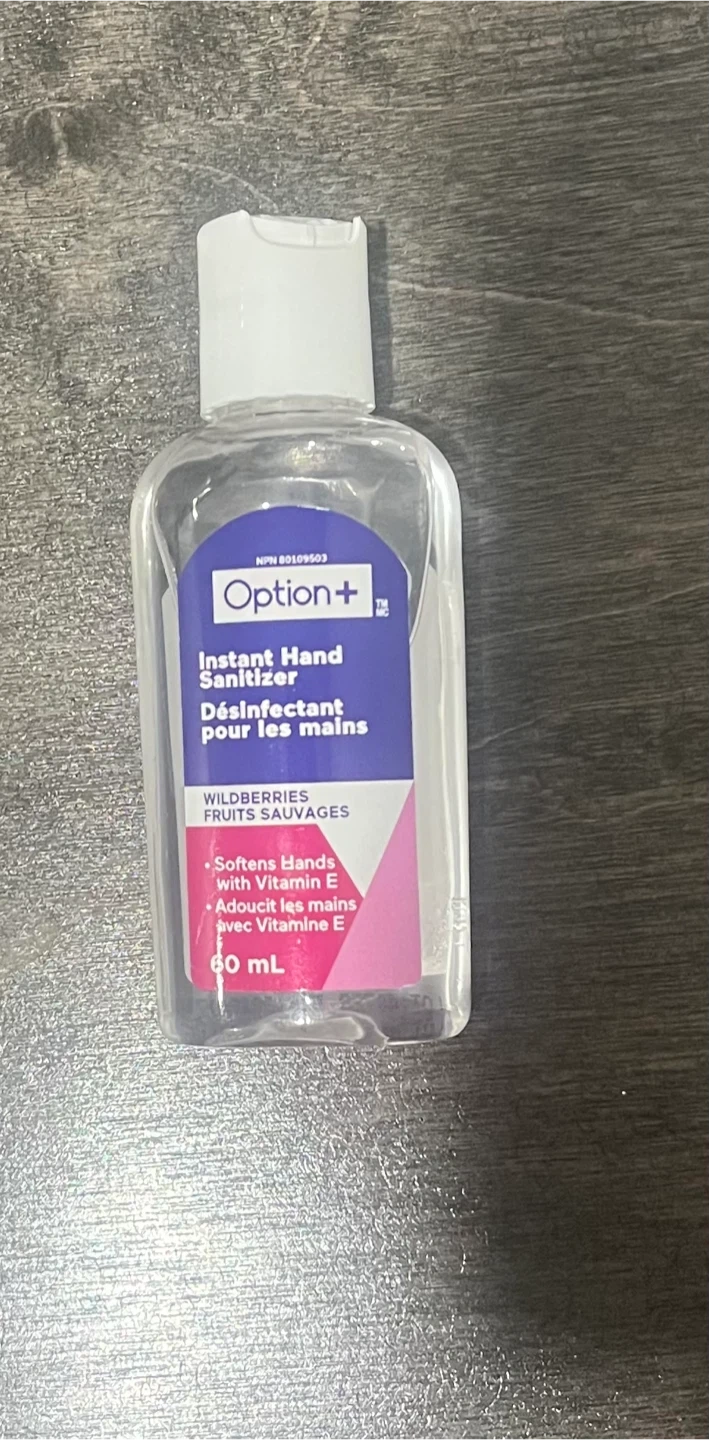Selling a bottle of Option+ instant hand sanitizer. It's a convenient size at 60 mL, perfect for on-the-go use. The sanitizer contains vitamin E and has a wildberries scent, leaving your hands feeling soft and refreshed. The expiry date is: 2026-07. It has never been used and is in the original packaging.