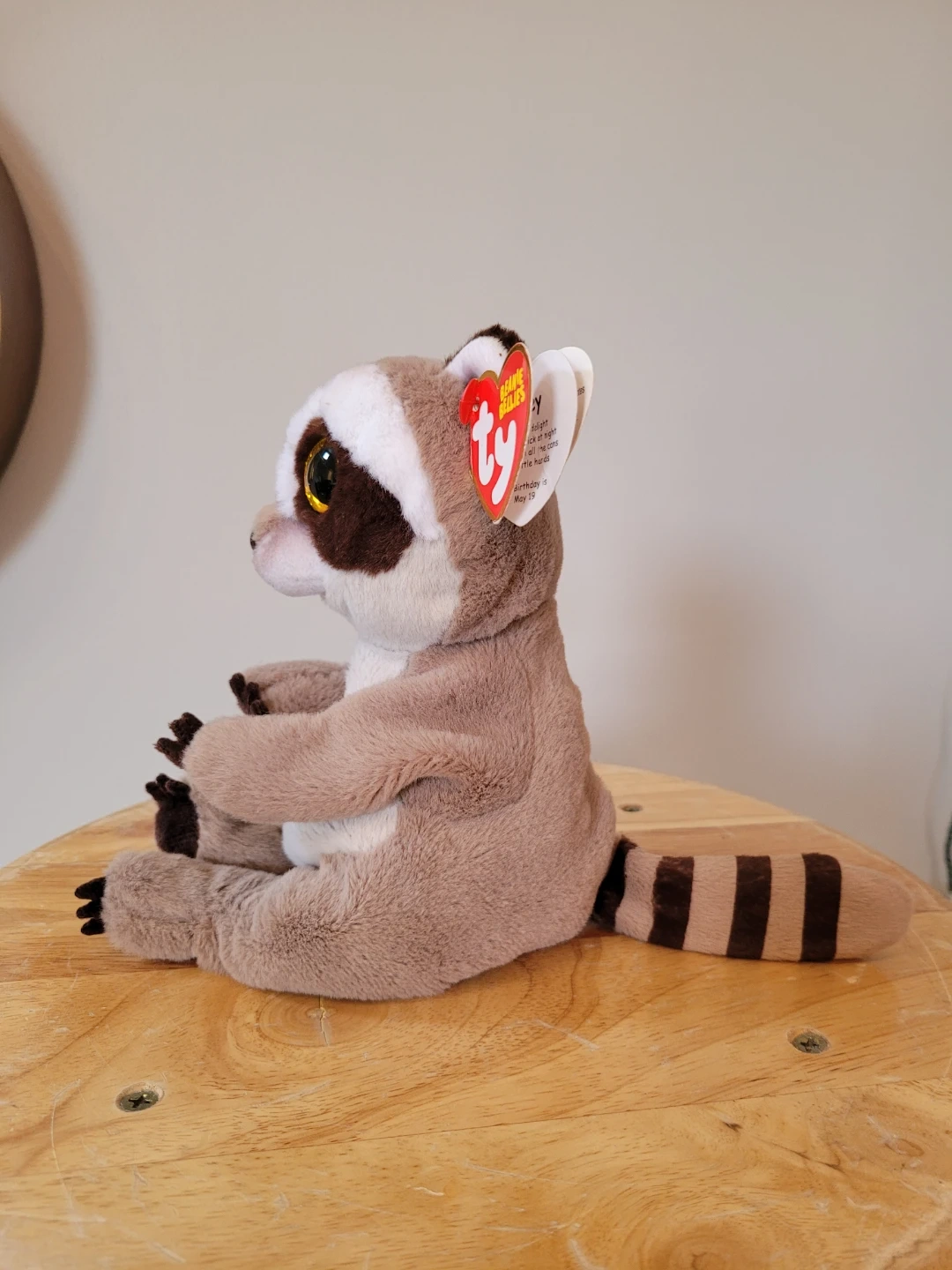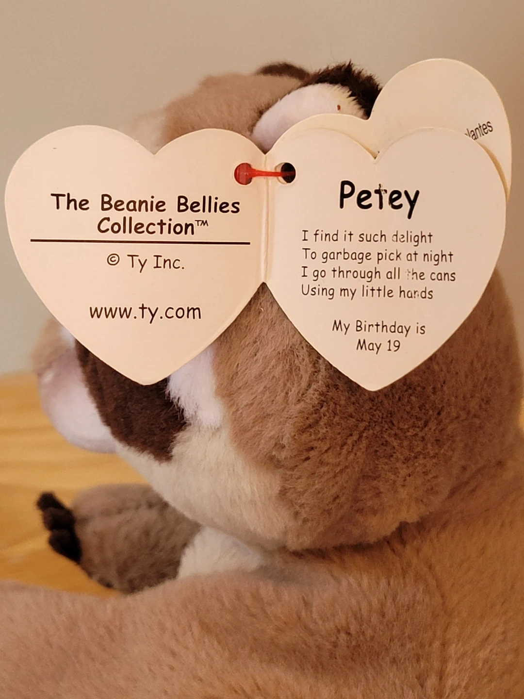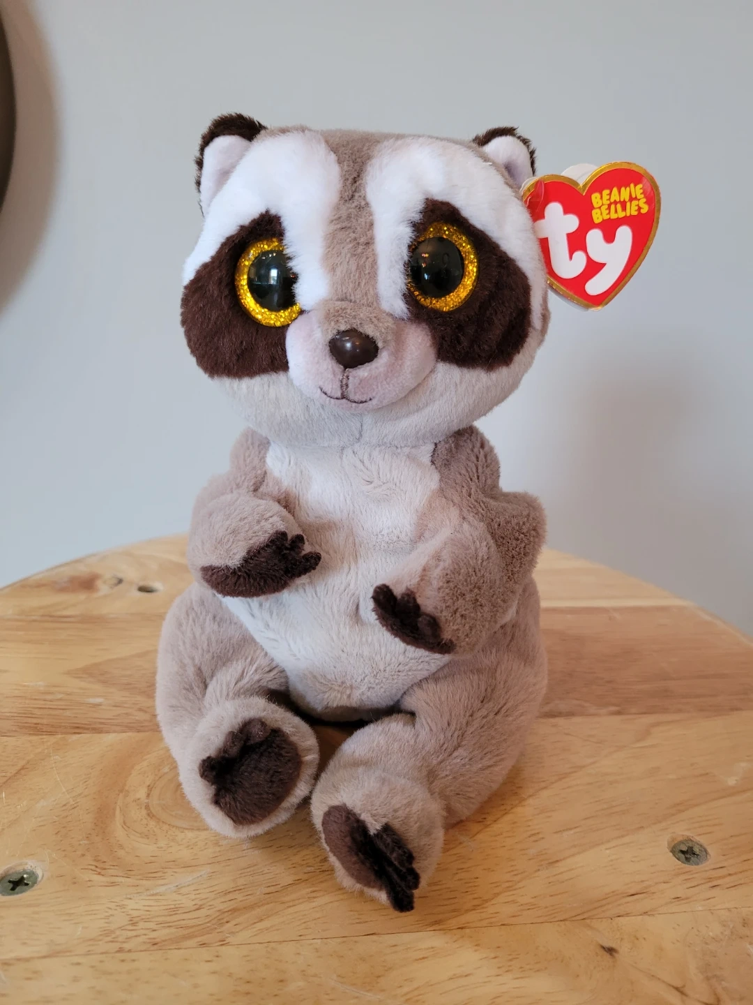 This is a "Petey" raccoon plush from Beanie Bellies TY . It's a soft, collectible stuffed animal with sparkly eyes and a striped tail. Perfect for you or kids who love raccoons! Good condition just ear tag shows a little wear and crease.