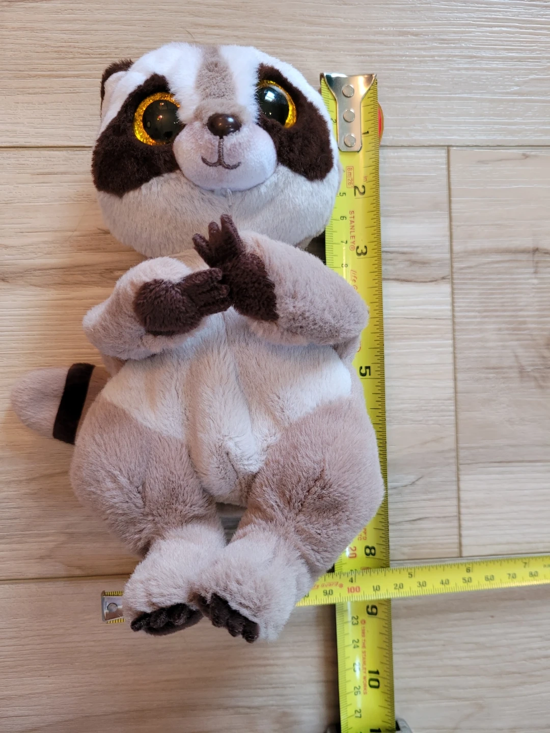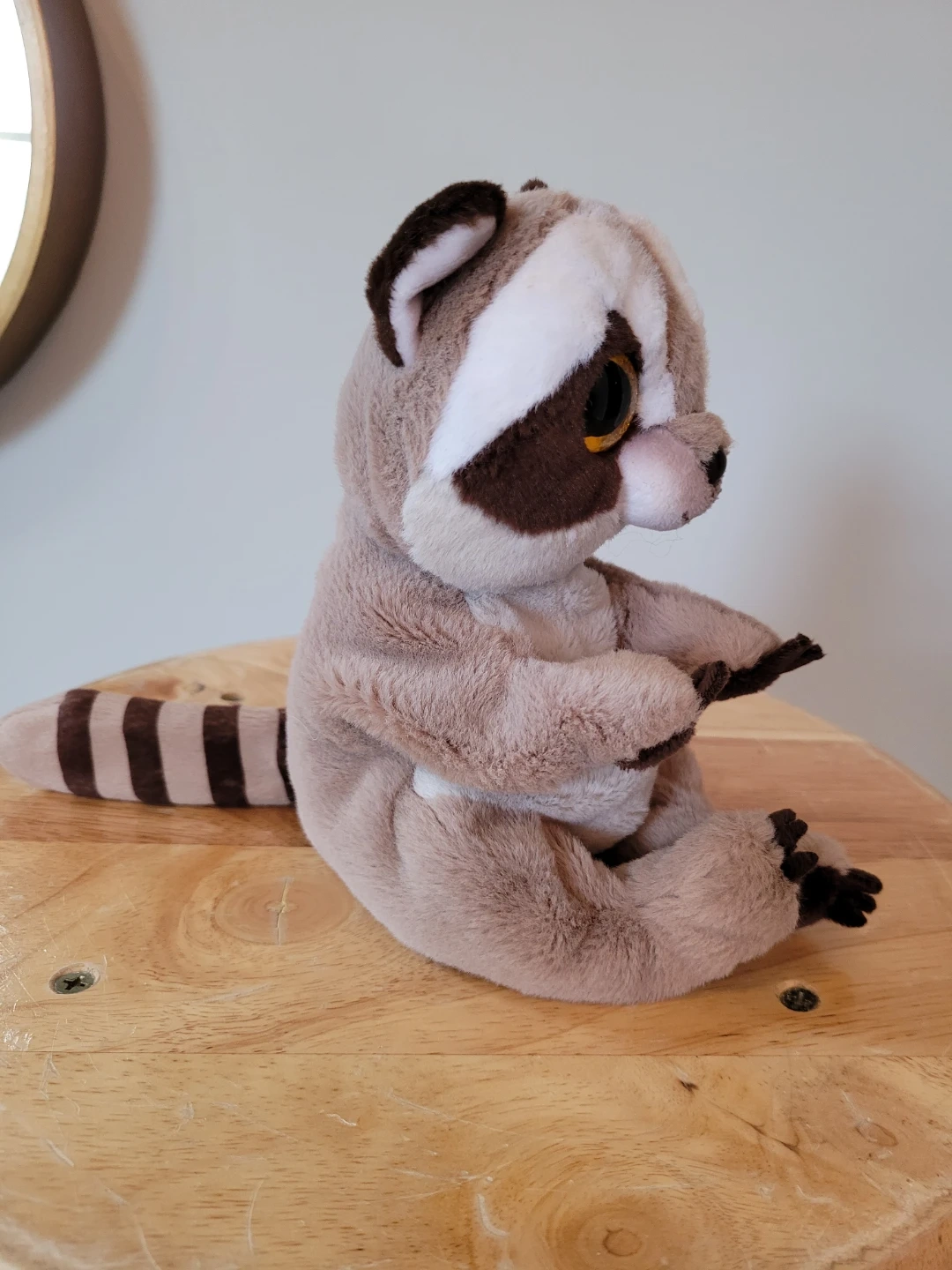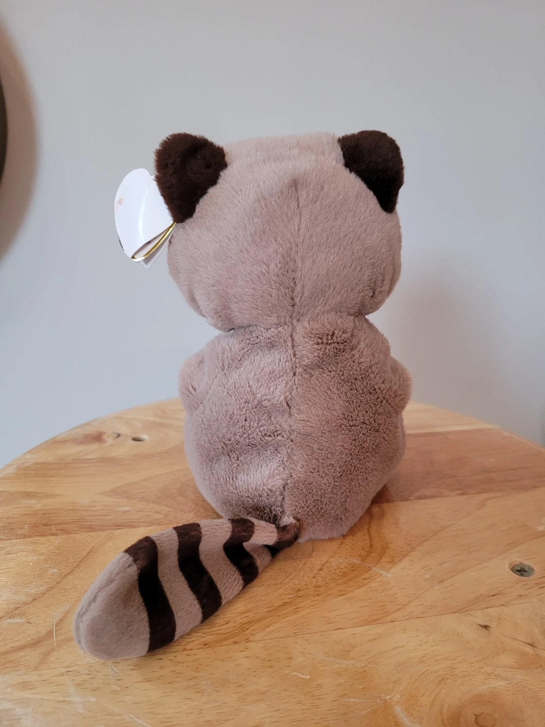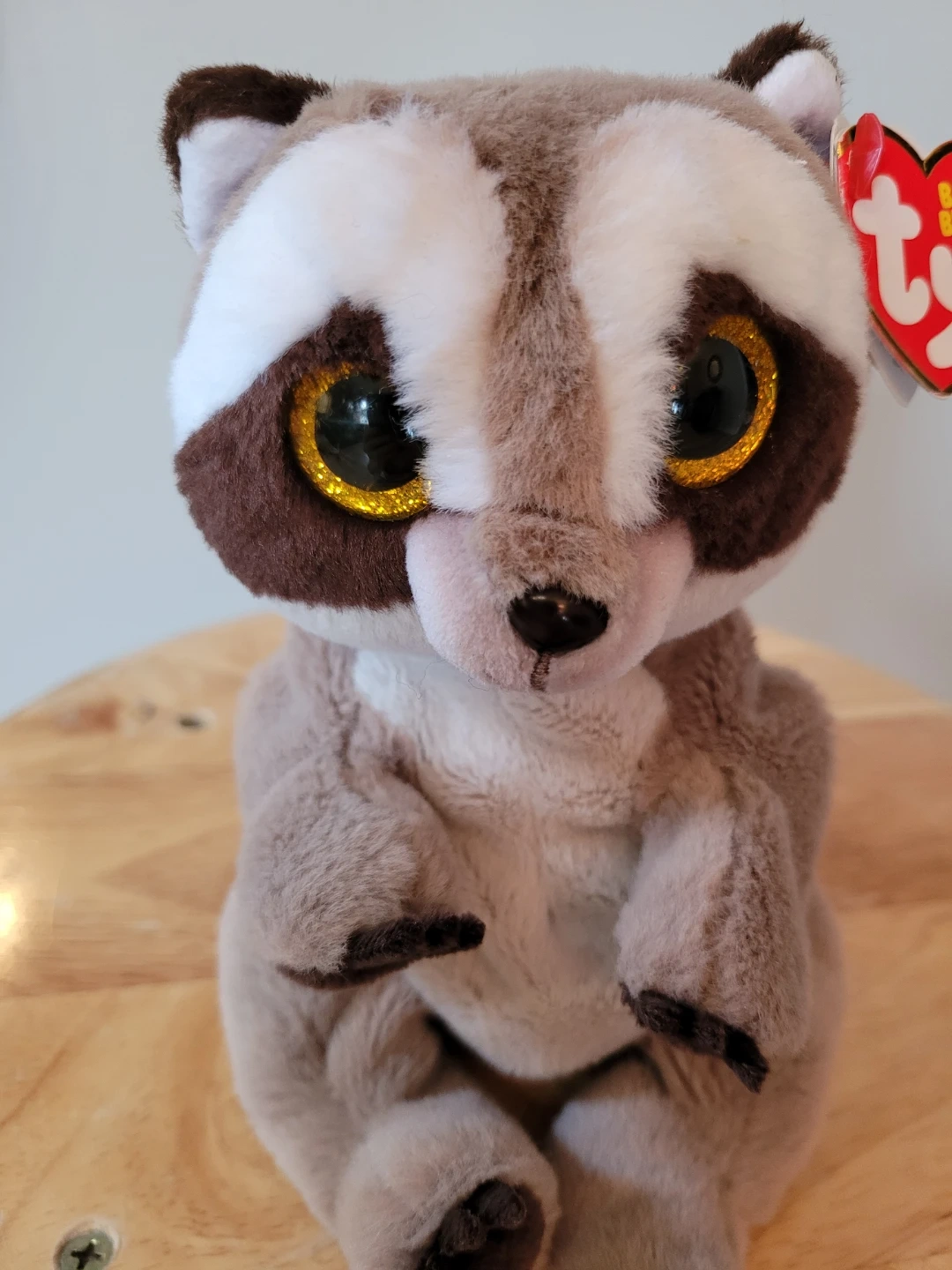 This is a "Petey" raccoon plush from Beanie Bellies TY . It's a soft, collectible stuffed animal with sparkly eyes and a striped tail. Perfect for you or kids who love raccoons! Good condition just ear tag shows a little wear and crease.