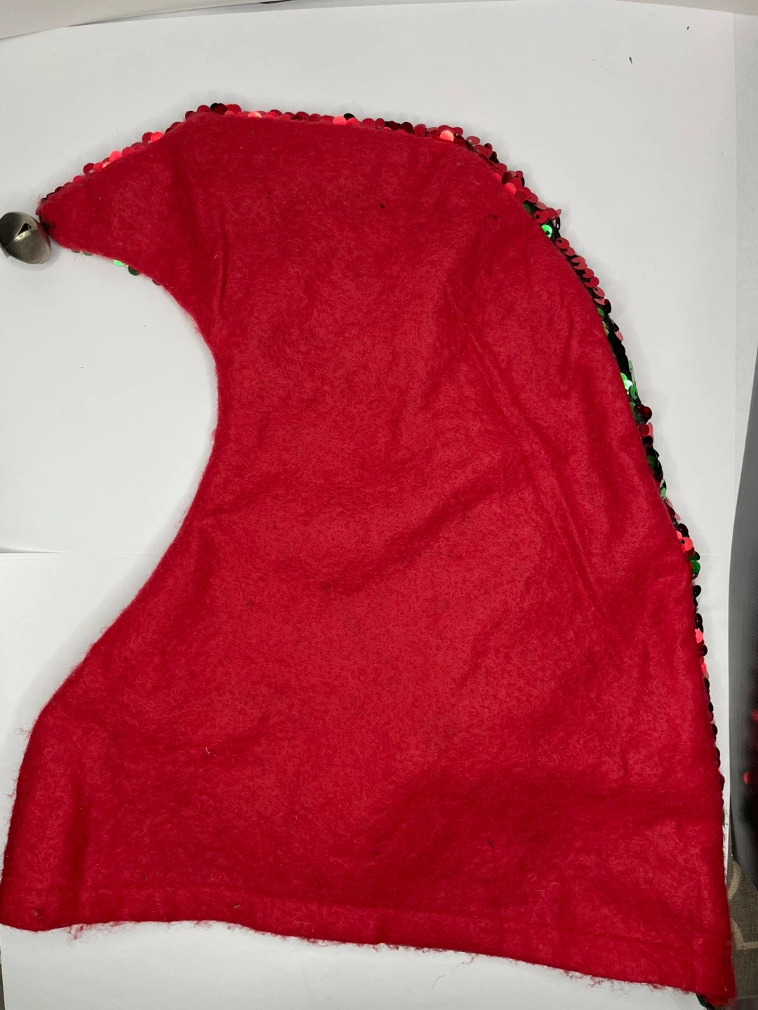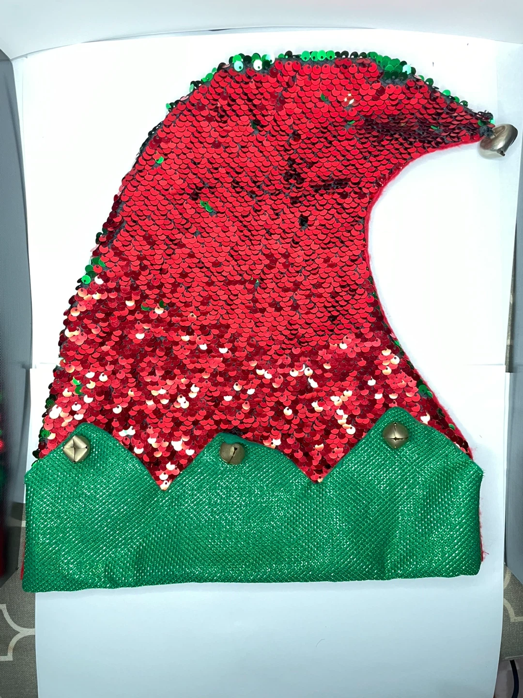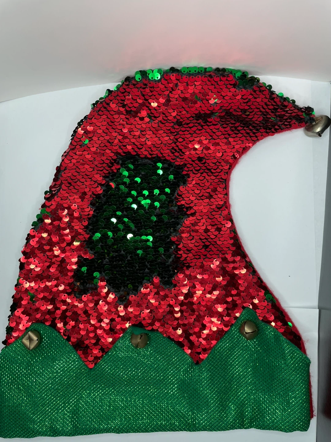 Add some sparkle to your holiday season with this fun sequin elf hat! It features a vibrant red and green design, complete with little bells. Perfect for parties or festive gatherings! (30 cm - 12 inch)