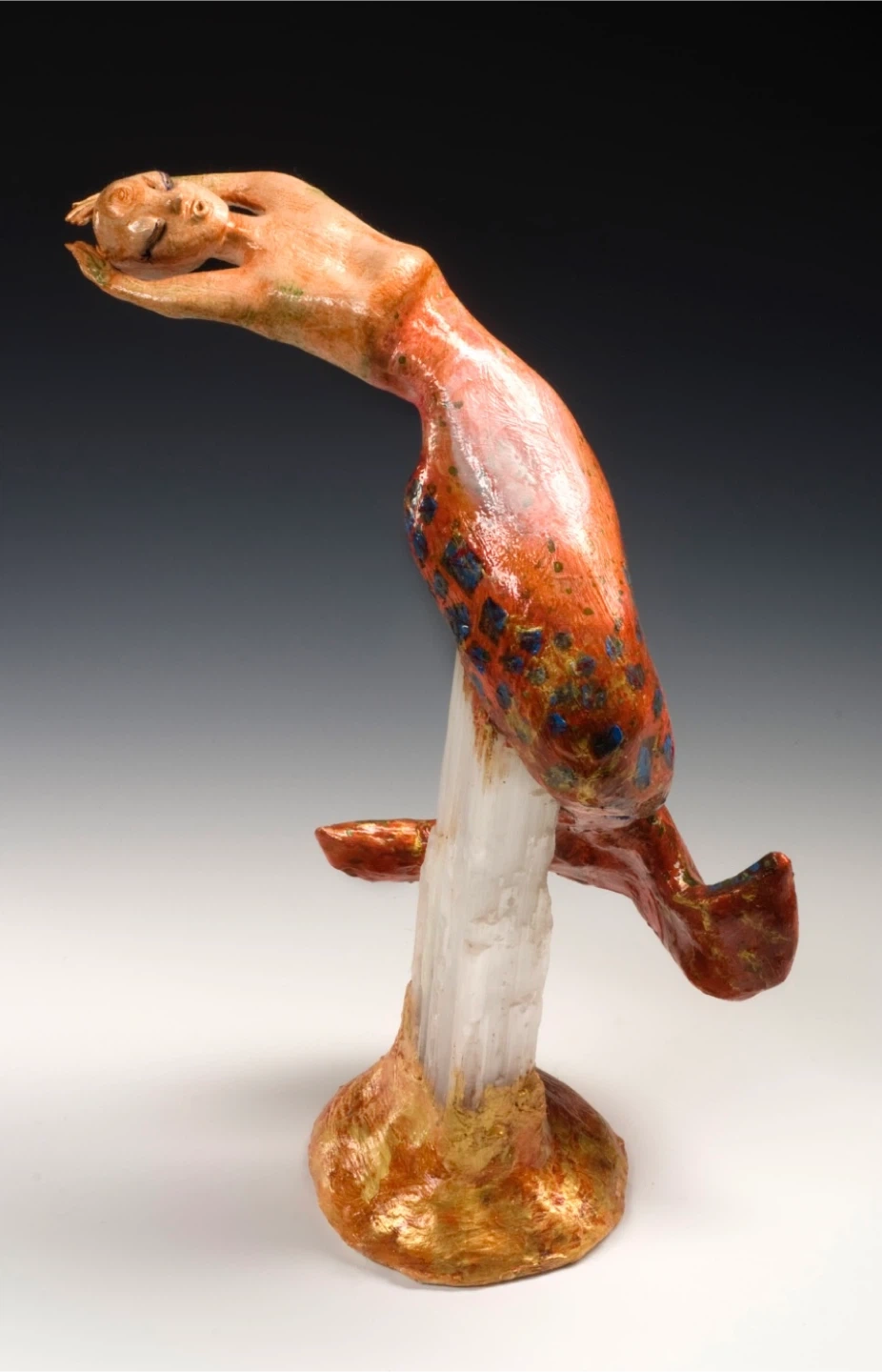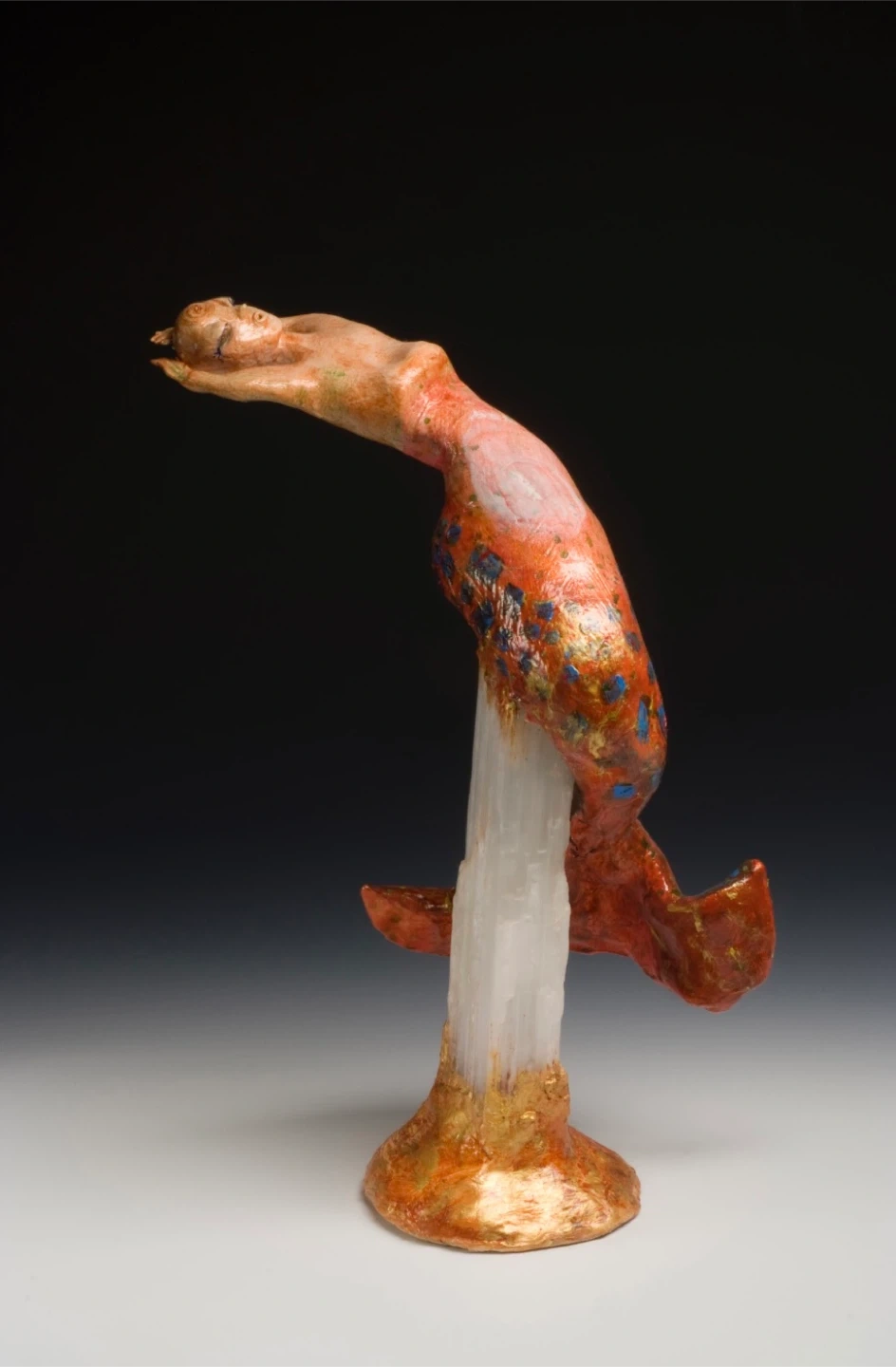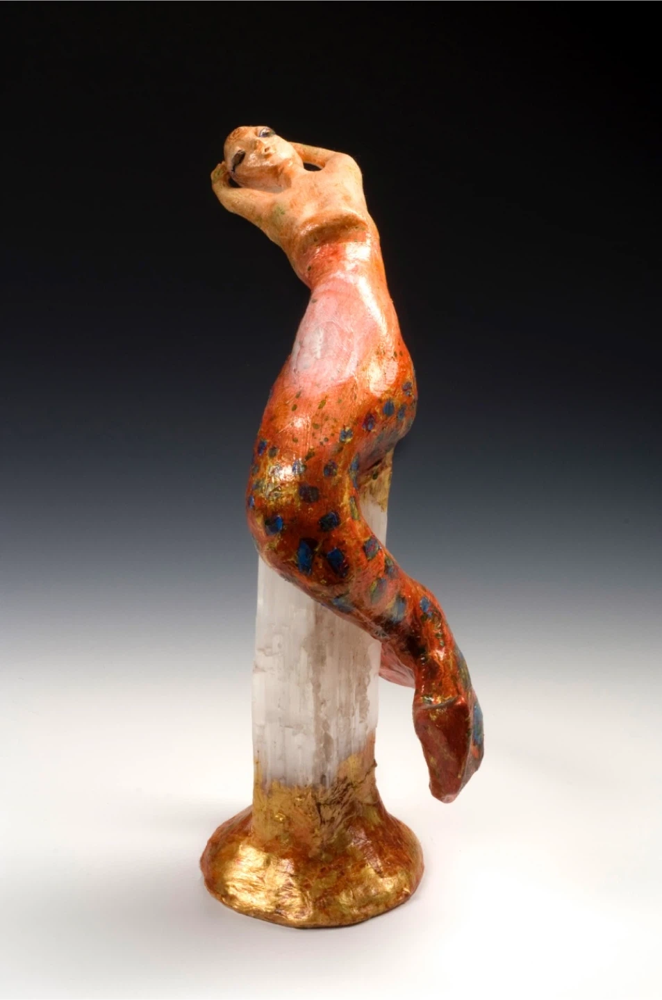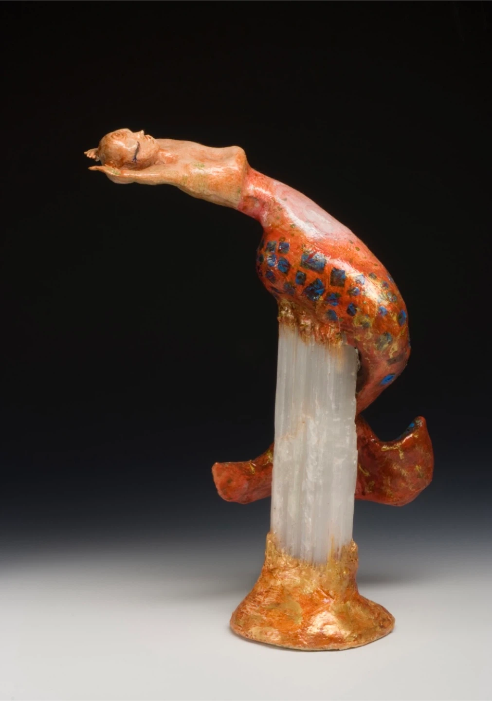 15Unique clay and crystal sculpture of a mermaid figure, featuring a vibrant orange and blue scale pattern. The mermaid is posed gracefully on a white, crystal pillar. This piece would be a lovely addition to any art collection or home decor. Excellent Holiday Gift. Original created by artist. Only one in the world!