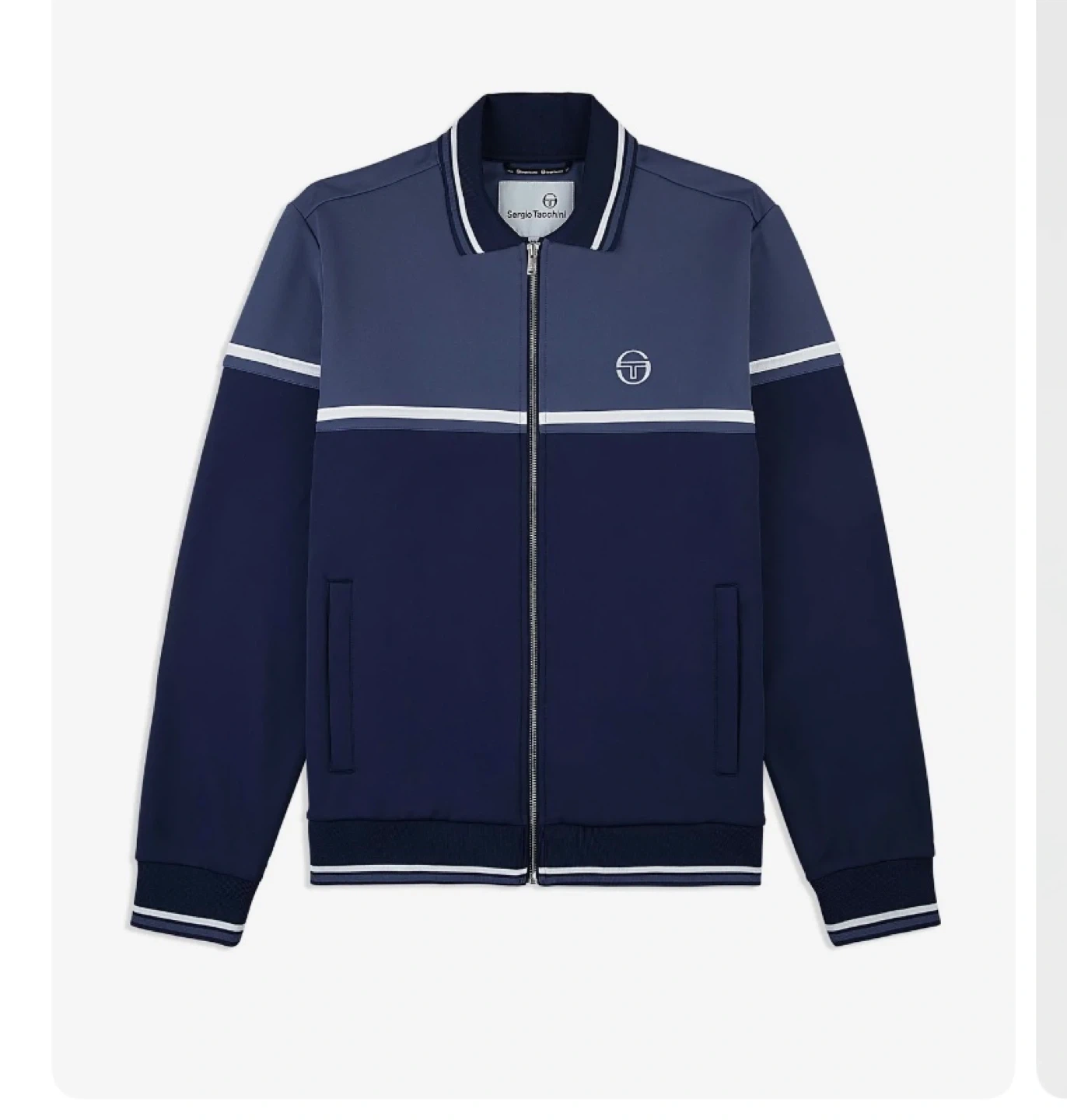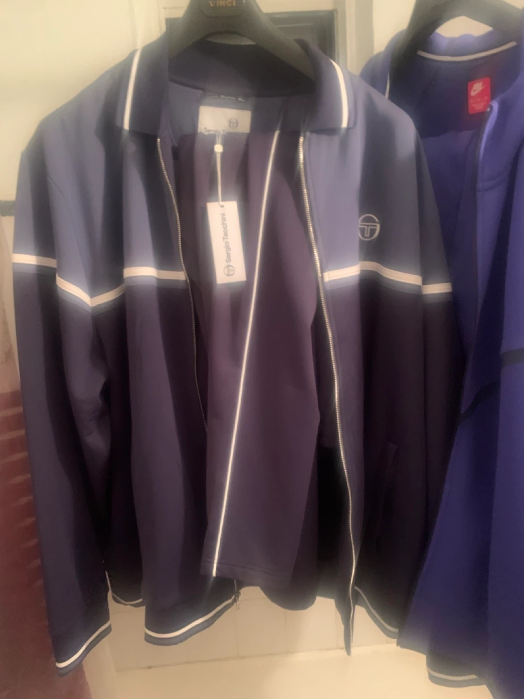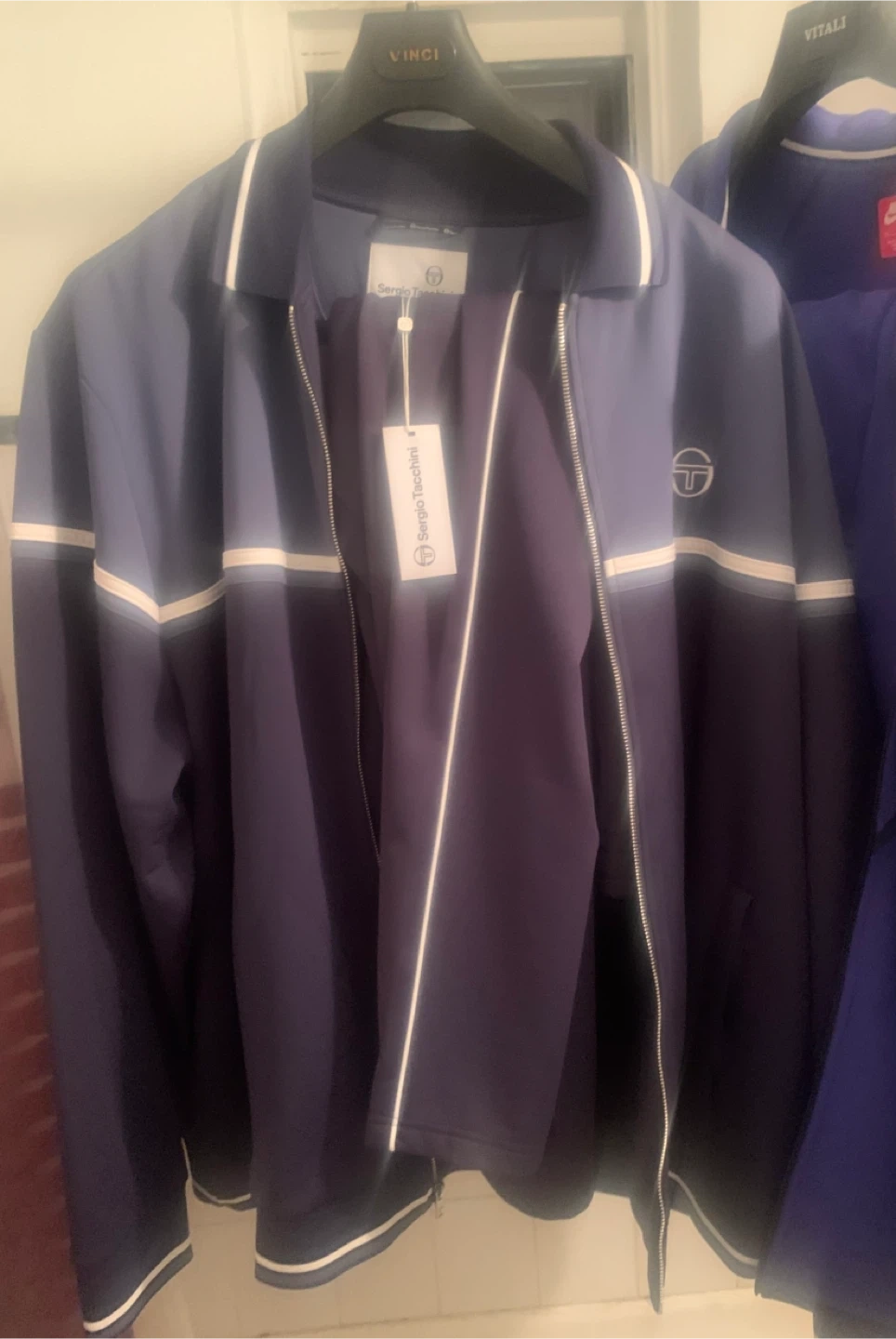 65Here's a stylish Sergio Tacchini track jacket for sale! It features a cool color block design in shades of blue with white stripes. Perfect for a sporty and casual look!