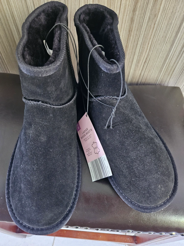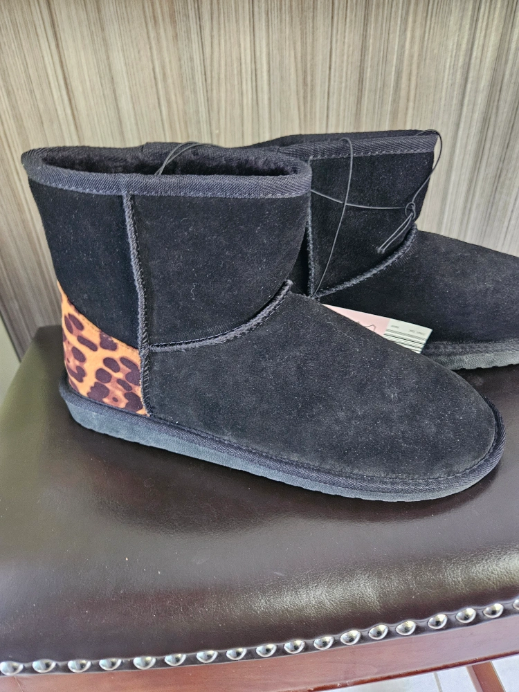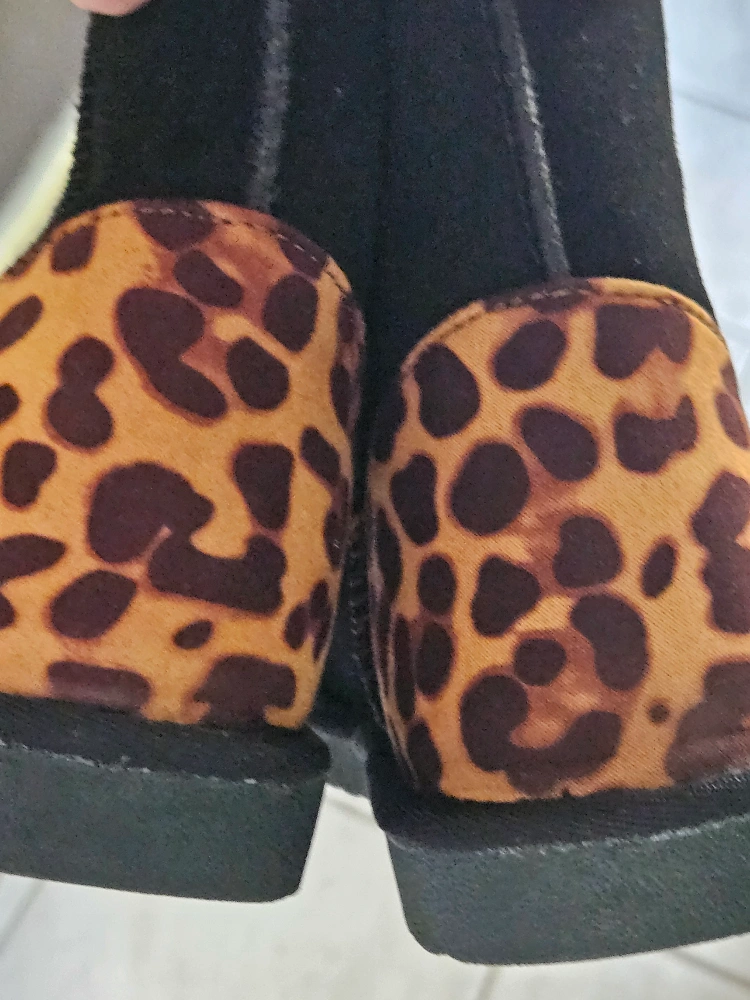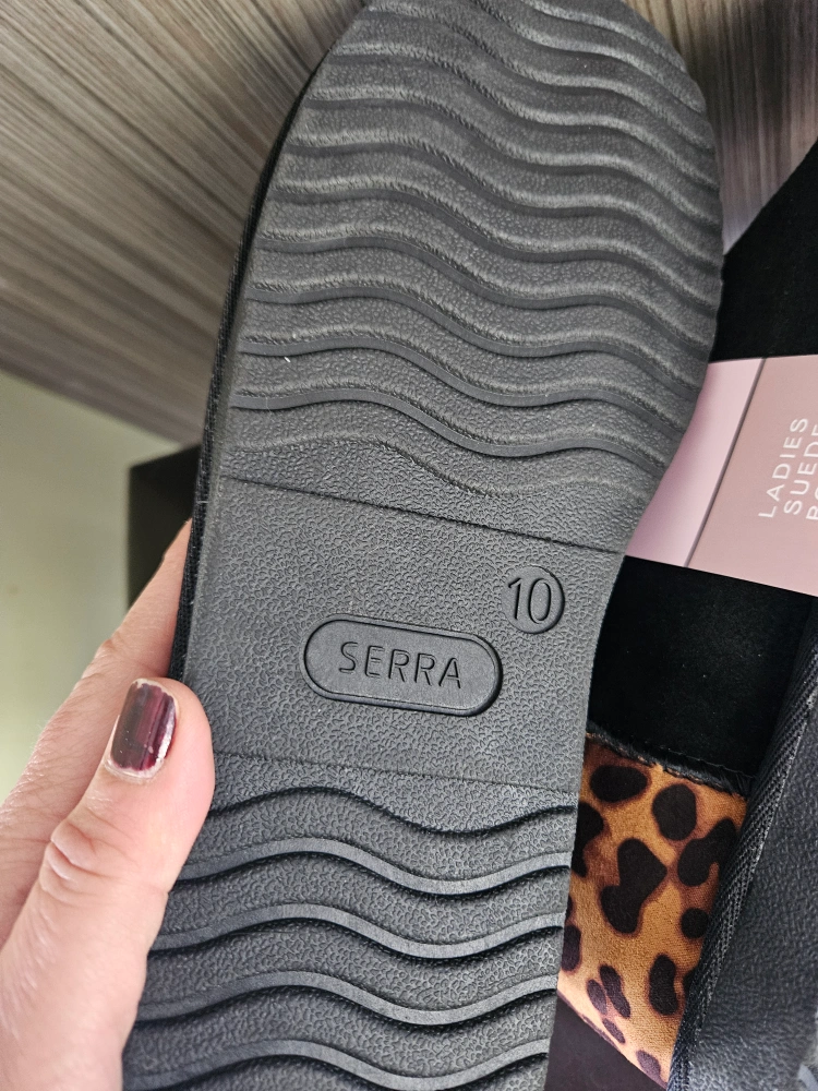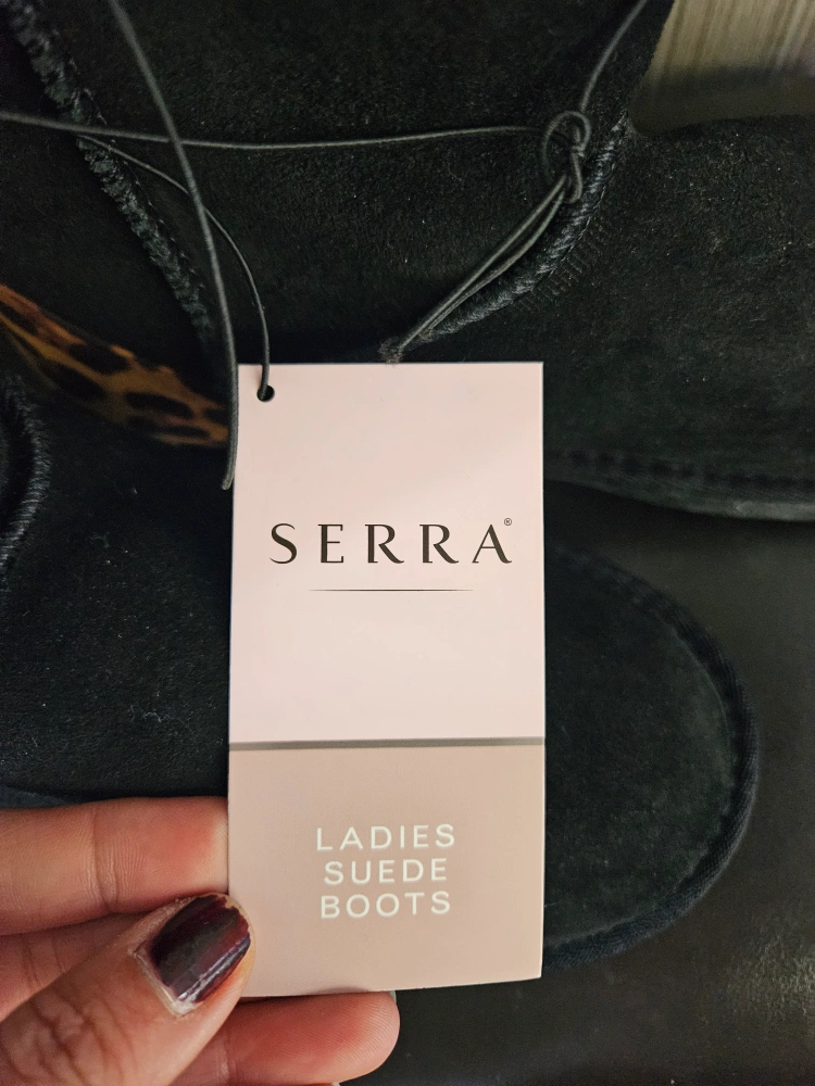 I'm selling a pair of SERRA ladies suede boots in size 10. They are black with a fun leopard print detail on the back. These boots are perfect for adding a touch of style to your outfit!