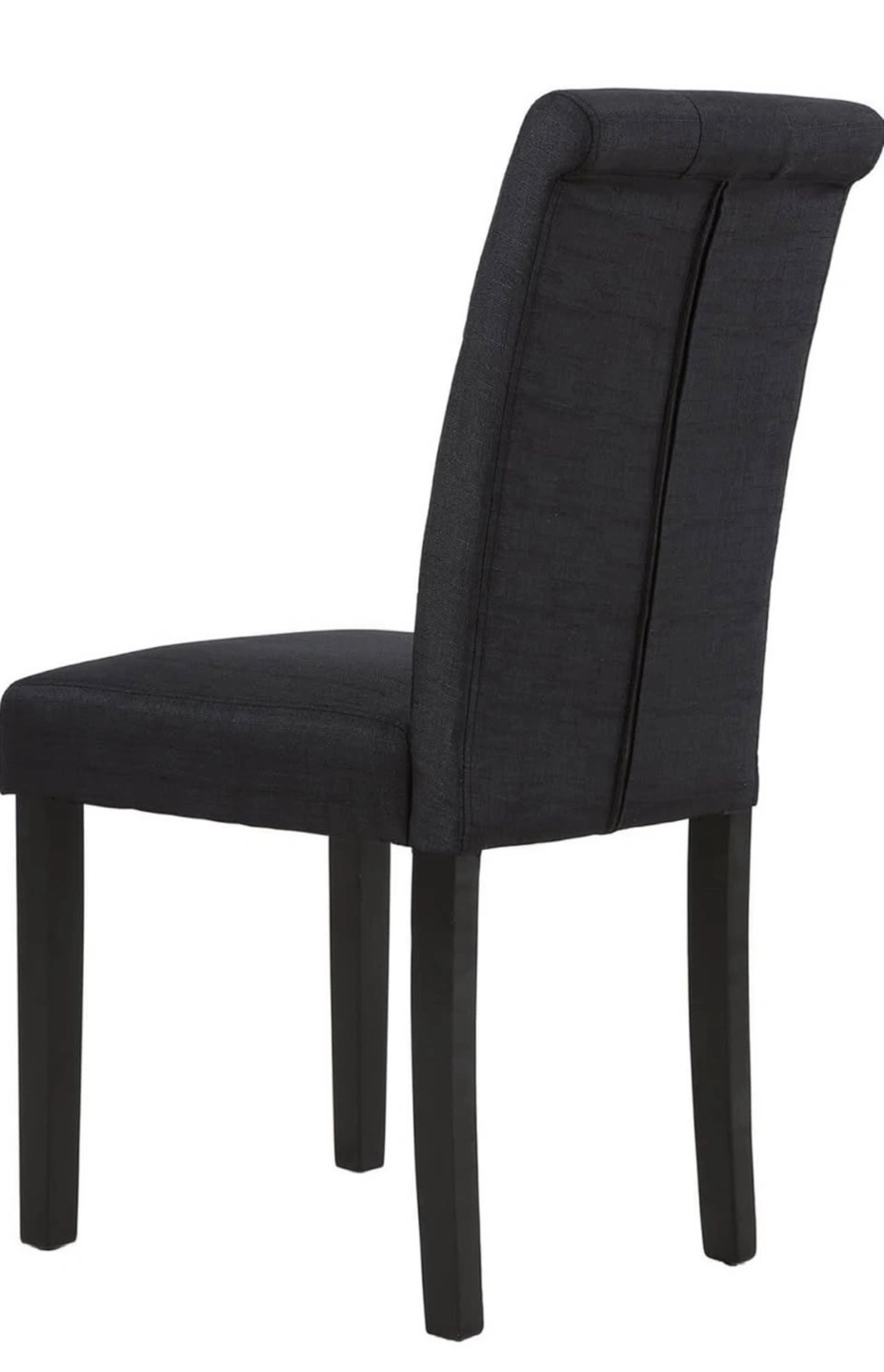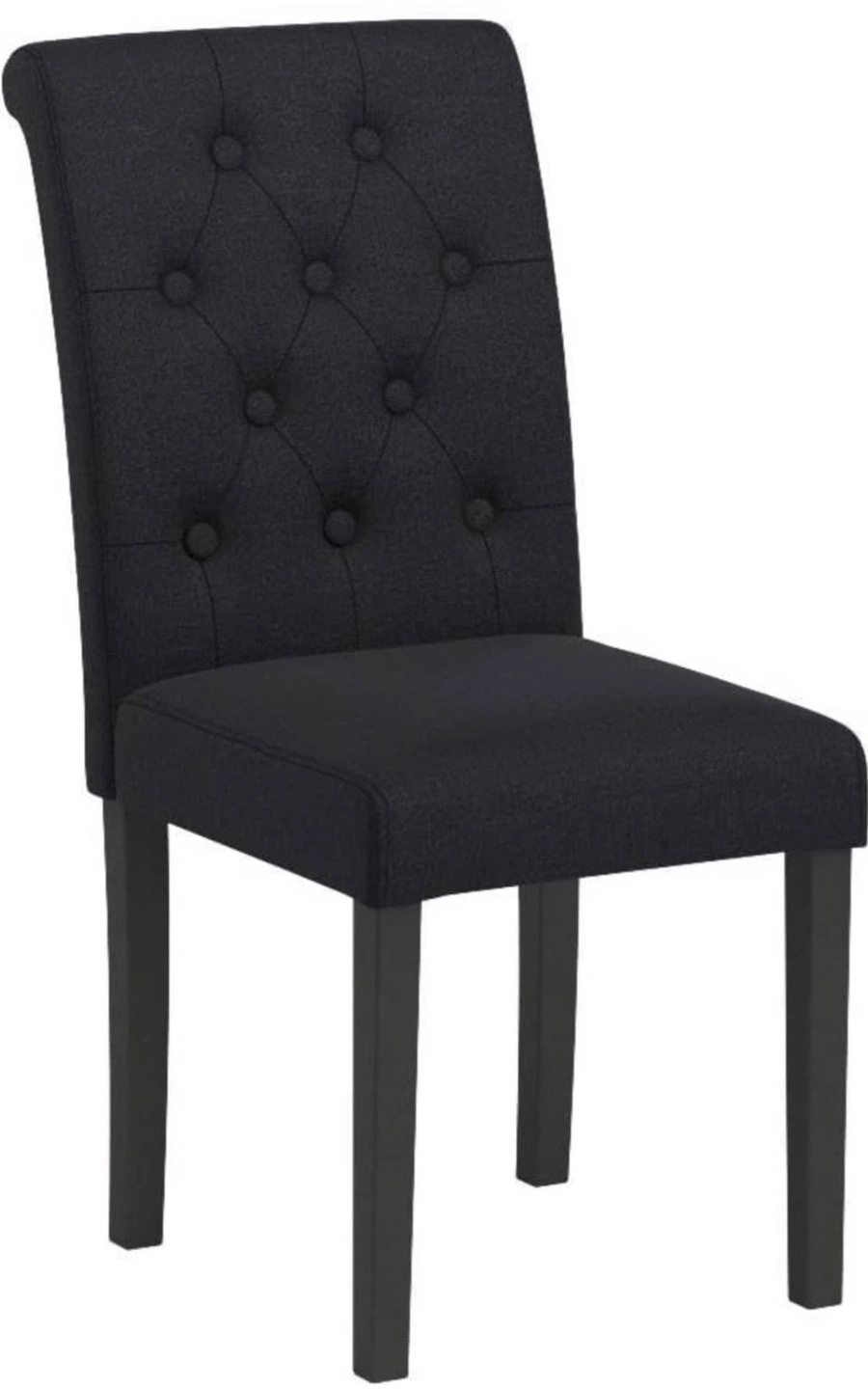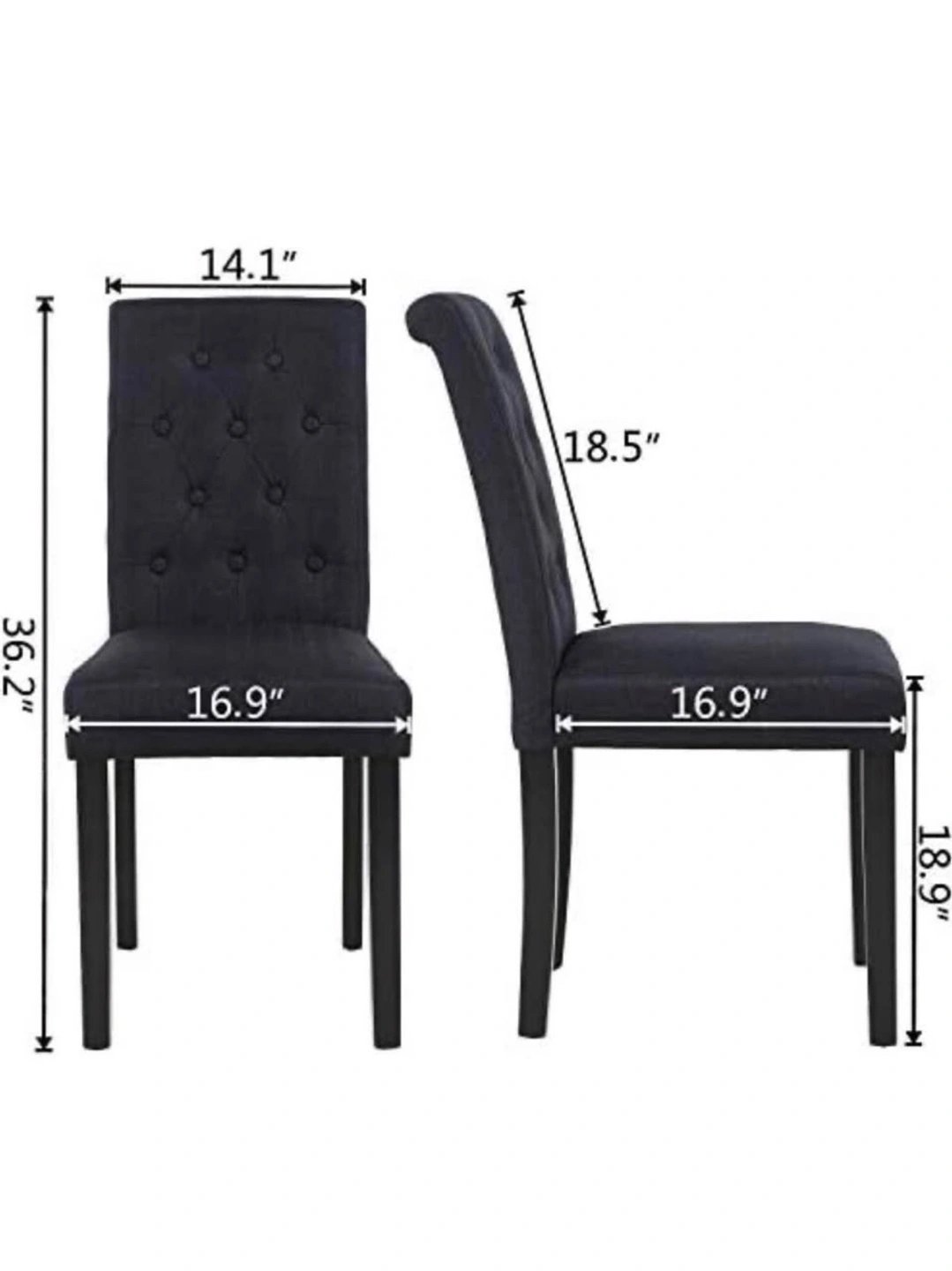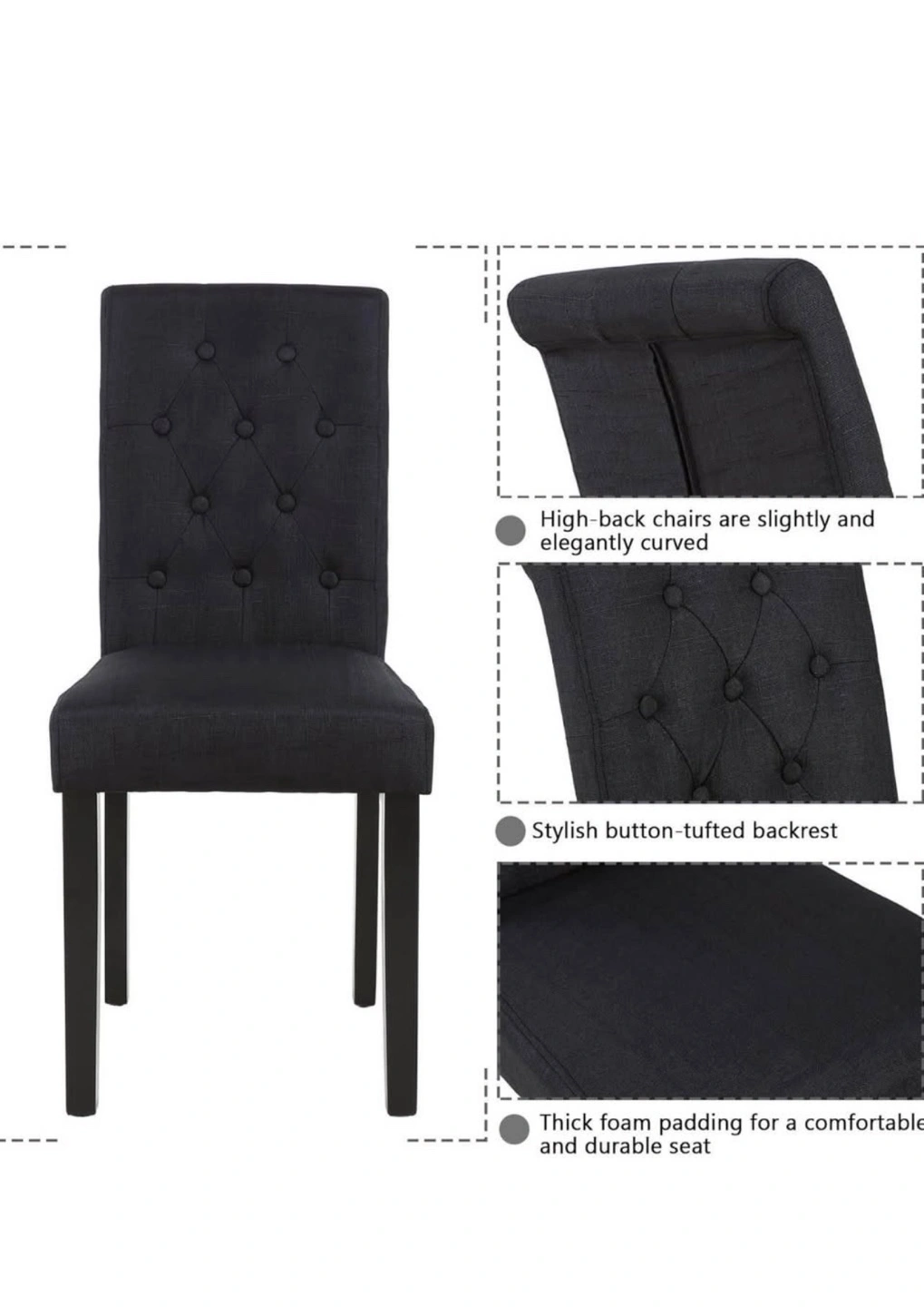 60Elegant black dining chairs. Dark wood legs. Button-tufted backrest. Comfortable and durable. High back chairs. Slightly curved. Stylish design. Perfect for any dining room. Measurements, see pictures.