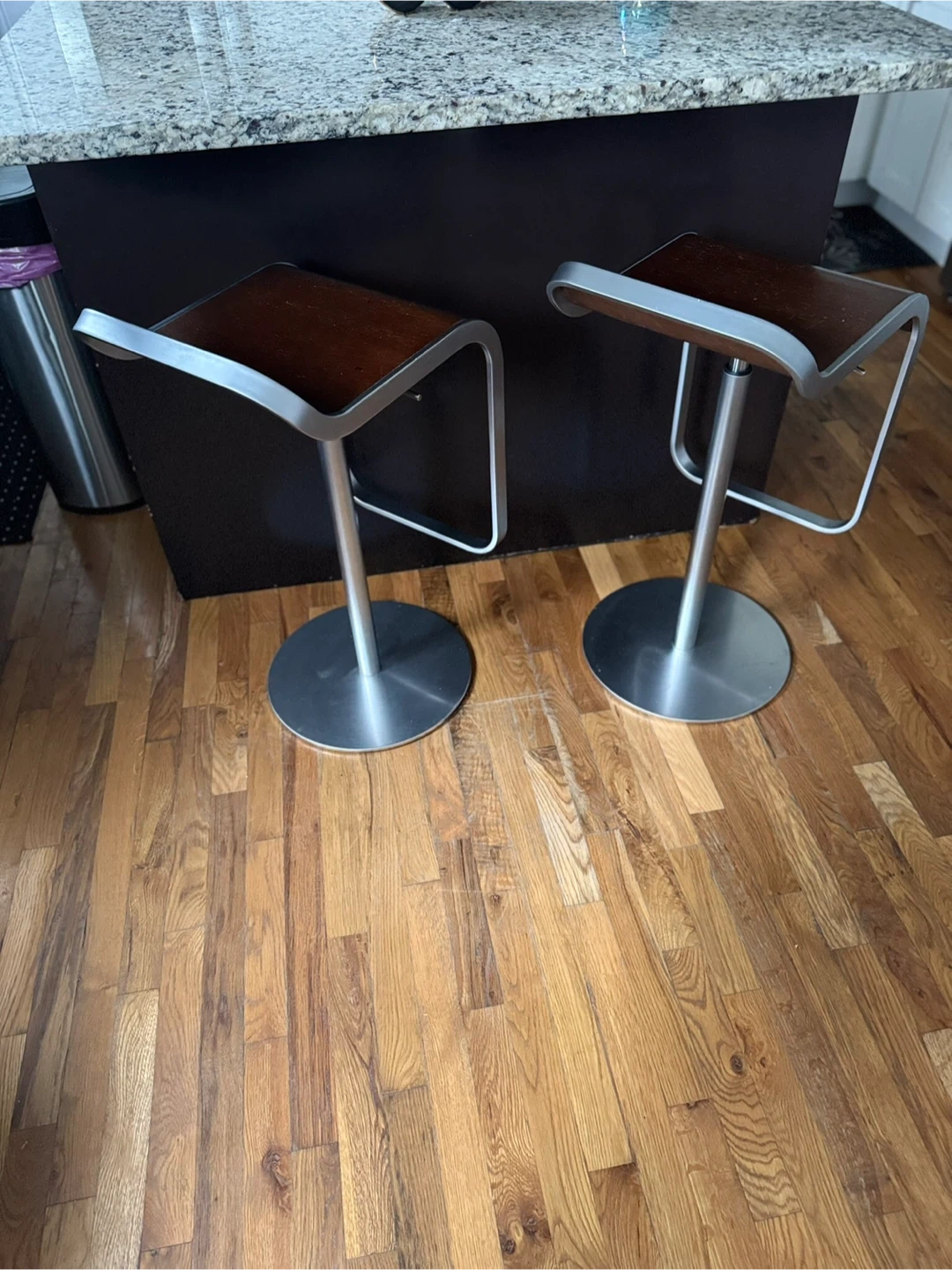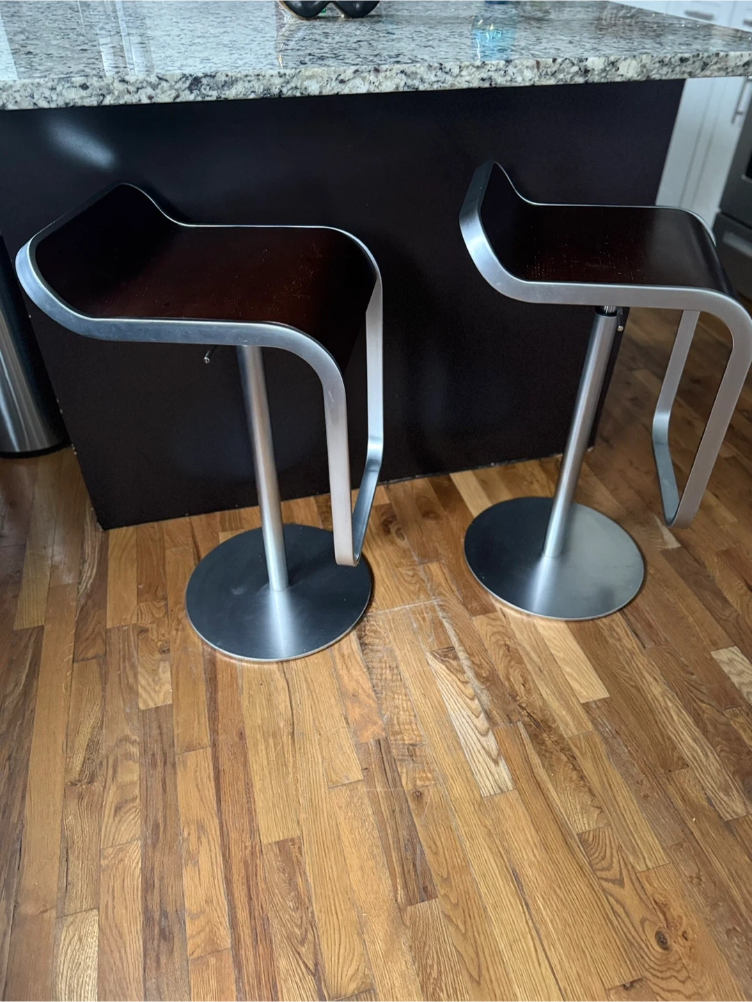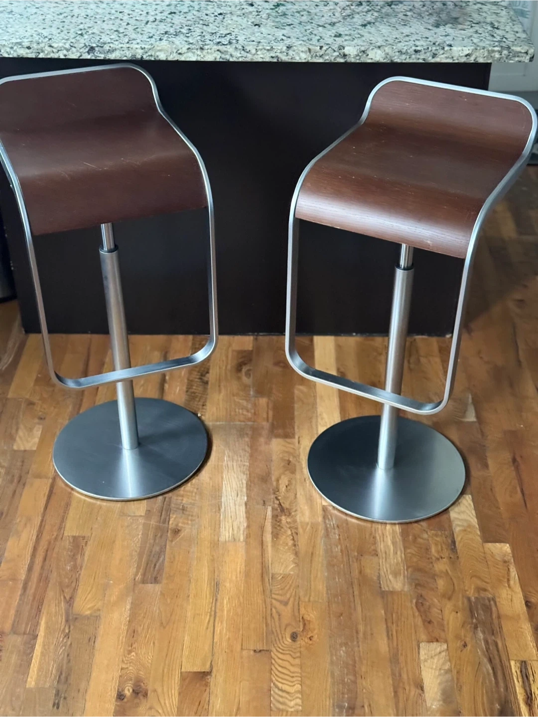 87Set of 2 Authentic Lapalma LEM Piston Stool with Dark Stained Oak. Condition is Used - Light marking on wood from moving. Retail at Design Within Reach for $895 Each The sculptural seat not only swivels but also adjusts easily from counter height to bar height with a lever that activates a gas cylinder. While utility strongly determines its form, this unique stool also has a visual lightness that creates the illusion of freedom from gravity Dimensions Seat – 16.5” x 14.25” Height Adjustable – 26.75” to 30.75” Base – 14.75” (L x W x H/D) Condition Good Wear consistent with age and use. The stools show mild wear, nicks and scratches, general wear.