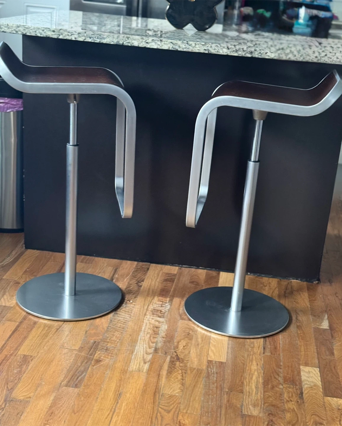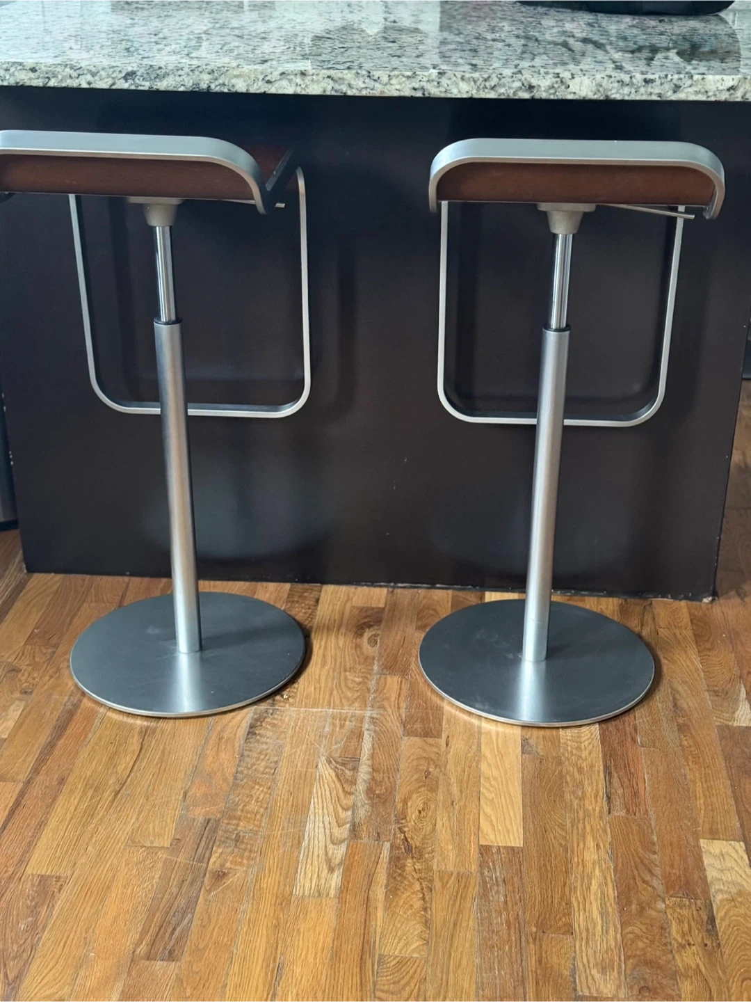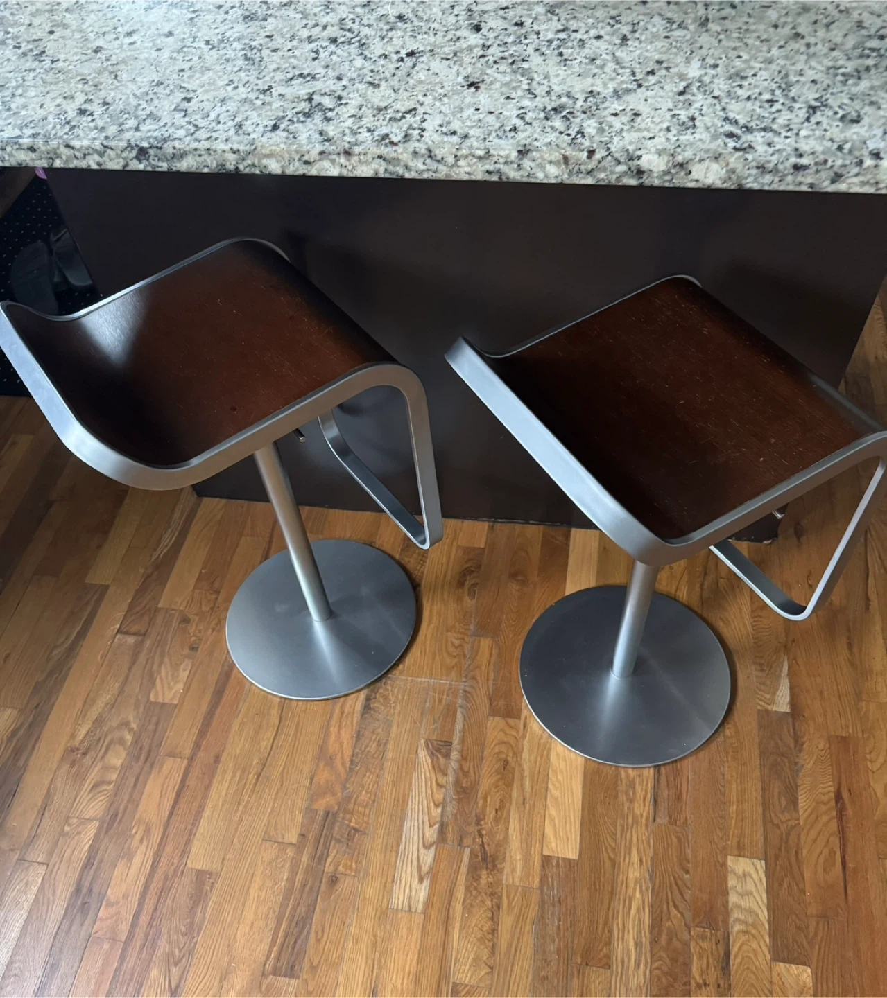 87Set of 2 Authentic Lapalma LEM Piston Stool with Dark Stained Oak. Condition is Used - Light marking on wood from moving. Retail at Design Within Reach for $895 Each The sculptural seat not only swivels but also adjusts easily from counter height to bar height with a lever that activates a gas cylinder. While utility strongly determines its form, this unique stool also has a visual lightness that creates the illusion of freedom from gravity Dimensions Seat – 16.5” x 14.25” Height Adjustable – 26.75” to 30.75” Base – 14.75” (L x W x H/D) Condition Good Wear consistent with age and use. The stools show mild wear, nicks and scratches, general wear.