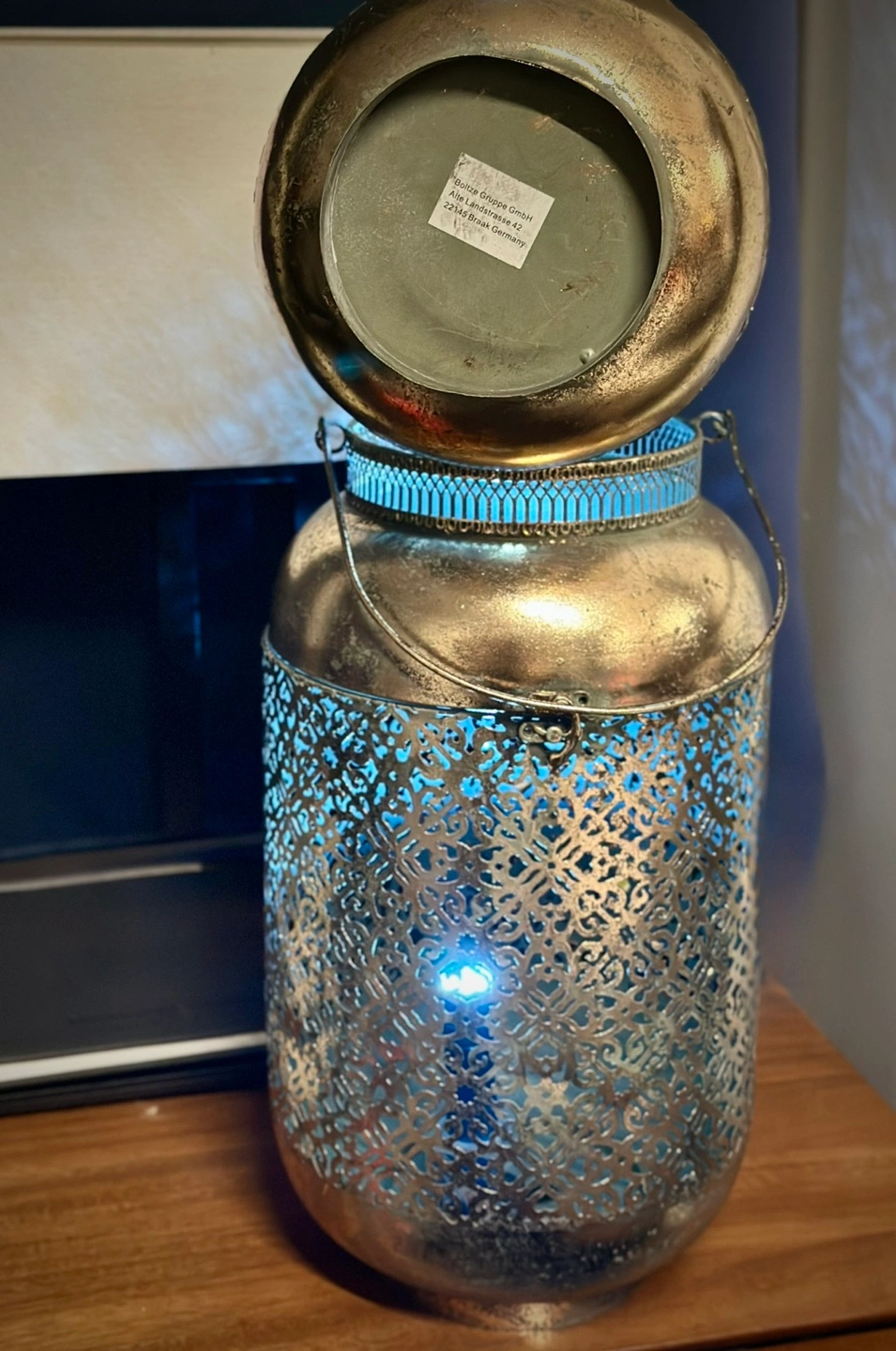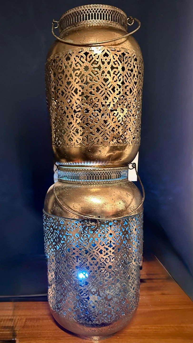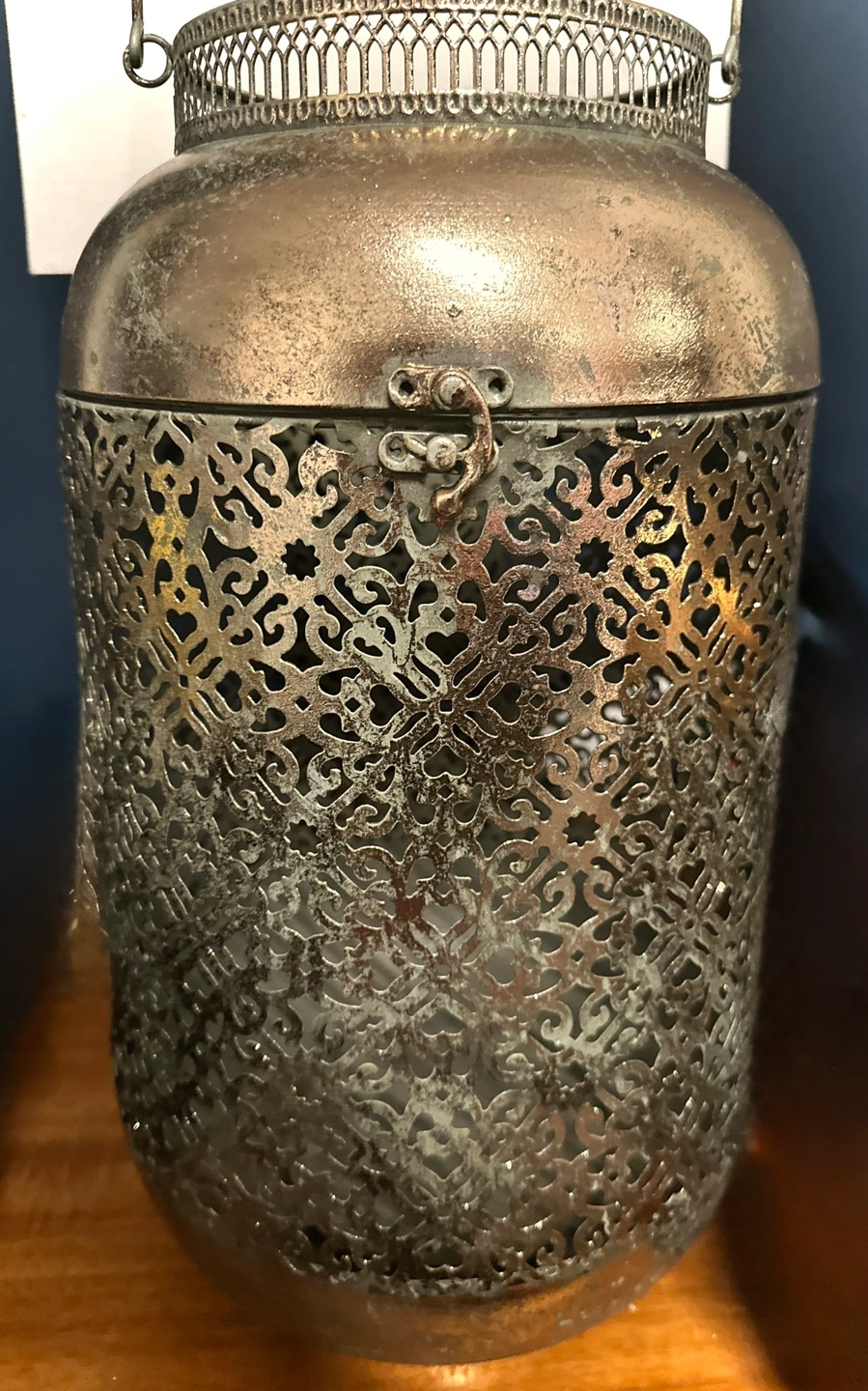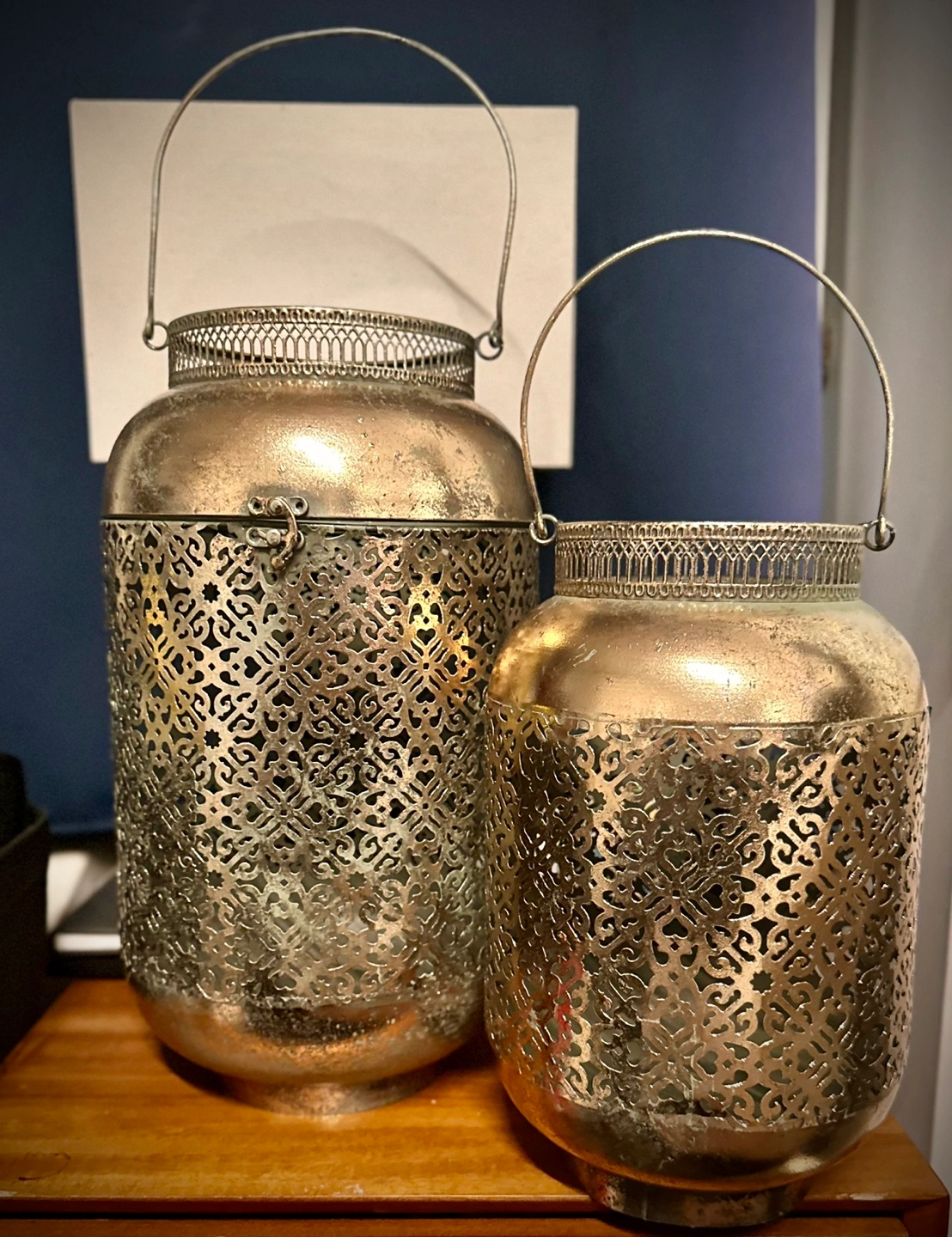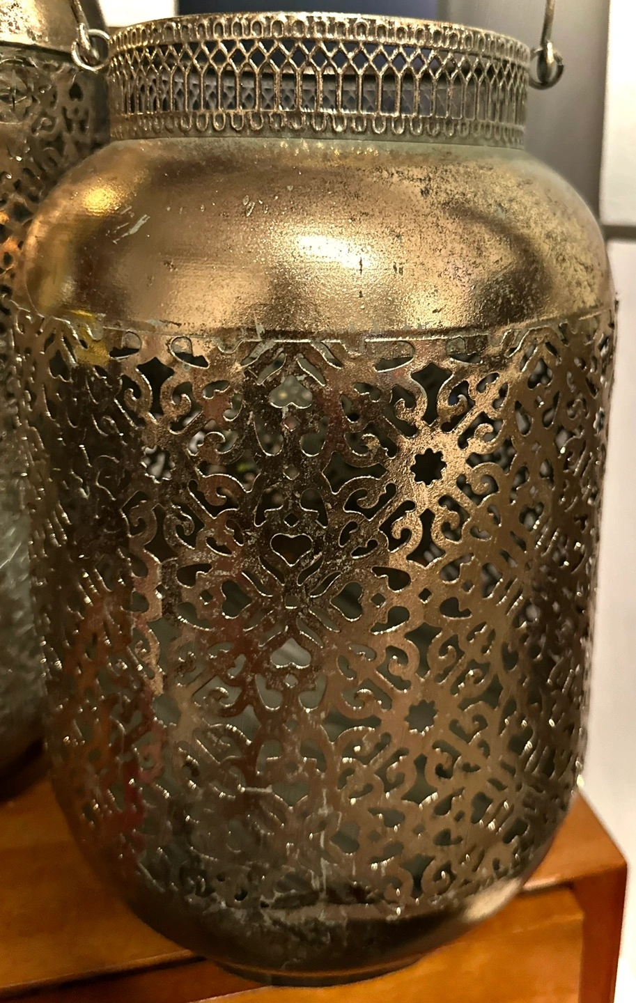 Inspired by the mystery and romance of far away places, this 2 piece Moroccan metal lantern set offers practical features and intricate paisley embossing and perforated dot detailing that lets beautiful candle light shine through. Made by hand. Crafted of metal with a whisper of white patina, these tall golden lanterns feature swing latches, hinges, and elegant cylinder shaped body that is comprised of intricately detailed lattice work. Well sized, each piece in the set measures as follows: 10.25 D x 17.75 H inches, 3.25 lbs. and 7.75 D x 13 H inches, 1.5 lbs. Create amazing ambiance at home by casting shadows and light from the flickering glow of candles placed within. Easy to store. When not in use, these candle lanterns can be placed inside each other for convenient storage. While ideal for outdoor use in the garden or on the deck, we do not suggest that they stay outside during inclement weather. Always a welcome gift.