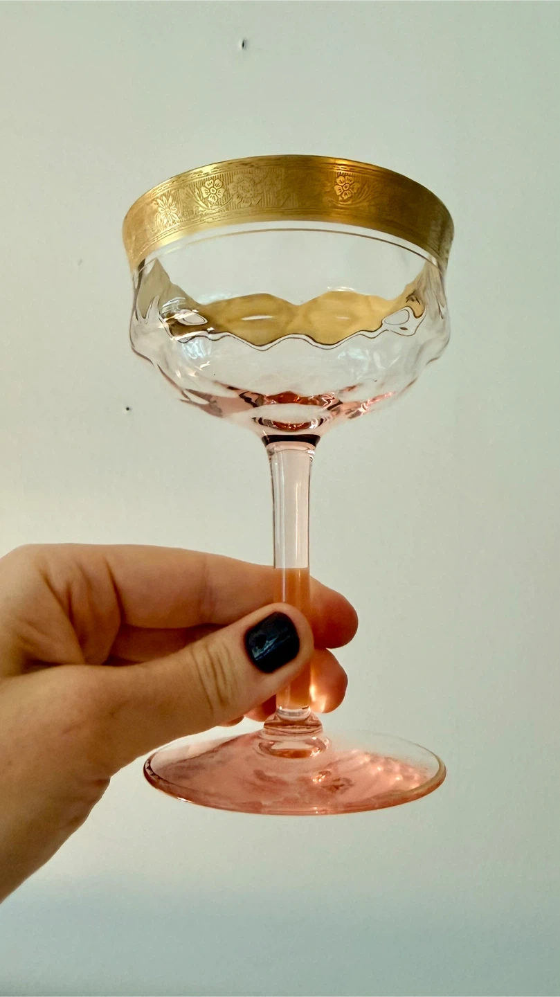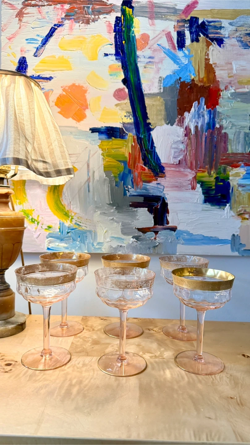60Selling a set of six vintage pink champagne glasses! These glasses have a delicate pink hue and a gold rim, perfect for adding a touch of elegance to any occasion. They're in great condition and ready to be enjoyed