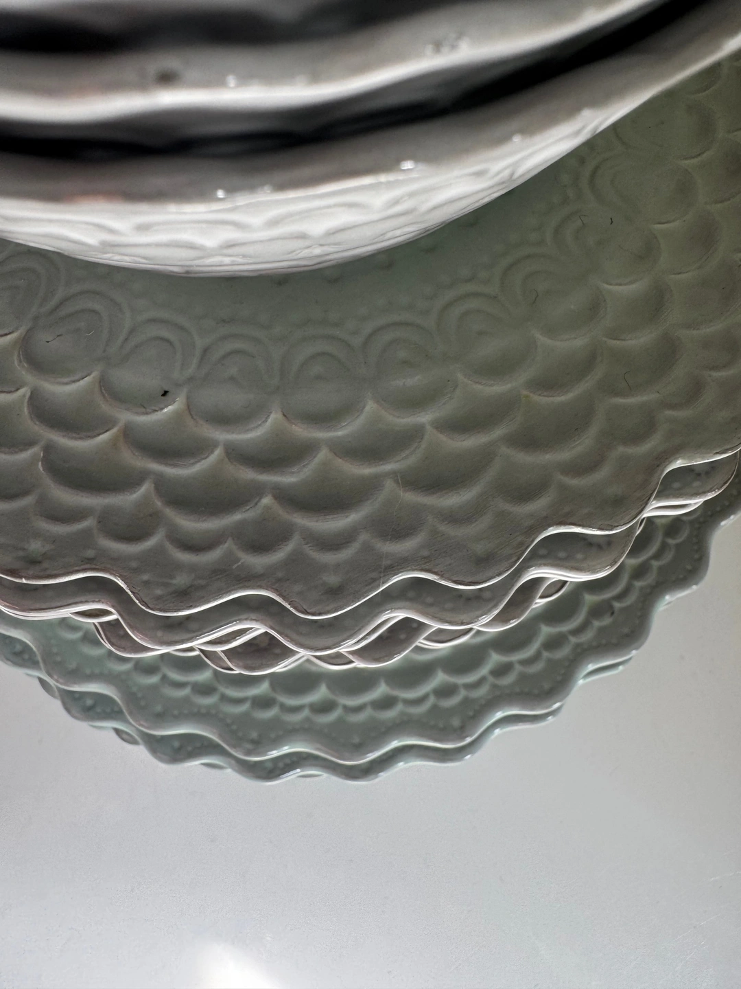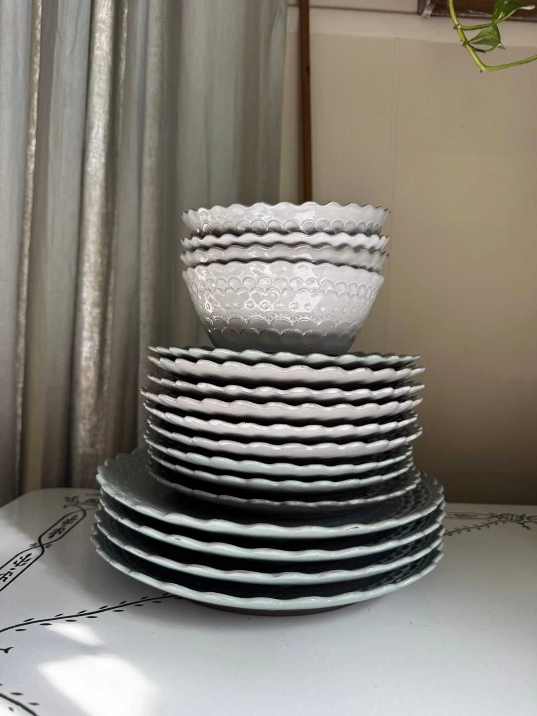 5Set of coordinating dish ware. Grey and light green plates and bowls. Bought at Anthropologie years ago and have been well used. A few small chips here and there. All pieces have a beautiful lace like pattern and soft glaze. Some pieces are grey, some are light blue/green. x4 Bowls x4 Dinner Plates x9 Salad Plates